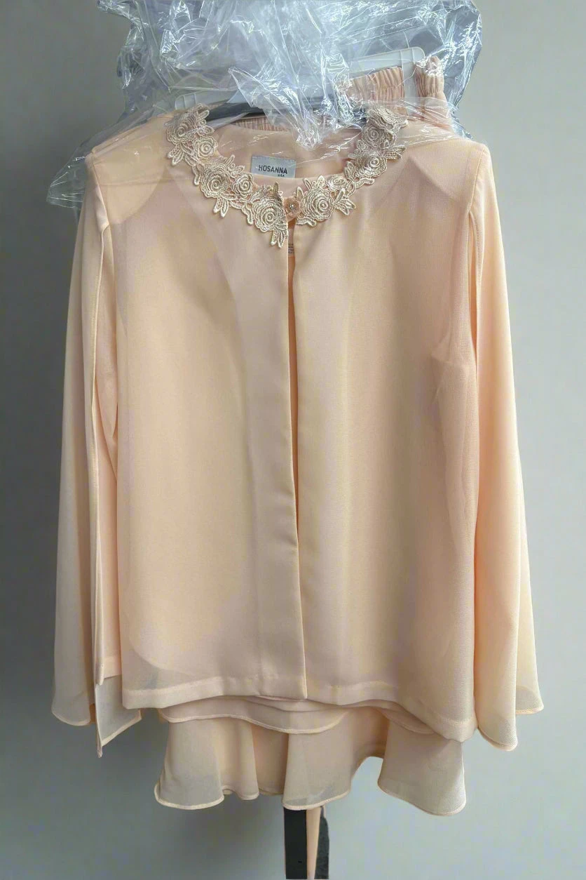 Stay modesty and classy in this plus size ankle length semi formal dress by Hosanna Design 5579 for your next special occasion! Made in chiffon, this 3-piece set features a sleeveless wide strap top, tea length skirt and a long sleeve jacket with small stones ascending across the bodice.