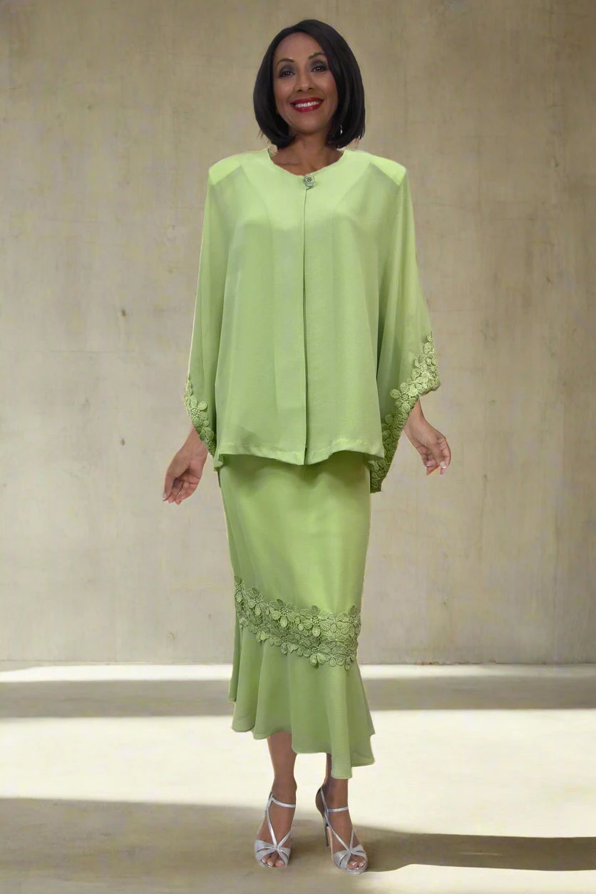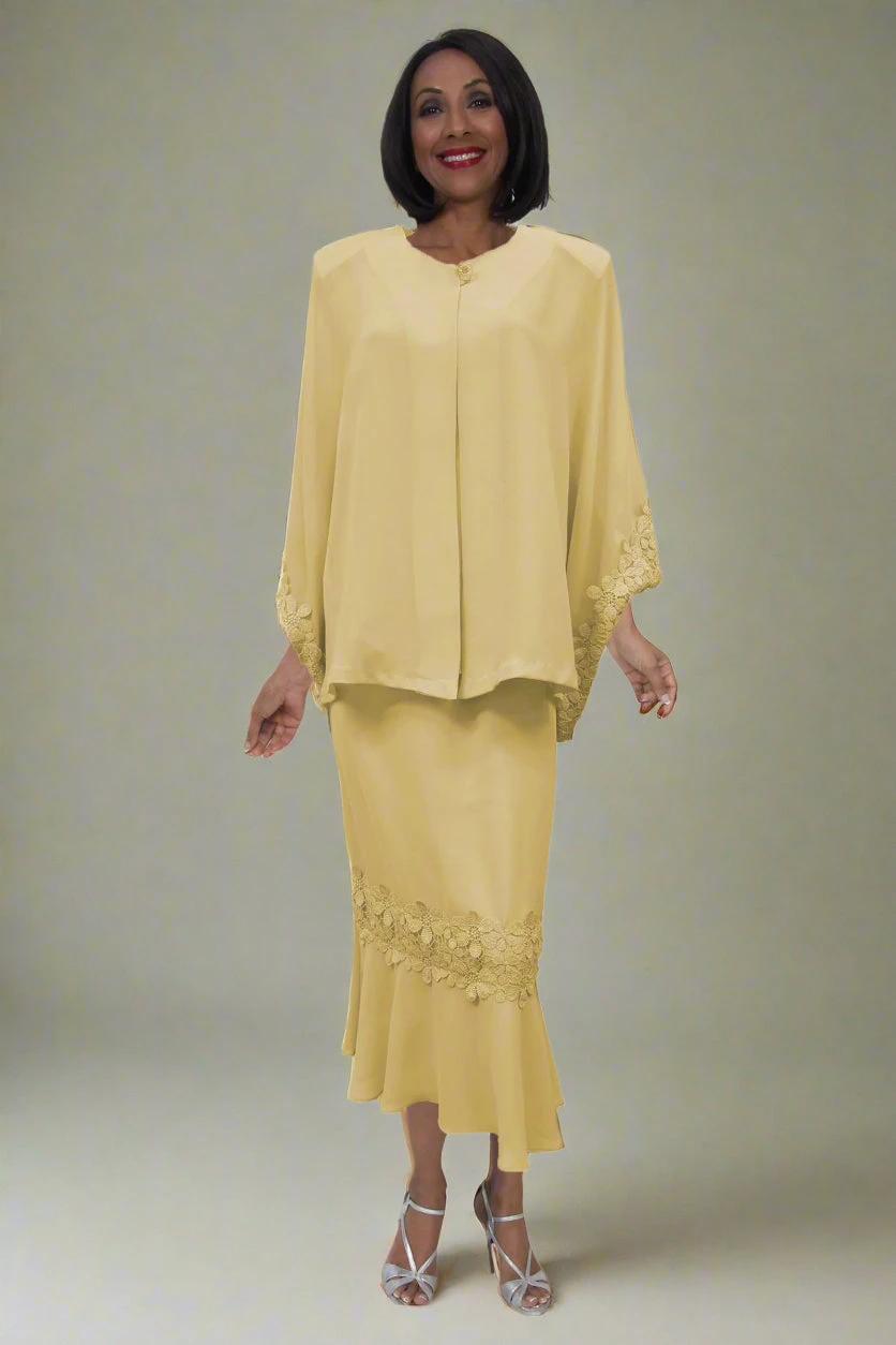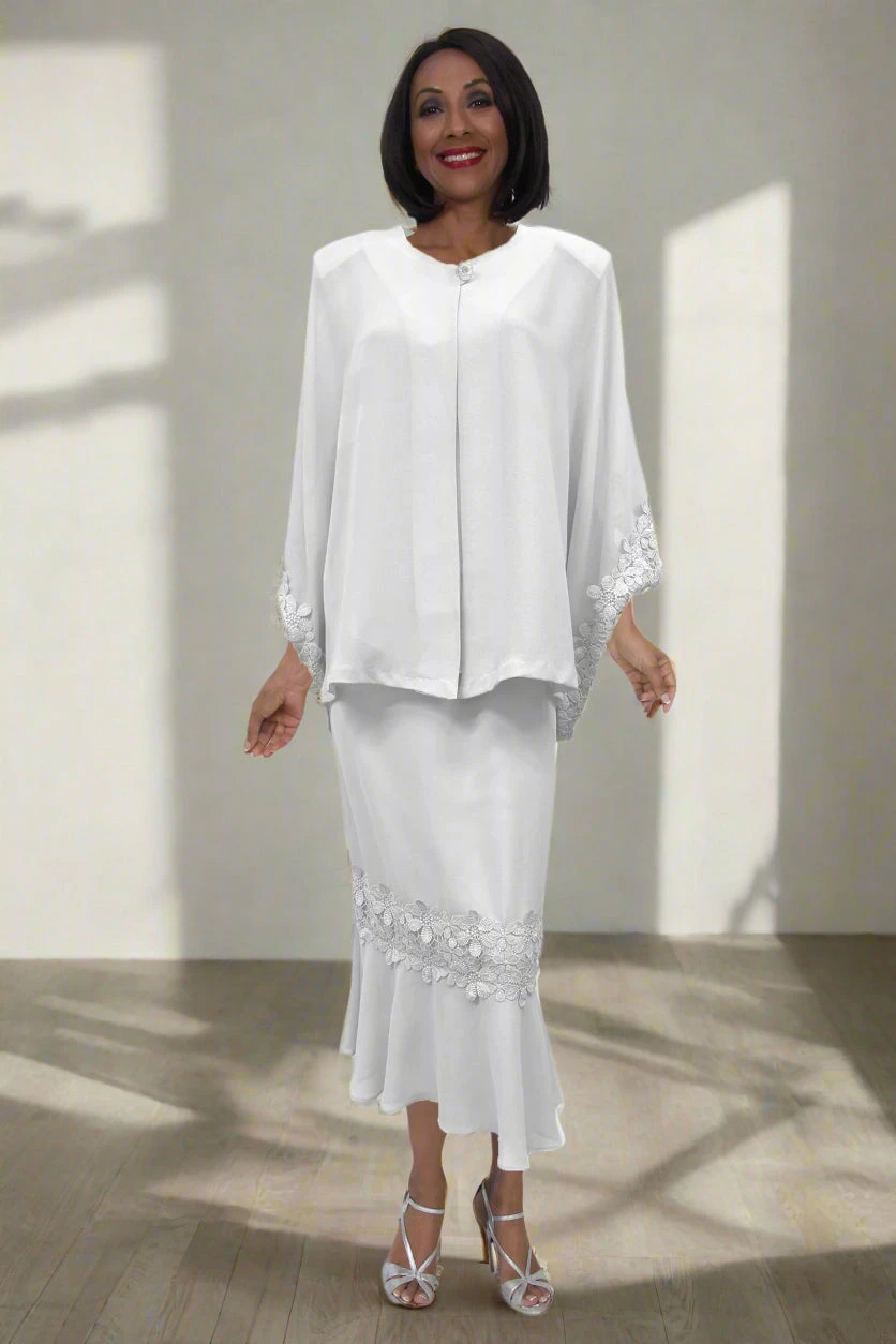 If modesty and classy is important, then you’ll love this plus size 3-piece dress by Hosanna Design 5582 for your next special occasion! This 3-piece set includes a sleeveless top and tea length skirt and a long sleeve jacket