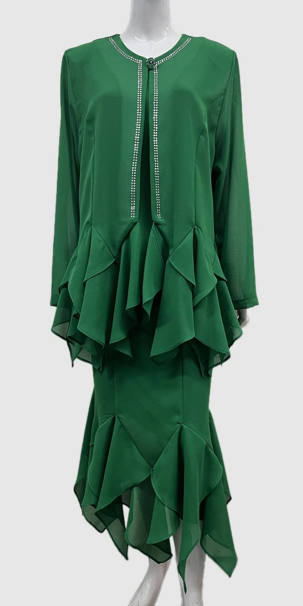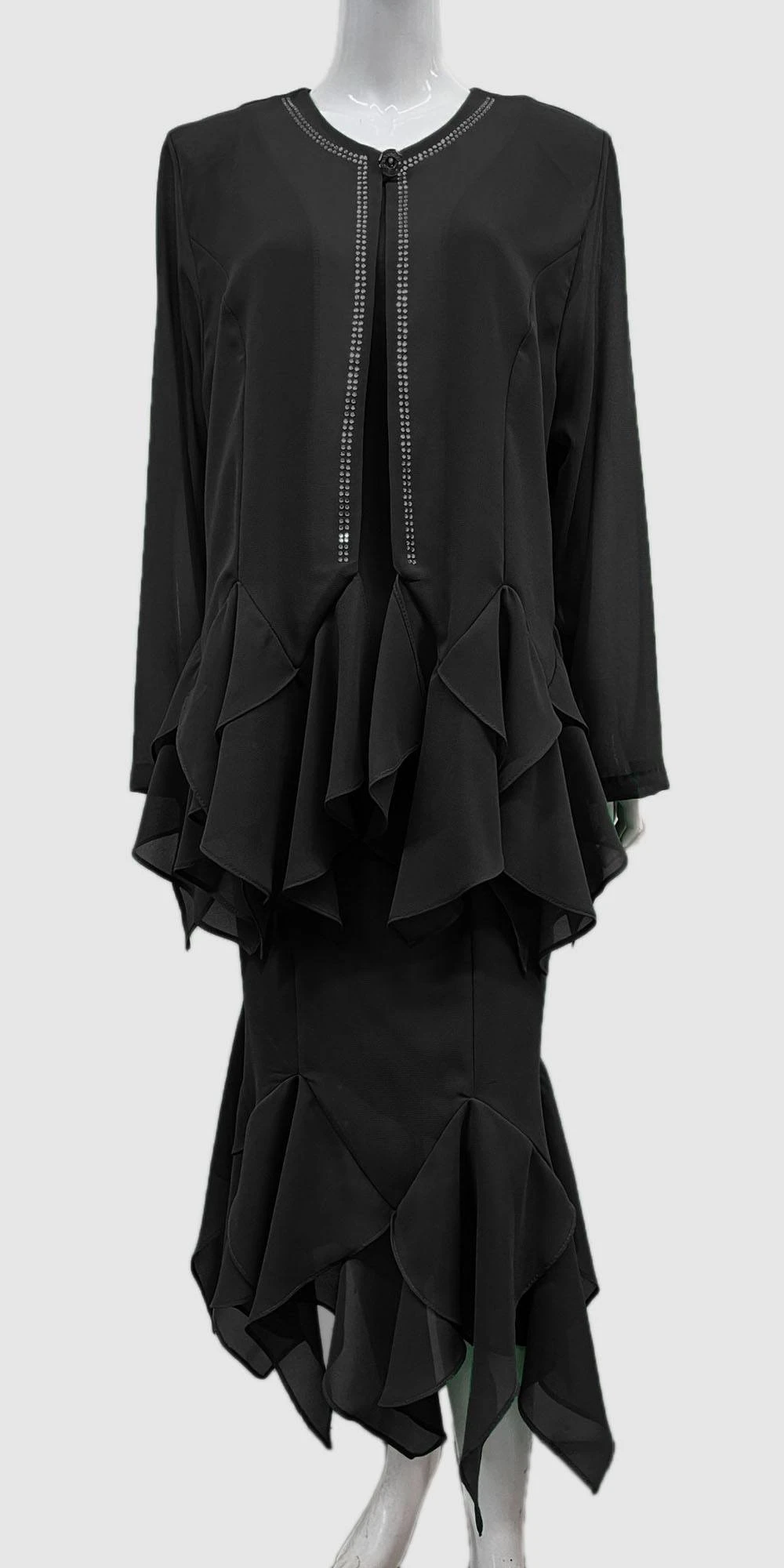 This 3-piece dress set from Hosanna Design 5506 features a tea length hemline with an asymmetrical style, a modest sleeveless top, and a ruffle hem on the jacket and skirt. Further enhanced with embellishments of rhinestones, this ensemble is perfect for any special occasion and proudly made in the USA.