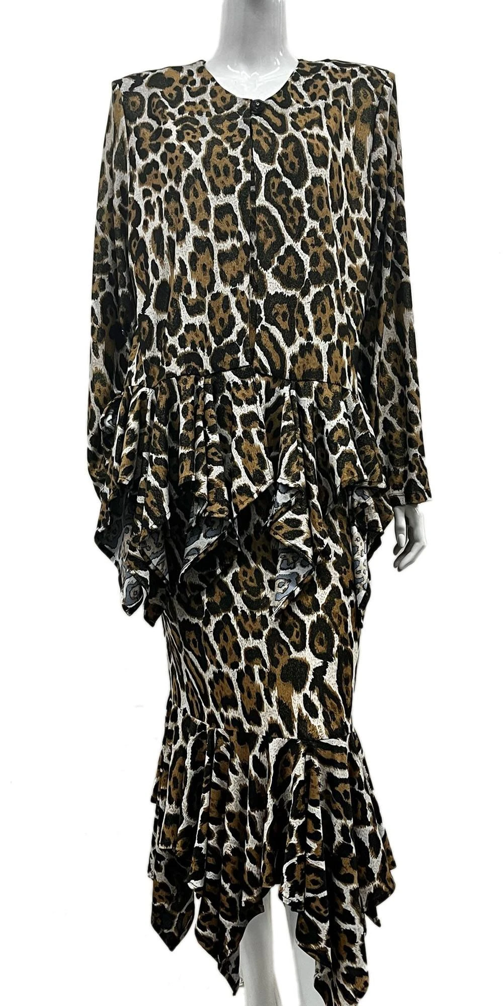 This 3-piece dress set by Hosanna Design 5512 is elegant yet modest. The tea-length leopard print long sleeve jacket features an asymmetrical hemline and ruffled hem for a timeless look. Plus size with an elastic waistband for secure and comfortable fit. Perfect for any occasion and proudly made in the USA.