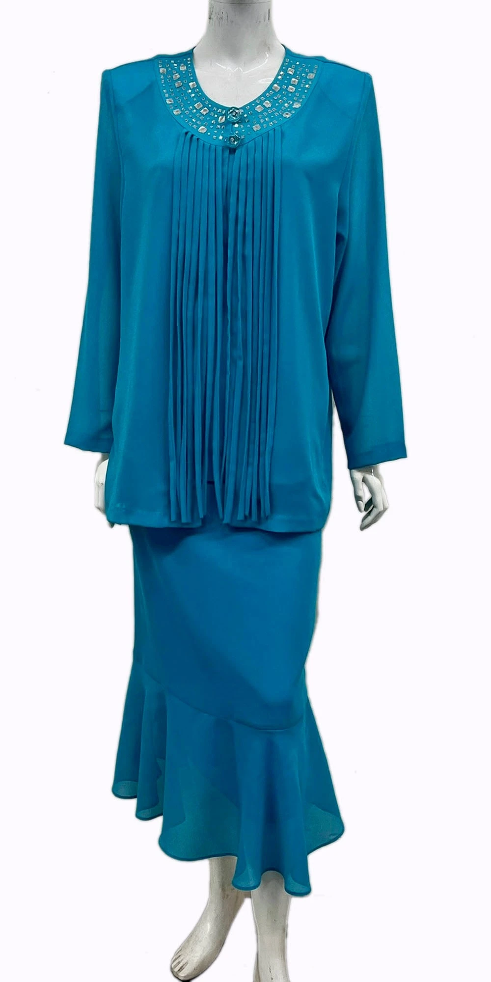 This 3-piece dress set by Hosanna Design 5536 offers a modest, tea length option for special occasions. The set includes a long sleeve jacket, a sleeveless top, and a skirt underlay for a complete and polished look.Â