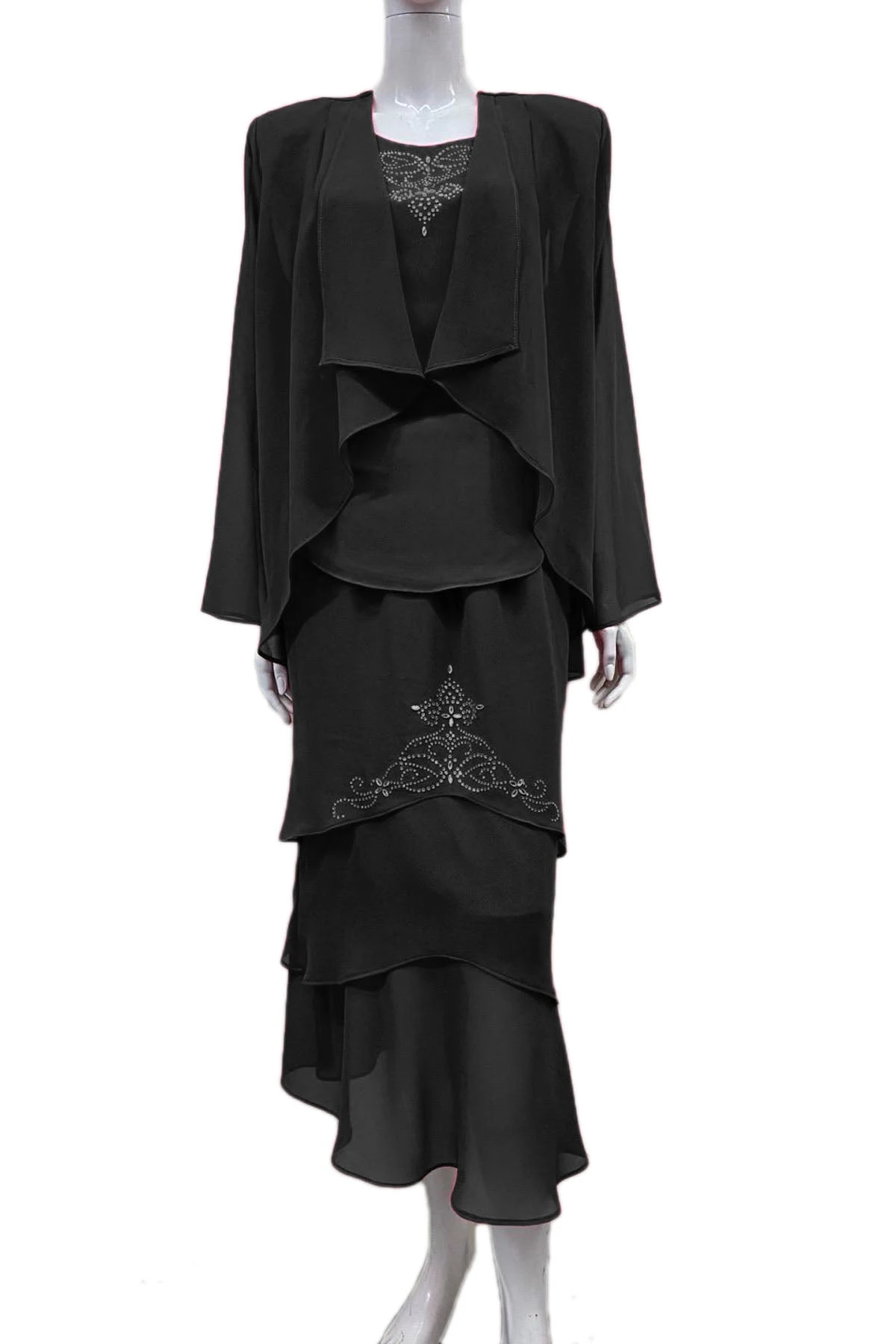 The Hosanna Design 5552 3-piece dress set offers both fashion and comfort. The set includes a long-sleeved jacket, an asymmetrical skirt with an elastic waistband, and a sleeveless top adorned with embellishments. This stunning set is not only stylish but also made in the USA. Elevate your wardrobe with this modest yet fashionable dress set.