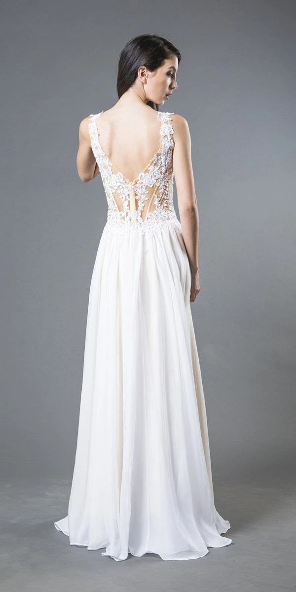 Enjoy the evening with this fabulous long formal dress by J&J Fashion USA 104. With sheer bodice, v-neckline adorned with appliques all through the deep v-shape back with zipper closure. The delicate chiffon skirt is lined with champagne color sateen fabric and it has a thigh-high slit. Lovely dress for a wedding, for prom, for gala, for red carpet events or any other formal occasions.