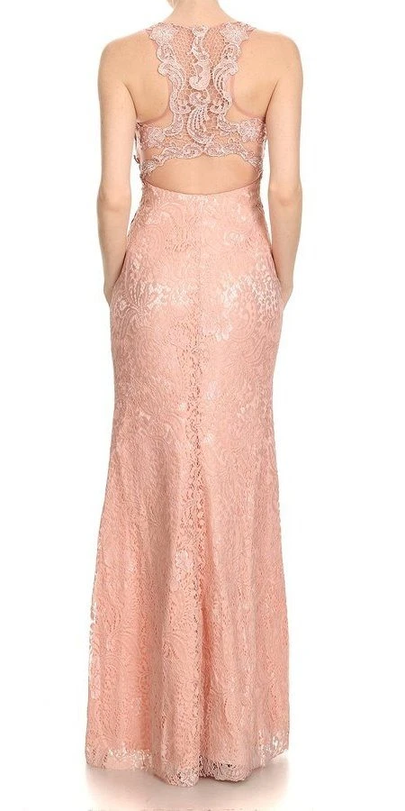 Stand out and shine with this exquisite long designer dress by J&J Fashion USA 3033. The lace appliques highlighted the shoulder straps, round neckline the perfect curve and the racer cut-out back. This fit and flare made of lace formal dress is an enchanting outfit for wedding events, red carpet, gala, awards night or any other special celebrations.