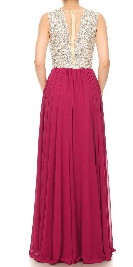 Enjoy the evening in this elegant a-line silhouette long formal dress by J&J Fashion USA 3062. The a-line skirt made of chiffon fabric is paired with rhinestone embellished bodice that has a plunging v-neck and back with sheer inset. This sleeveless gown is a gorgeous outfit for military or marine ball, wedding events or any other formal occasions.
