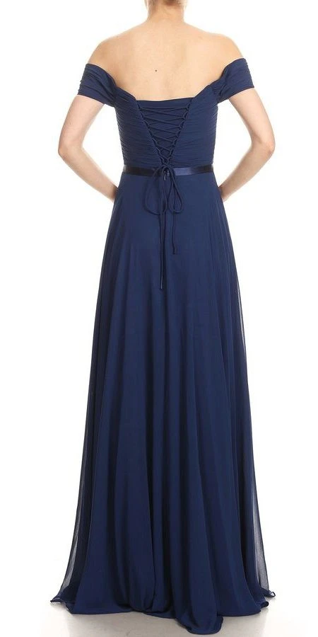 Enjoy the evening wearing this floor-length a-line silhouette dress by J&J Fashion USA 3070. This trendy off-shoulder style has ruched twisted bodice accented with satin band that emphasize the natural waist and a corset lace-up to make sure it will perfectly fits.Â