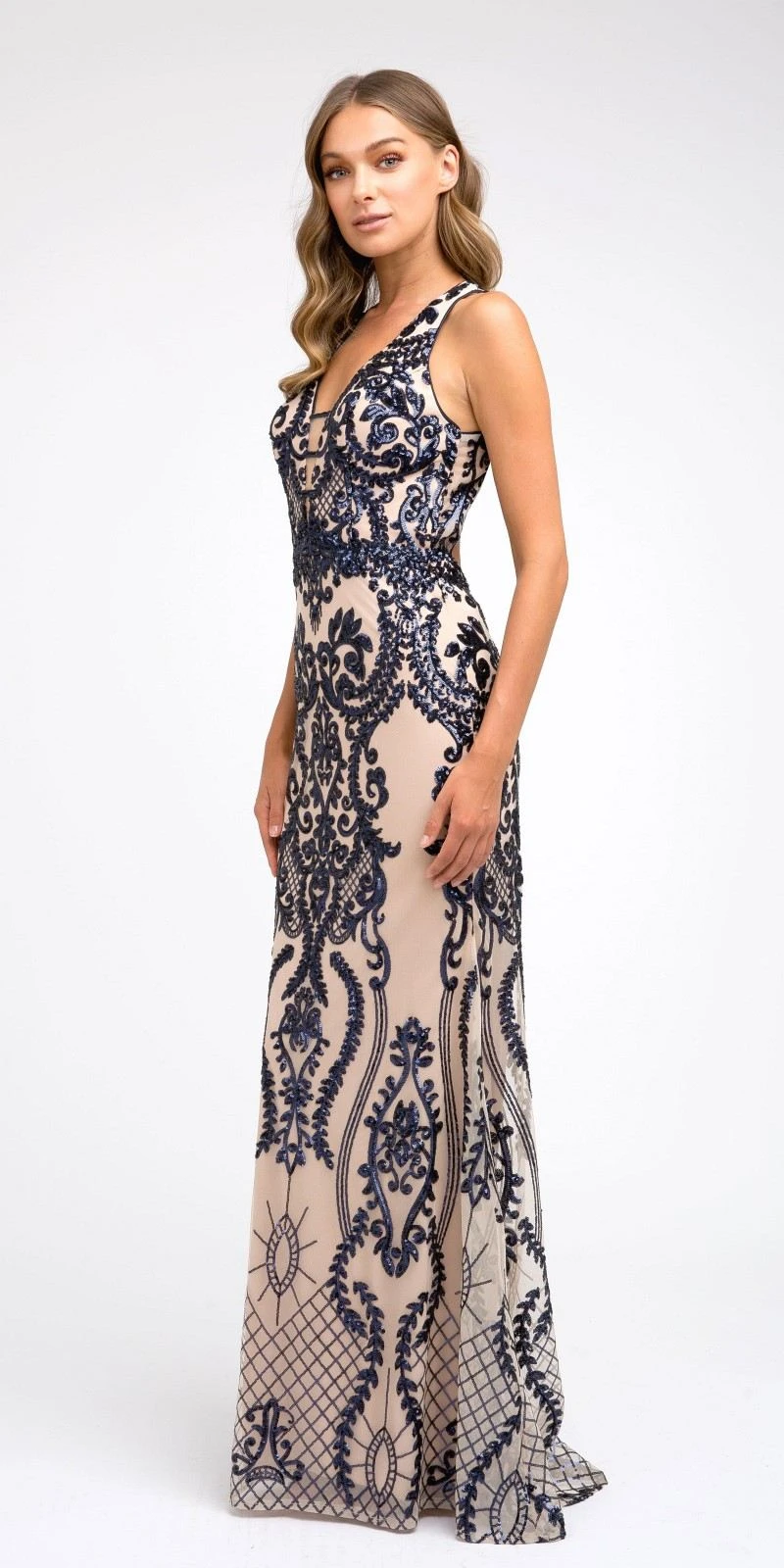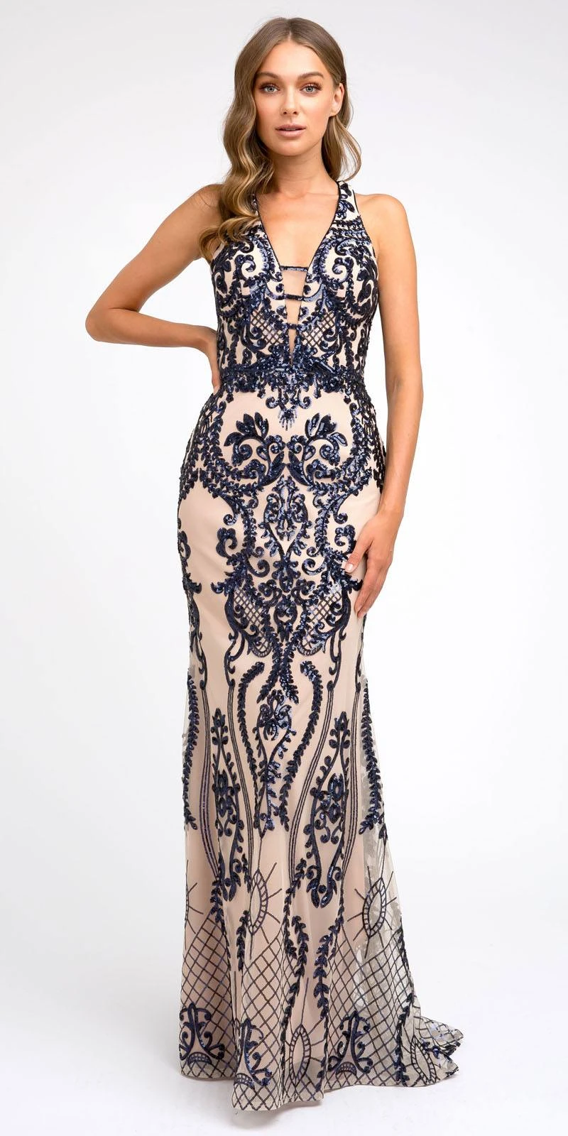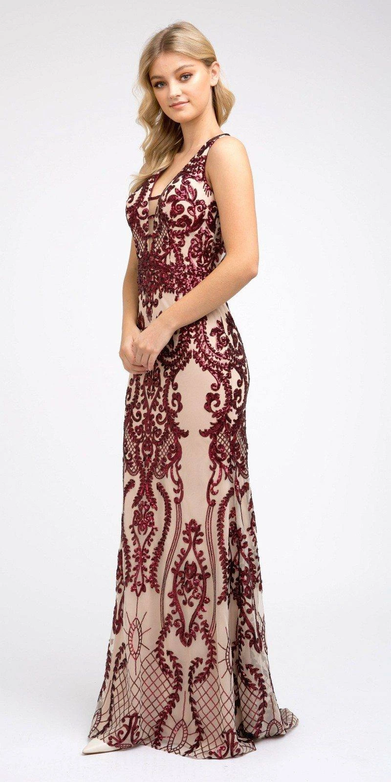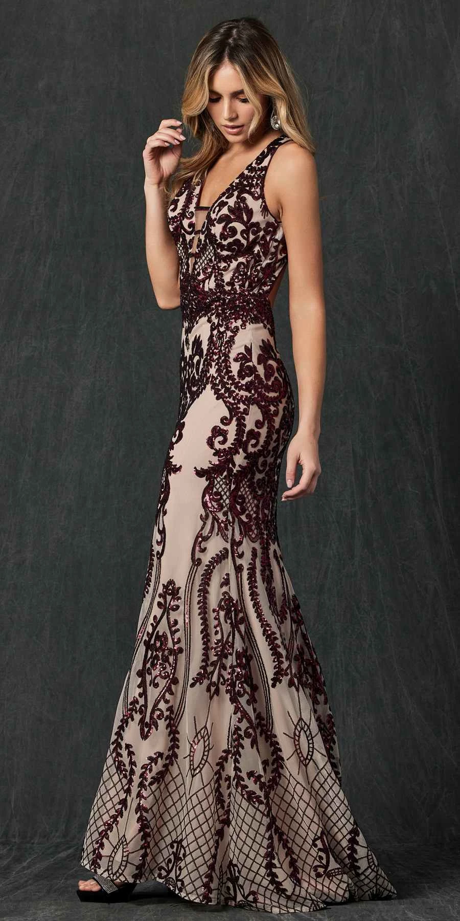 This sleeveless long formal dress by Juliet 243 is green a fabulous outfit for any formal events. Decorated with magnificent designs of sequins and lined with comfy fabric, this column silhouette gown features a seductive v-neckline and cut-out open back. Definitely stunning dress for prom, red carpet events, pageant or in any other special occasions! Â