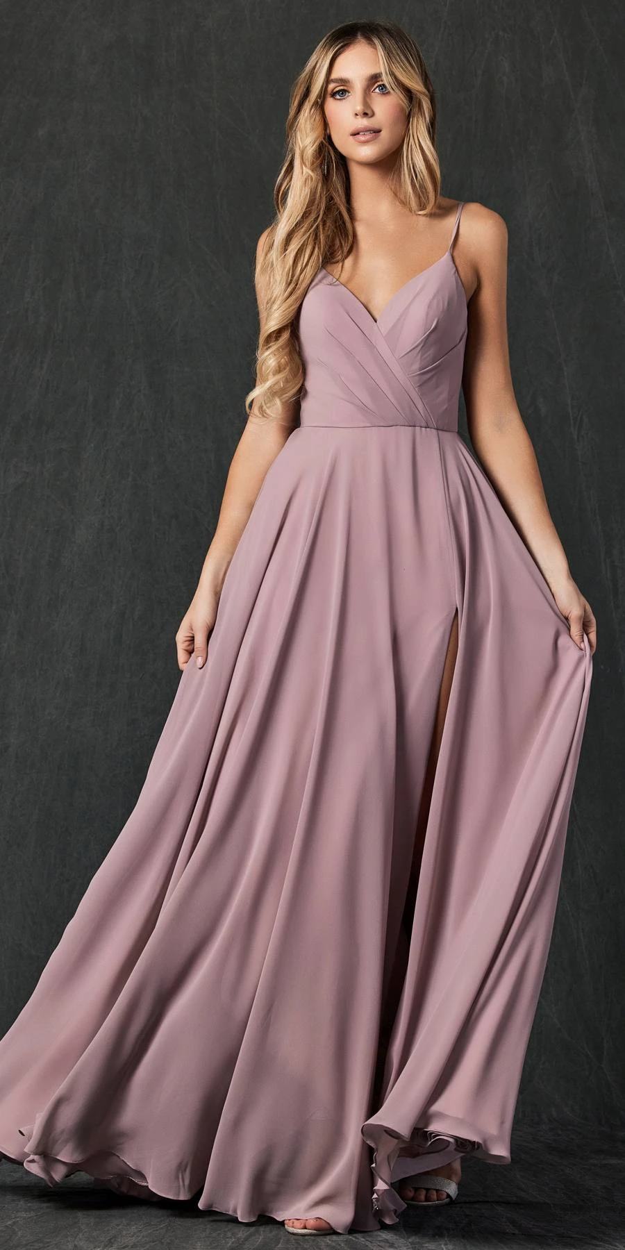 Imagine yourself wearing this beautiful formal gown by Juliet 263. This long chiffon A-line dress features a pleated bodice, front leg slit and corset lace up back. An ideal full-length dress for red carpet events, pageant, prom or in any other formal occasions!Â