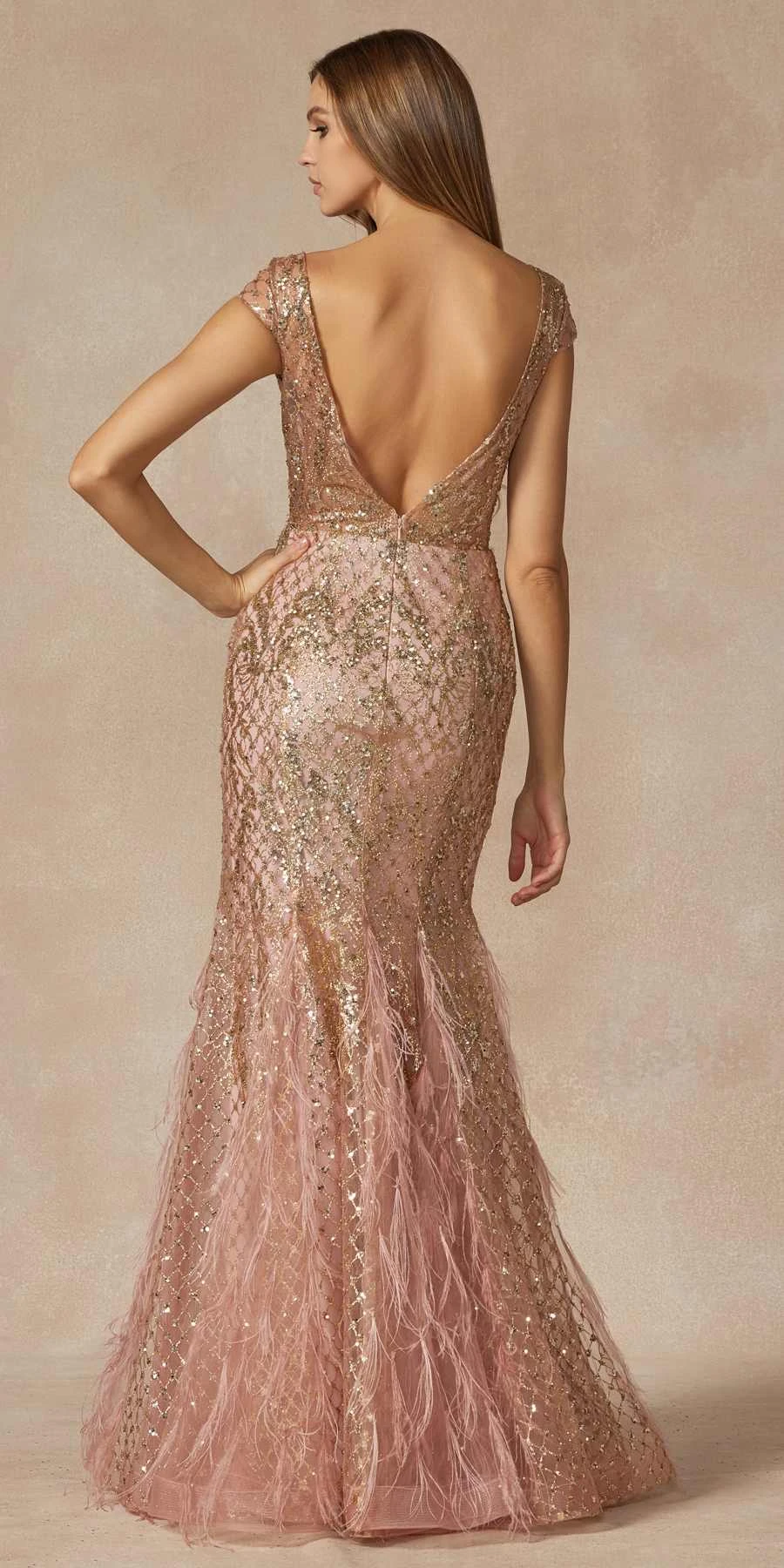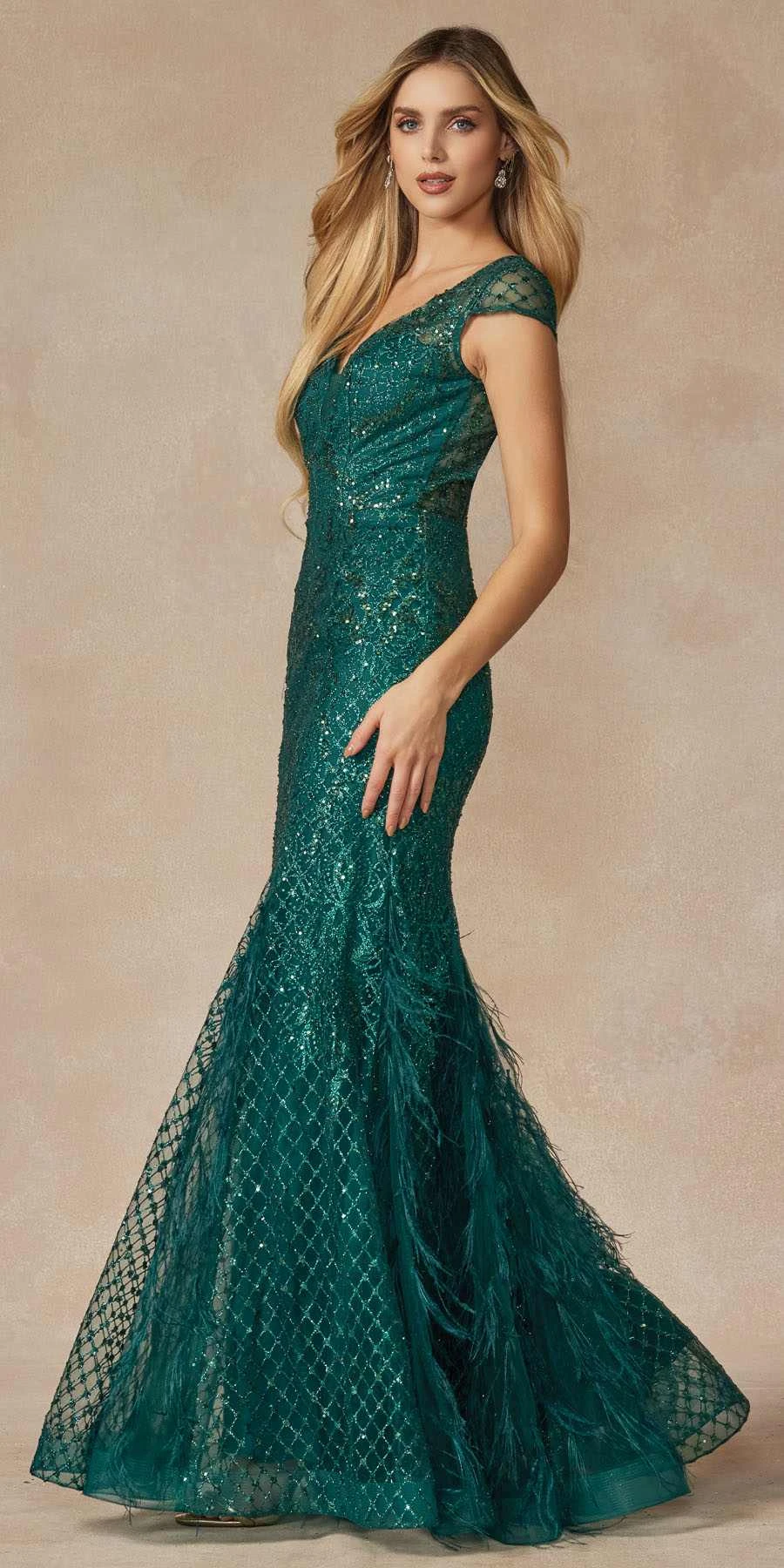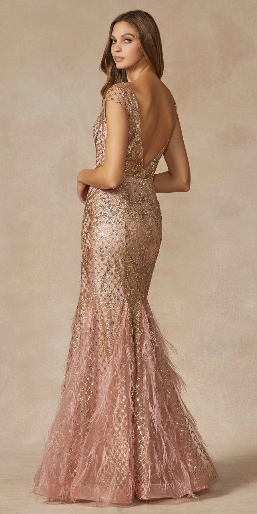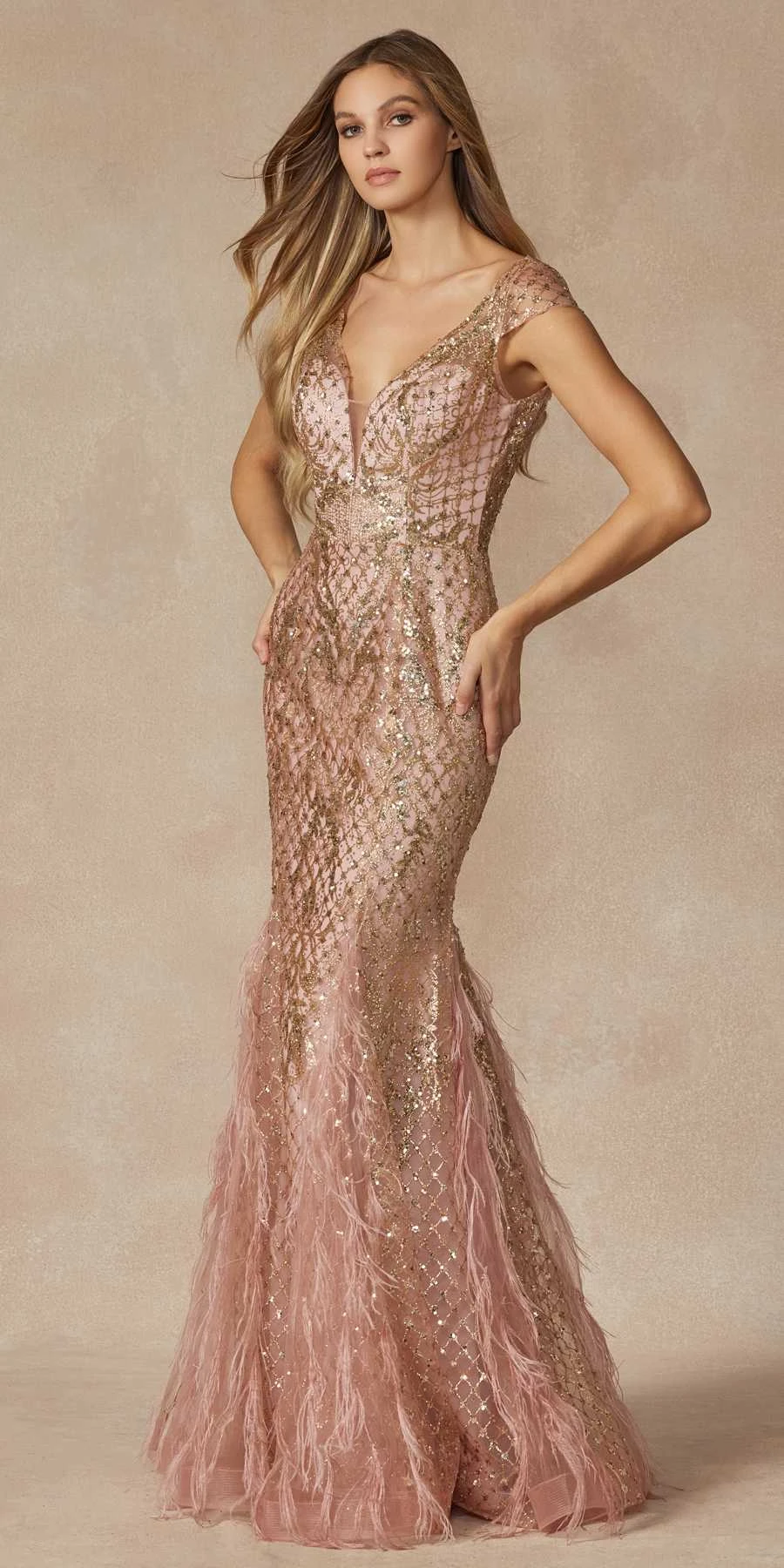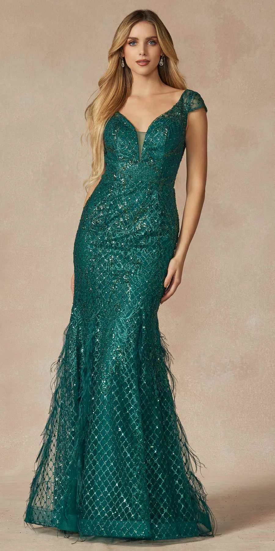 Dazzle the evening in this beautiful floor length sleeveless mermaid dress by Juliet 286. This long fitted glitter embellished gown has a plunging V-neckline with sheer insert panel and cap sleeve. It features a feathered skirt, glitter and sequin embellishments and a V-back. A beautiful dress for formals,Β gala party, prom or any special occasion!
