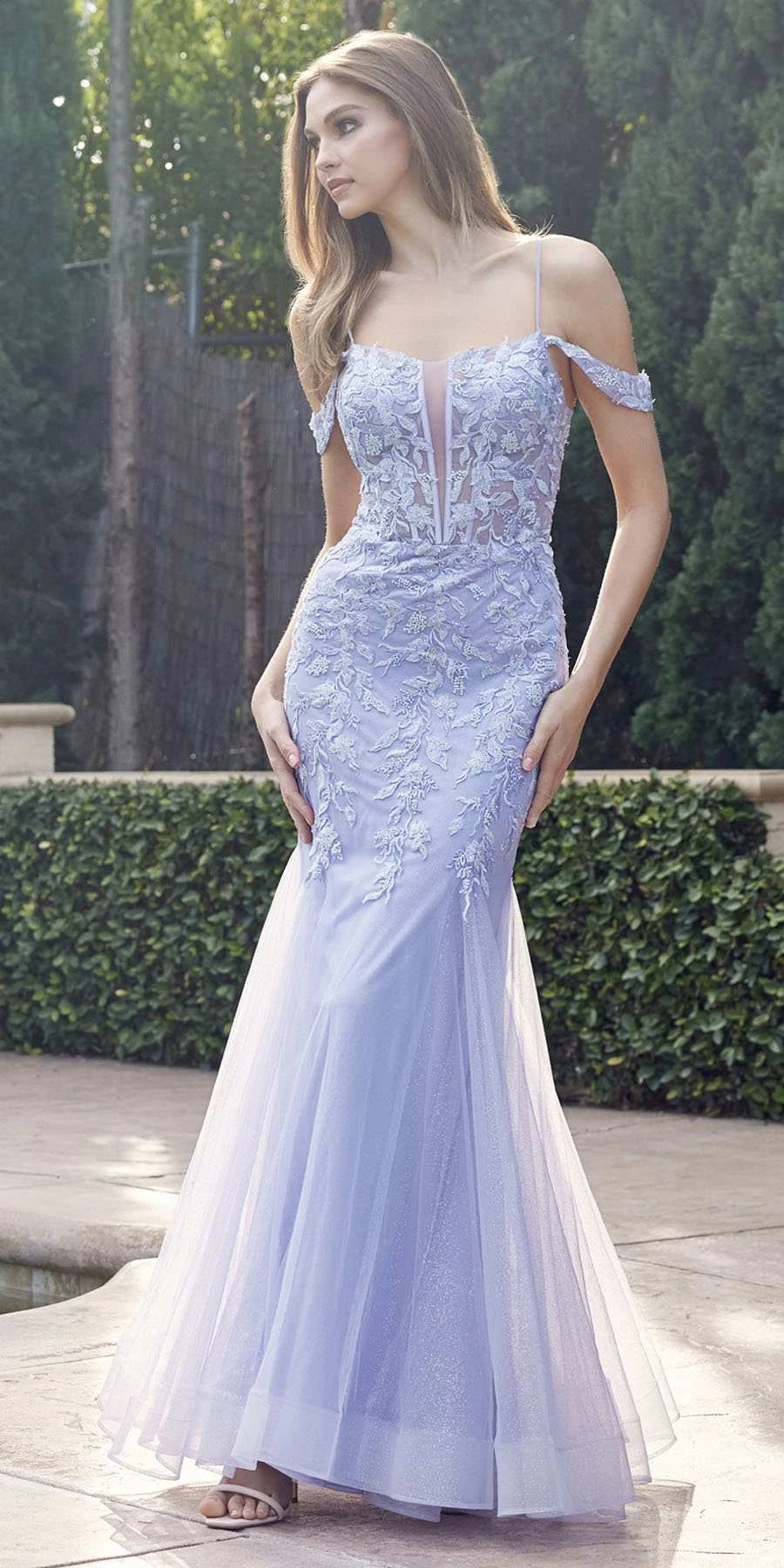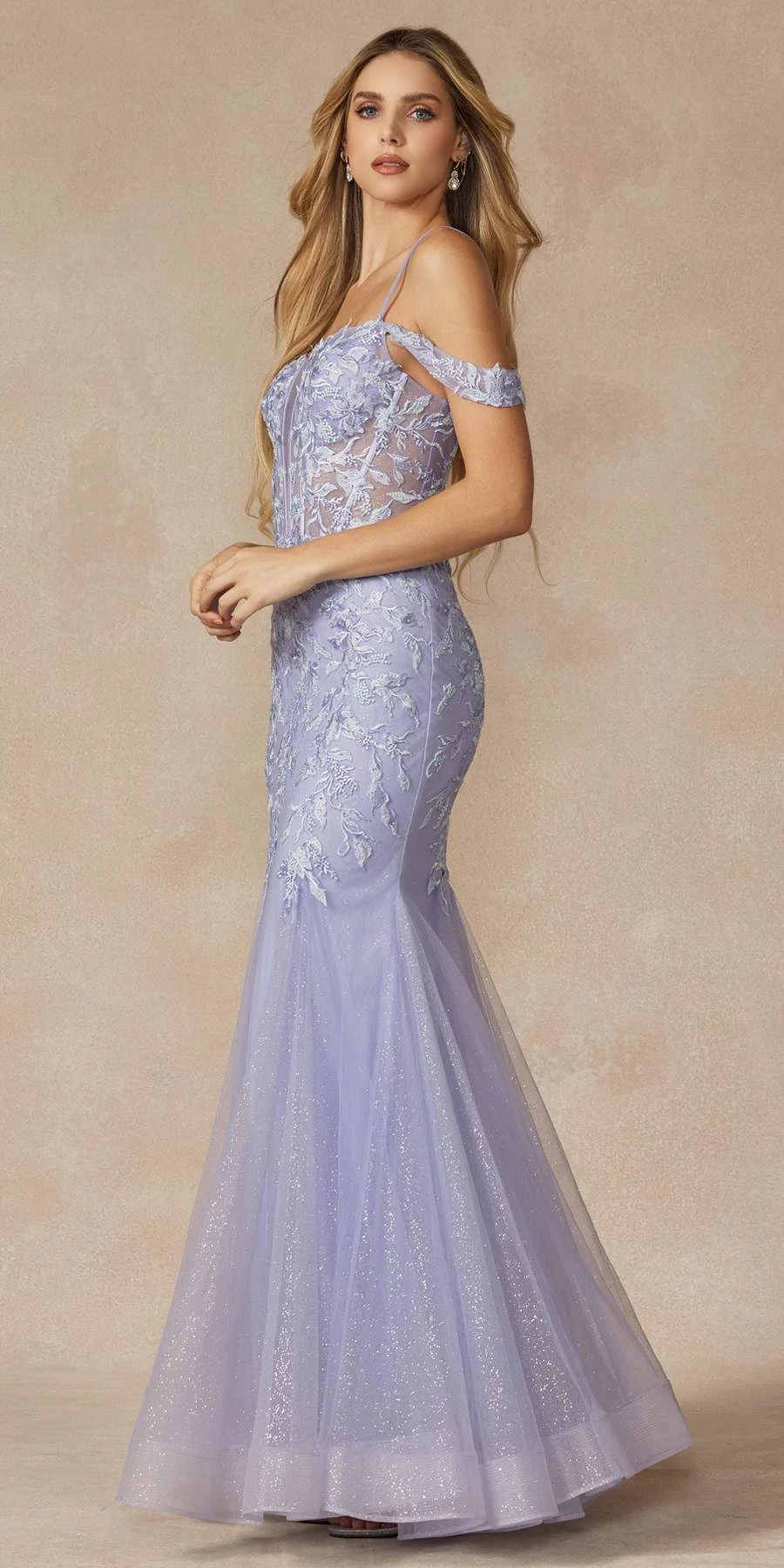 Dazzle the evening in this beautiful floor length fitted dress by Juliet 290. This long mermaid glitter tulle mermaid gown has a plunging sheer panel insert V-neckline with cold off the shoulder straps and features an embroidered floral pattern and corset lace up tie back. A beautiful dress for formals, gala party, prom or any special occasion!