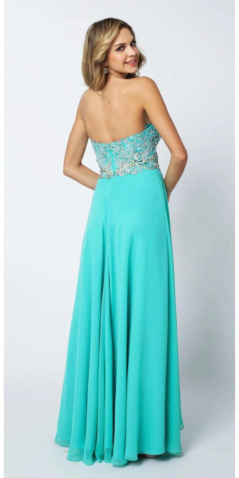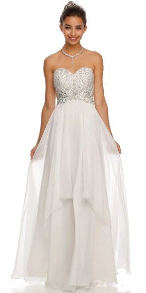 You will surely make an impression about your ravishing dressing sense by wearing this beautiful A-line dress for a prom party. Designed with an asymmetrical skirt featuring a layered look, this floor-length dress features a fitted bodice to form an appealing contrast to the flowing skirt. This strapless dress comes designed with a sweetheart neckline that shapes the bodice, while crystal embroidery and rhinestones reaching up to the natural waistline enhance the overall look of this long dress.
