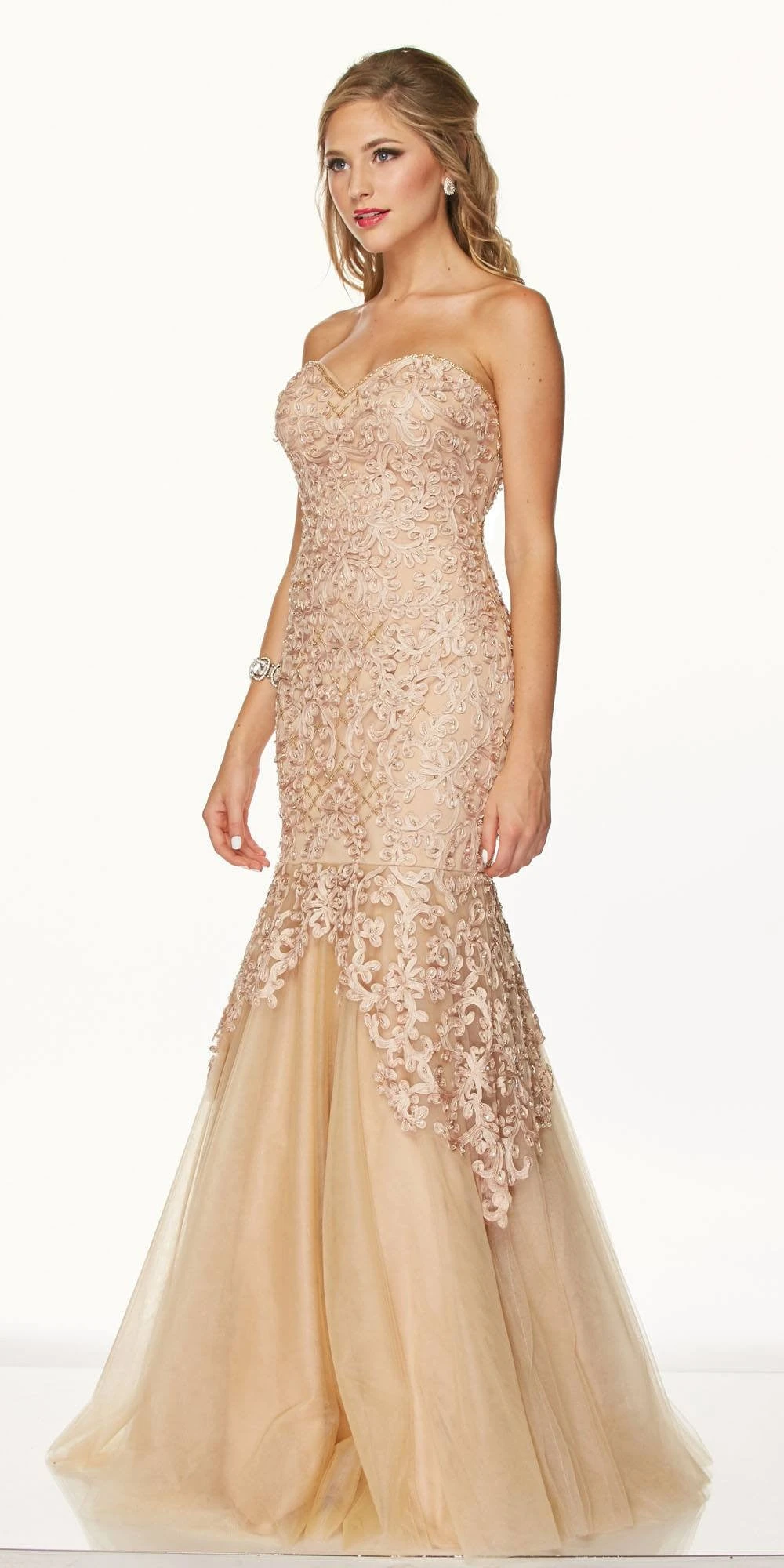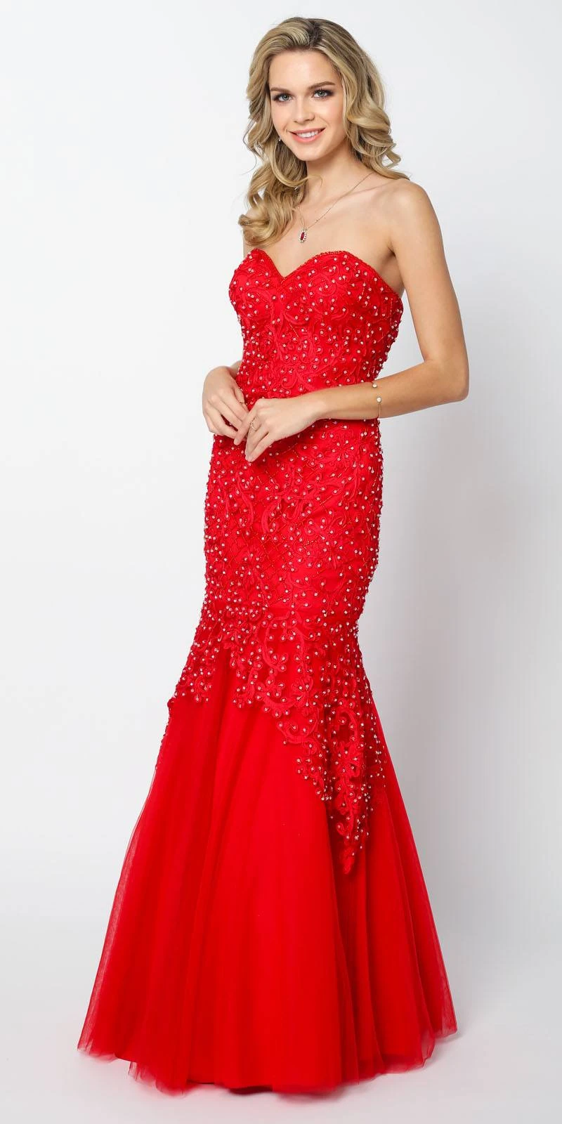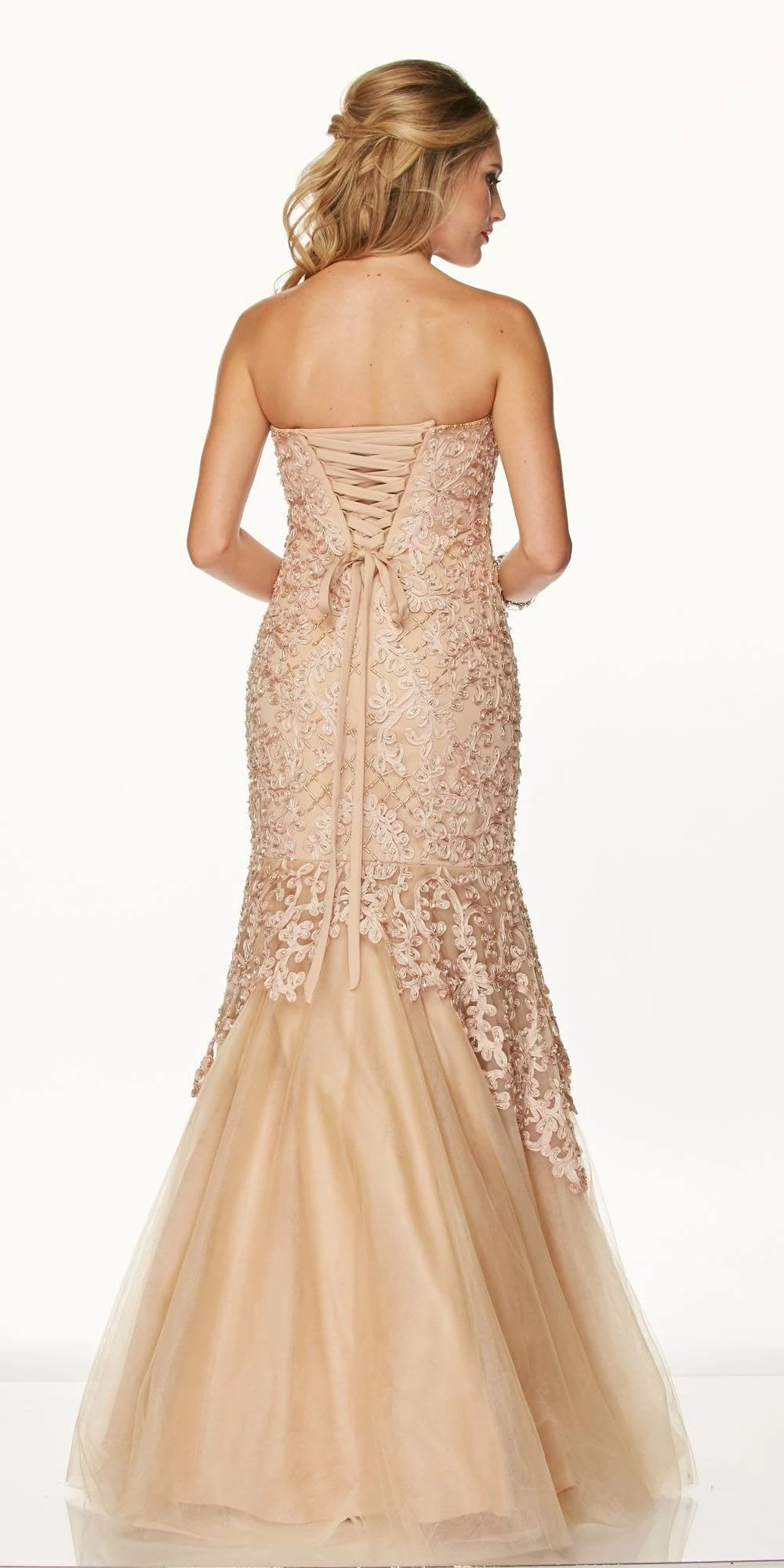 Imagine yourself in this fabulous fitted full length prom gown. Made with applique and organza, this strapless mermaid style dress has a sweetheart neckline embellished bodice and corset lace-up back.