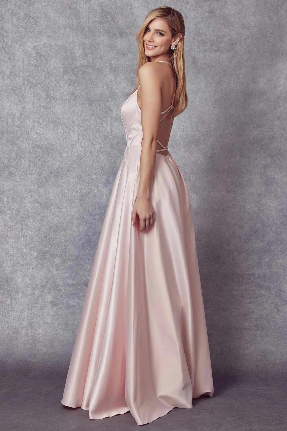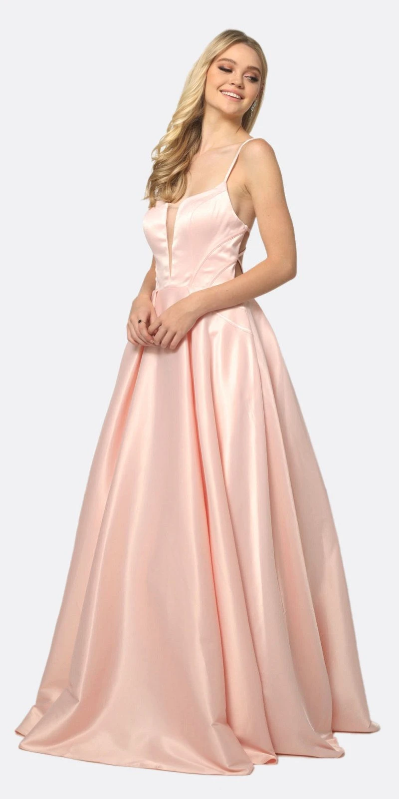 Enjoy the evening in this gorgeous floor length A-line gown by Juliet 687, which features a plunging V-neckline with an illusion sheer insert, spaghetti straps, side pockets and open criss-cross back. A beautiful long A-line dress for prom, red carpet or any special occasion!