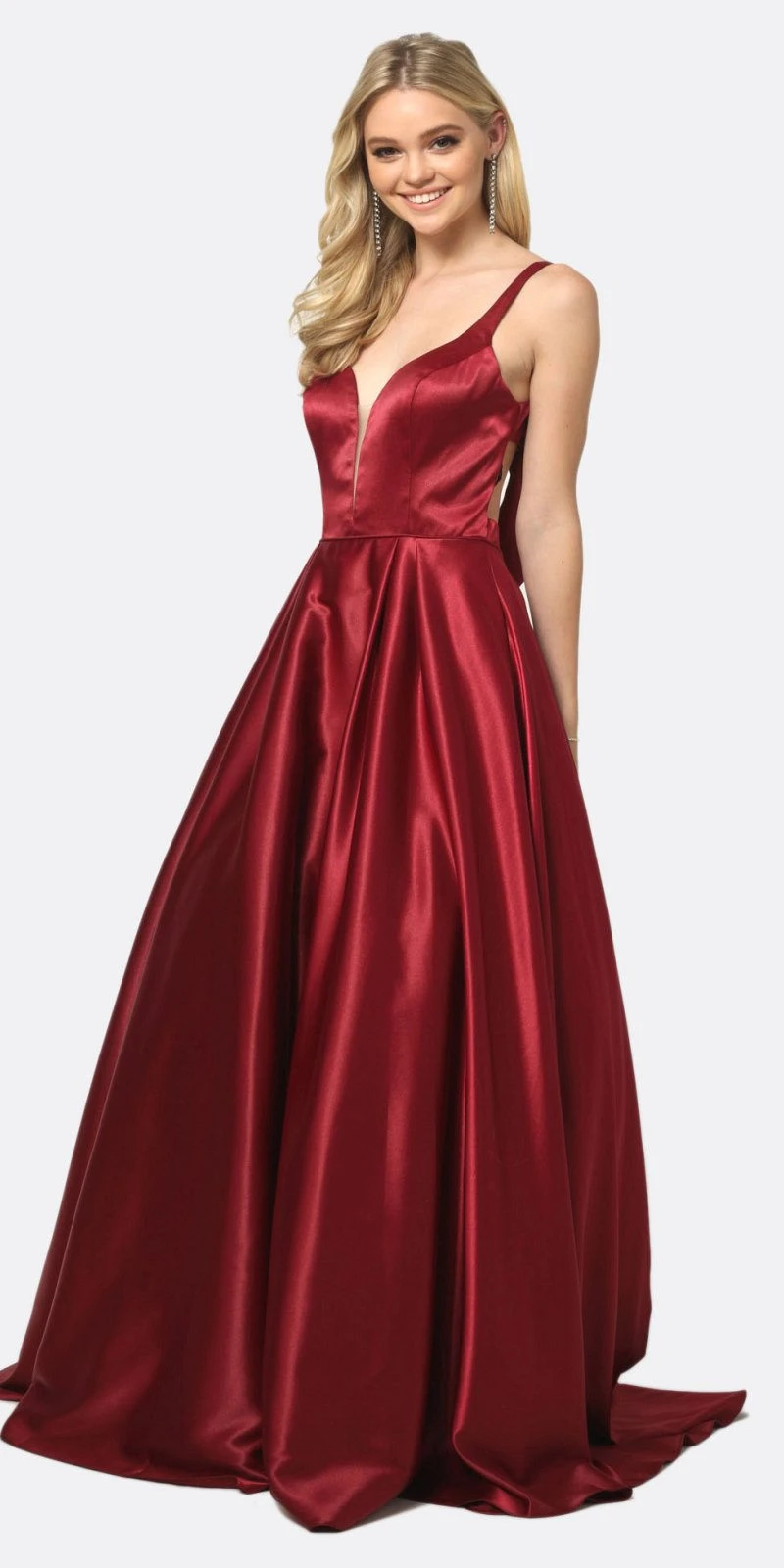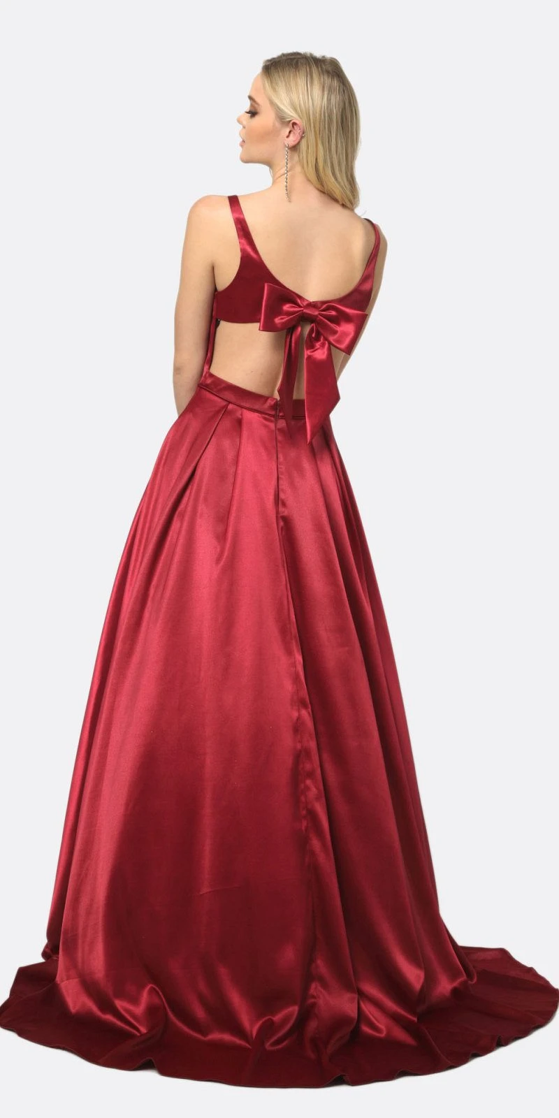 Imagine yourself in this amazing A-line ball gown by Juliet 691, which features an open cut-out back with bow, sweetheart bodice with sheer-inset, pleated ball skirt with pockets. This made of sleek satin floor-length dress is a stunning outfit for prom, red carpet events, gala dinner party or in any other special celebrations!