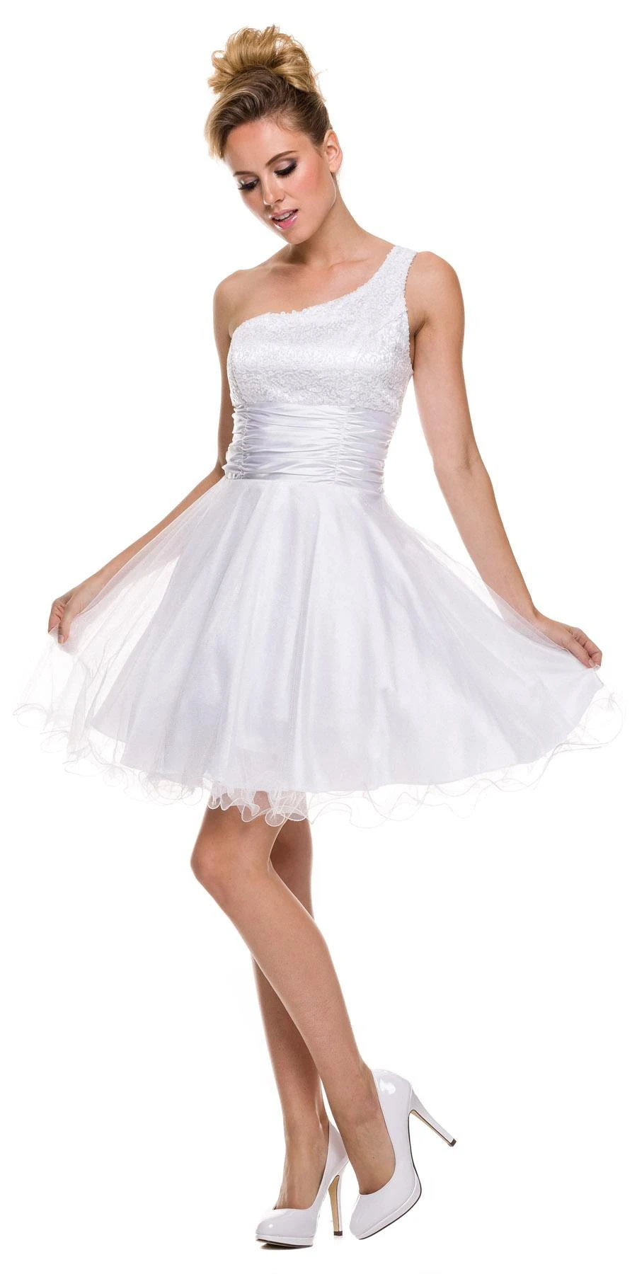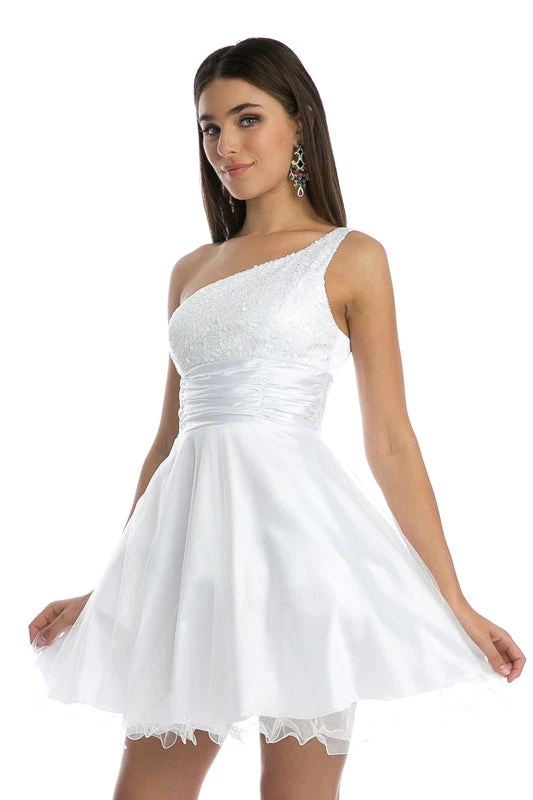 This cute short, above knee, one shoulder dress by Juliet 733 features sparkly sequins on bust, a gathered waist and glittery tulle A-line skirt.