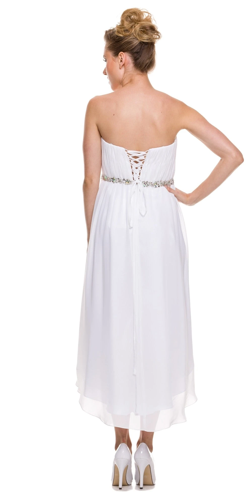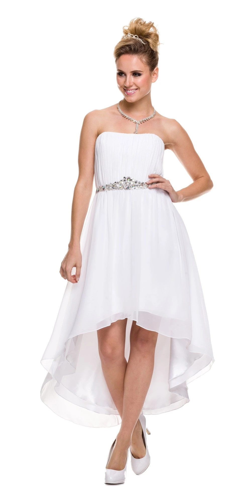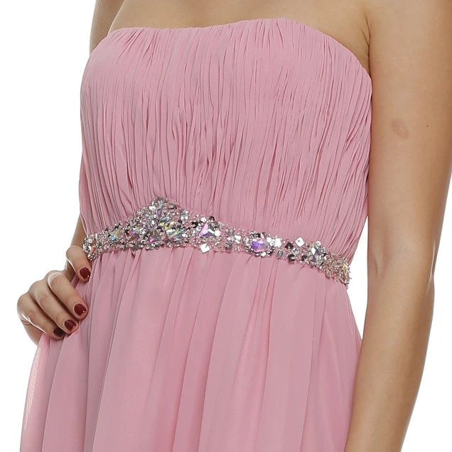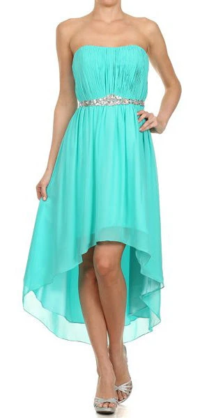 This high low dress is flushed with understated elegance, which makes it perfect for any homecomings, bridesmaids or special dinner outings. This strapless attire exhibits asymmetrical hems that reach up to knee-length and are highlighted with a layered design. A straight neckline shapes a corset bodice that features a lace up tie back and an attractive ruched pattern. A studded arrangement of rhinestones define the natural waistline and lead to a flared A-line skirt for added beauty.