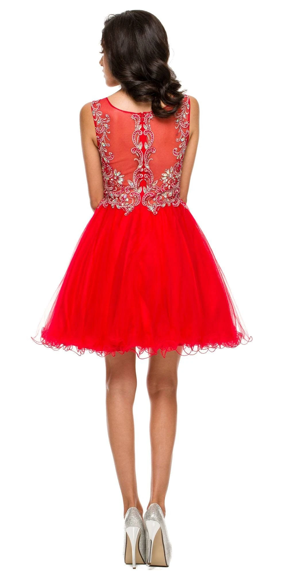 Dress up in this beautiful short gown. Made with tulle, this short A line dress is sleeveless with an illusion scoop neckline, wide tank straps and is embellished with embroidery and rhinestones.