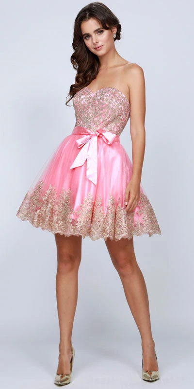 Imagine yourself in this lovely short strapless homecoming dress in coral/gold by Juliet 759. Made with satin and tulle, this short poofy dress has lace applique embellishments in the bodice and hemline accented with satin ribbon sash and have a corset lace up back.