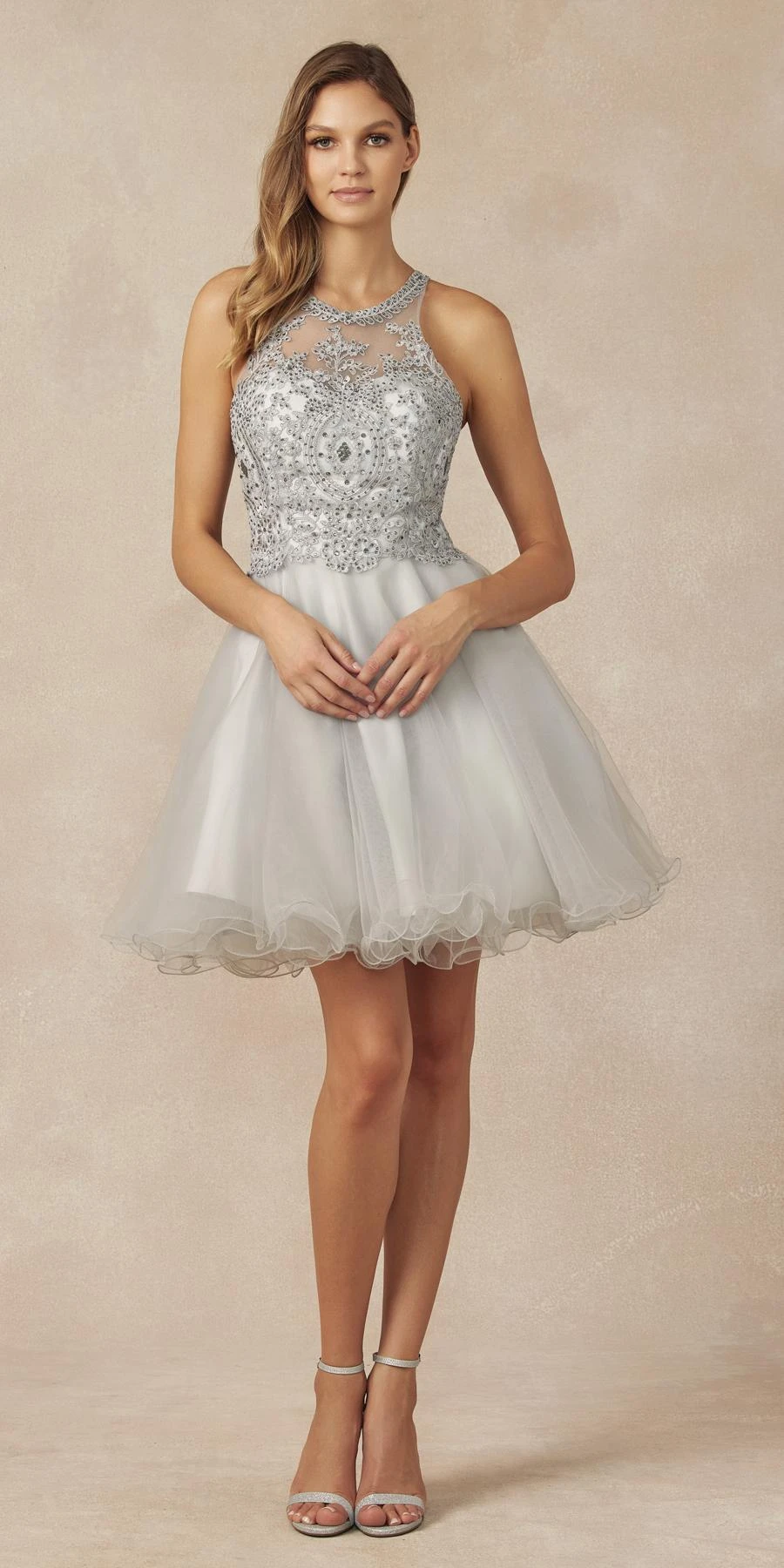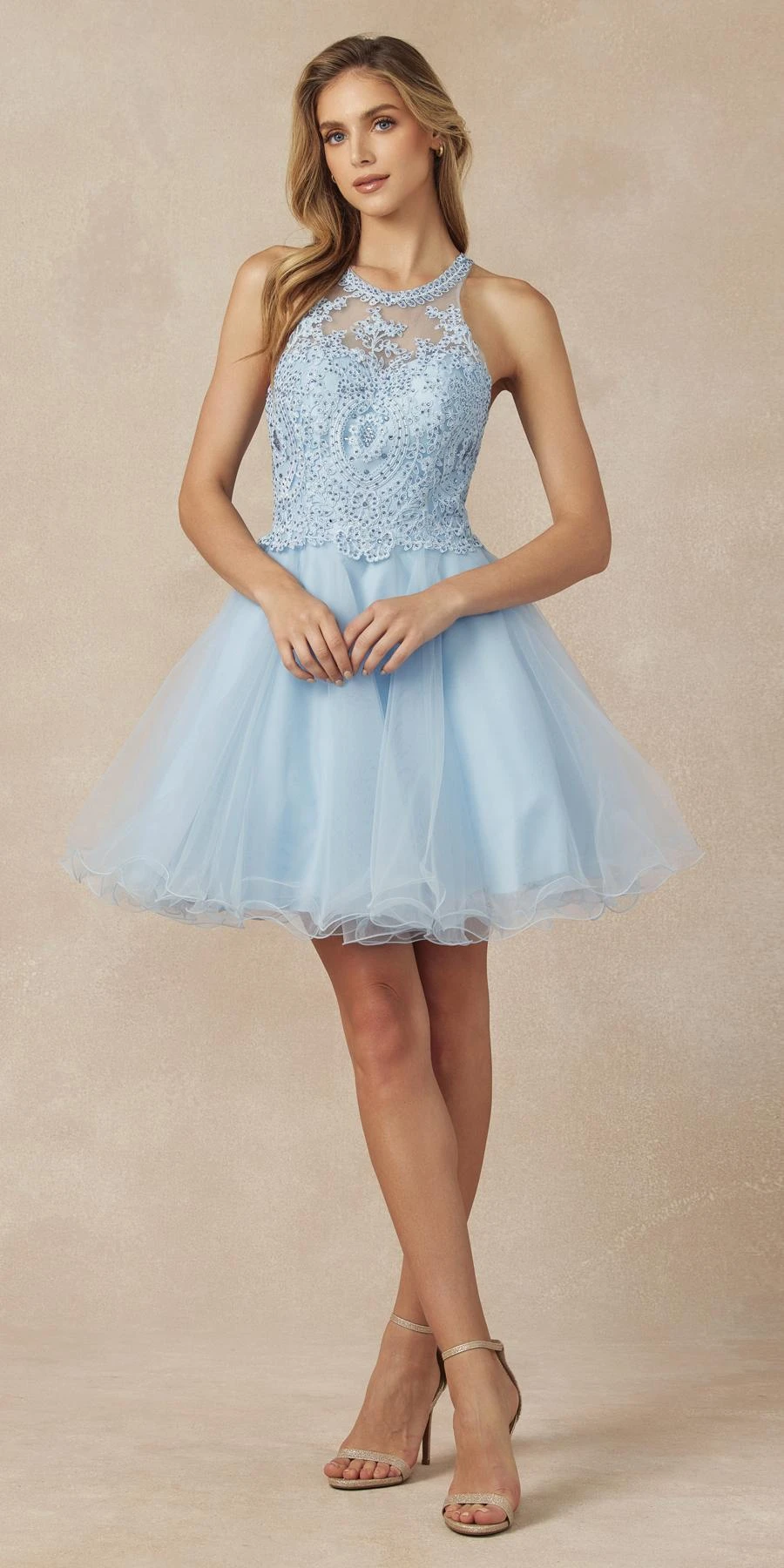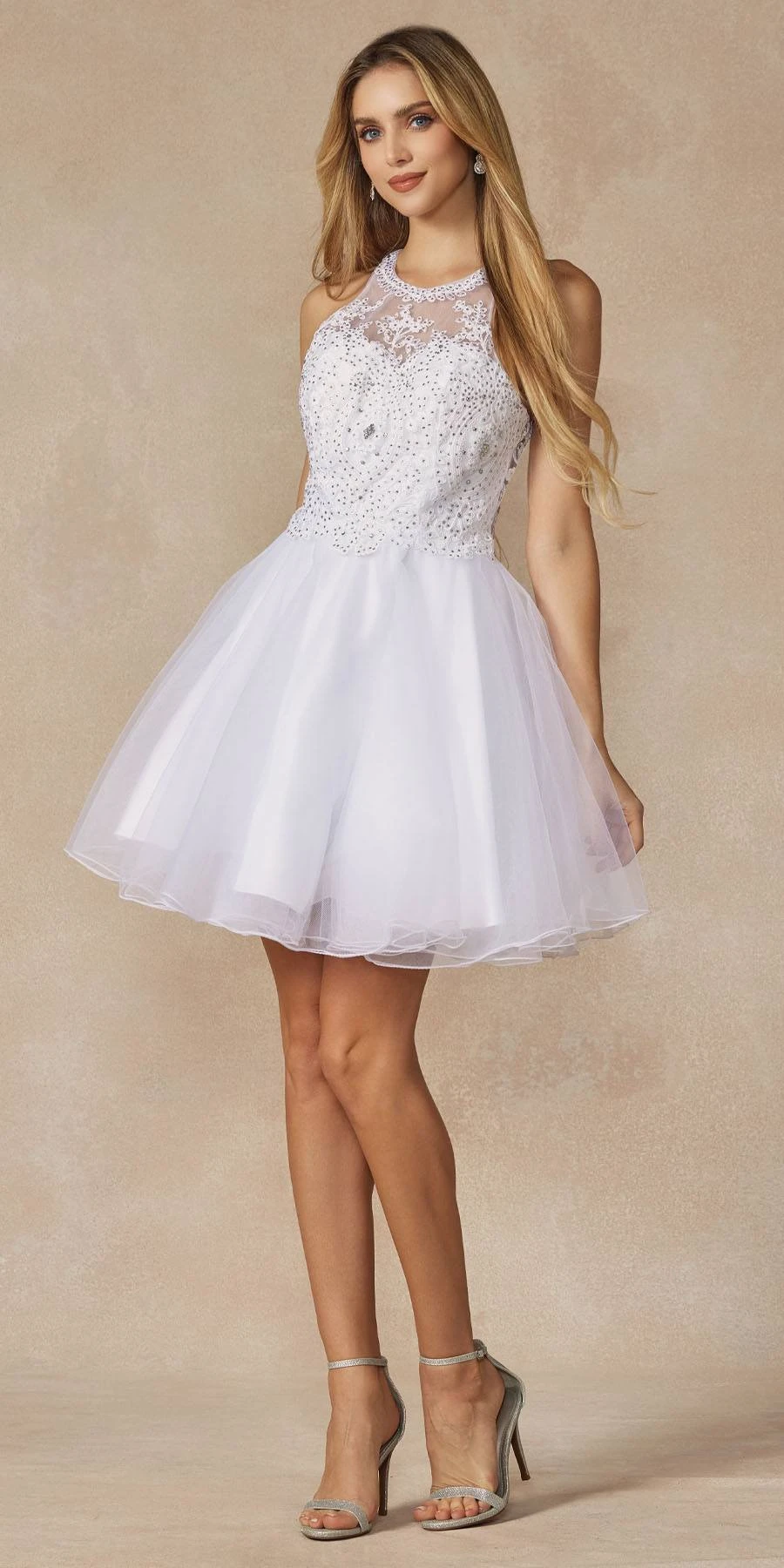Dazzle the evening in this beautiful short A-line gown by Juliet 826, which features a sheer bodice with embroidery and beading. A beautiful short fit and flare A-line dress for homecoming, a party or any special occasion!