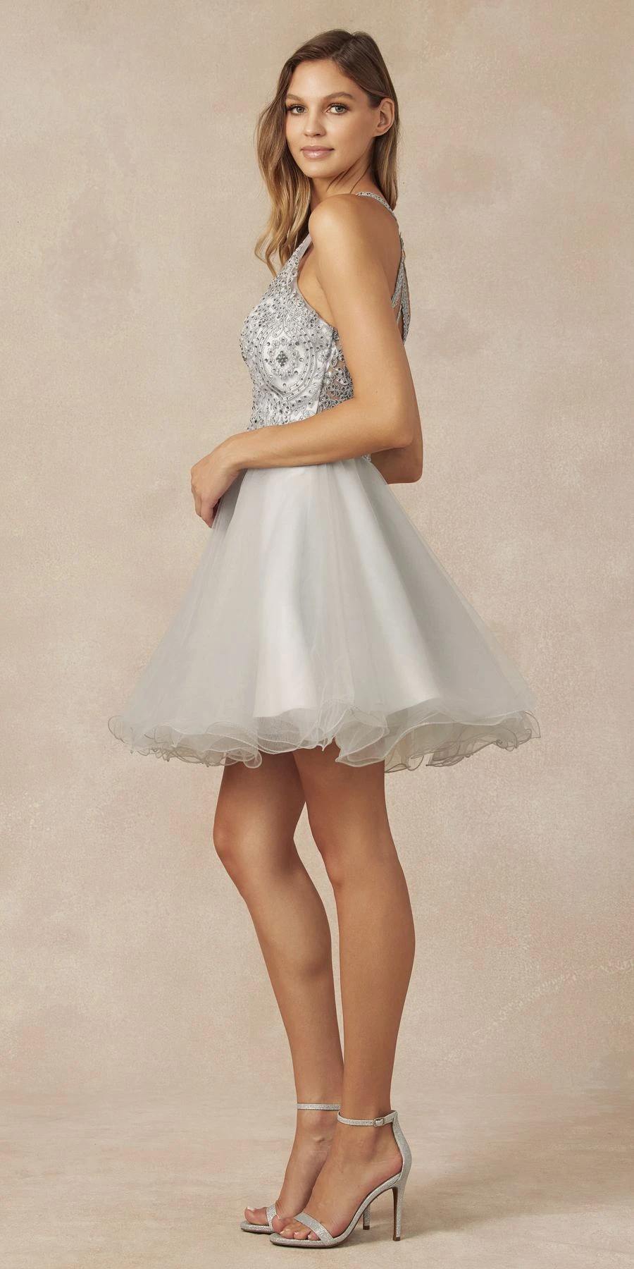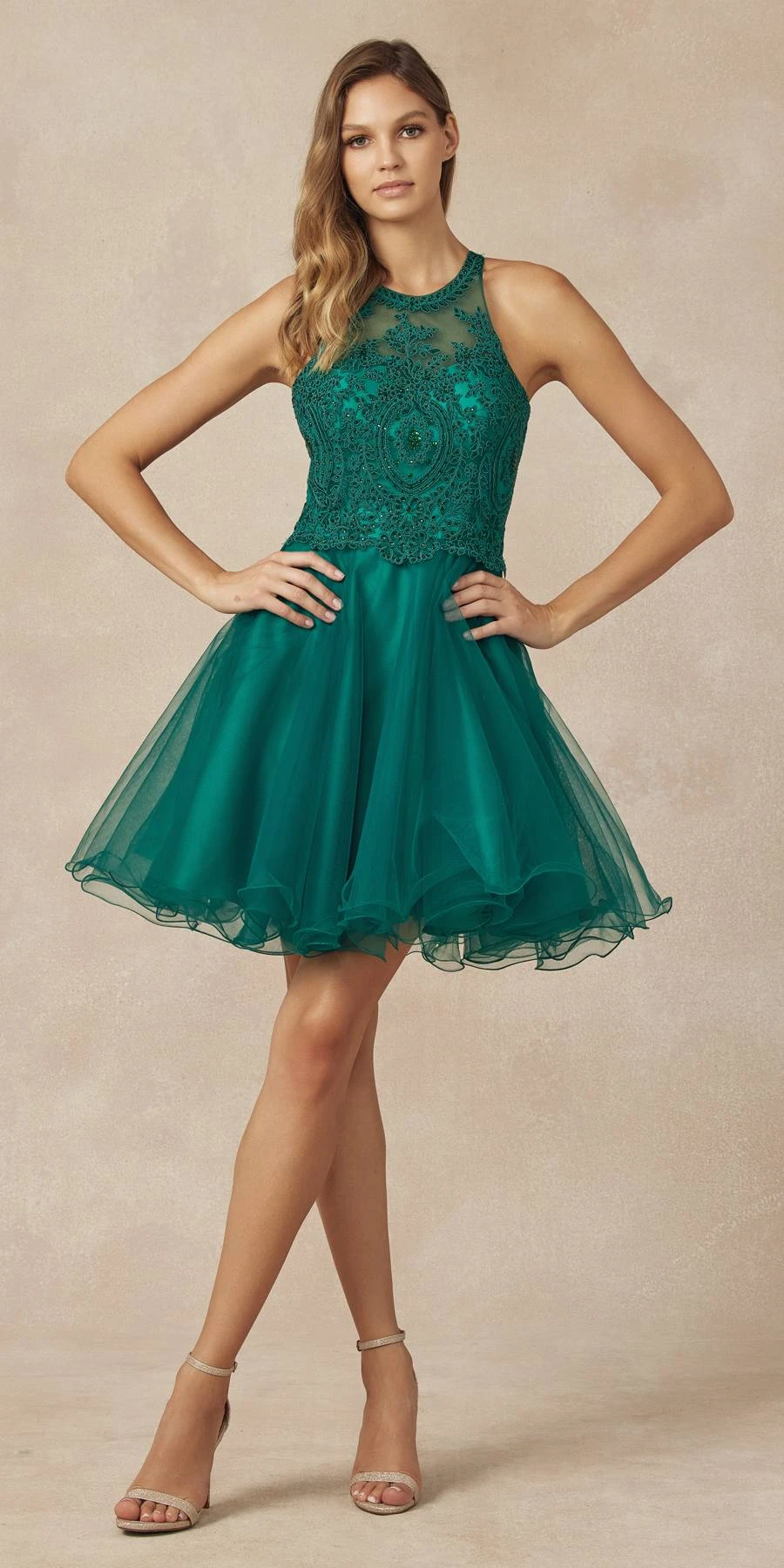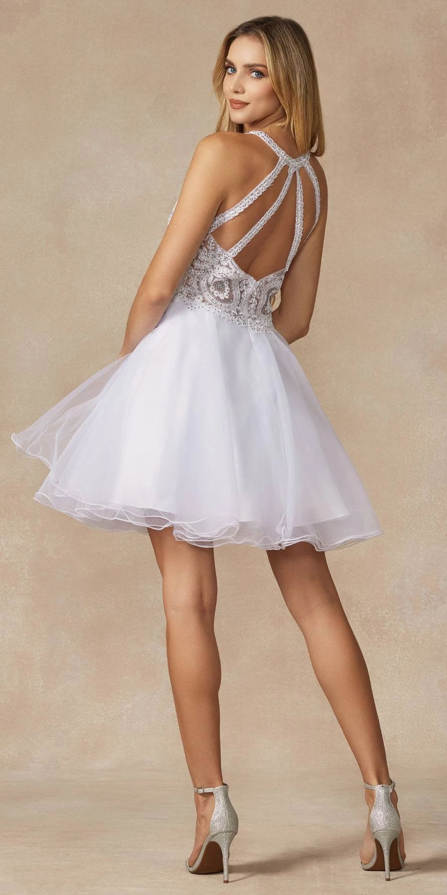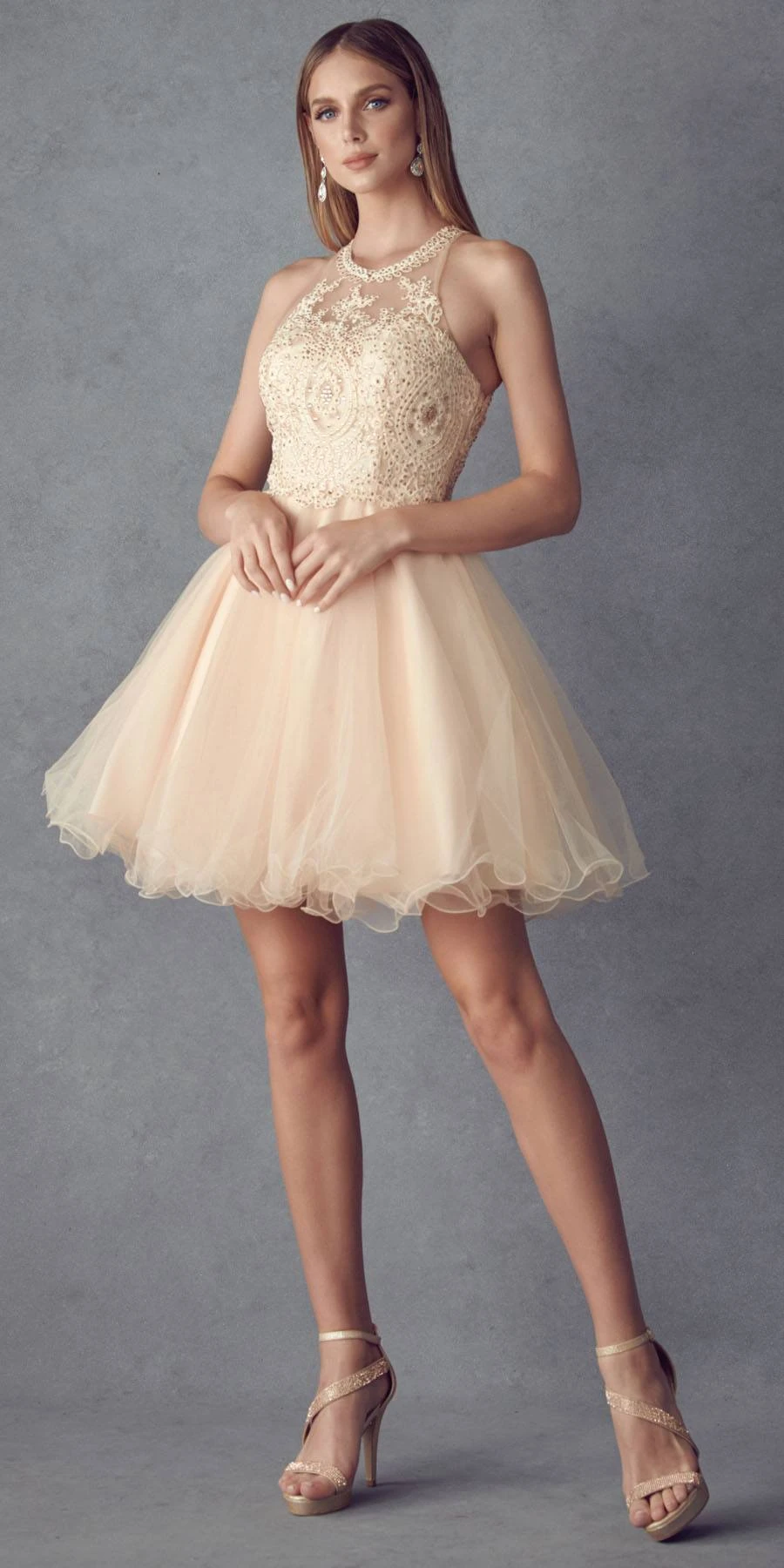 Dazzle the evening in this beautiful short A-line gown by Juliet 826, which features a sheer bodice with embroidery and beading. A beautiful short fit and flare A-line dress for homecoming, a party or any special occasion!