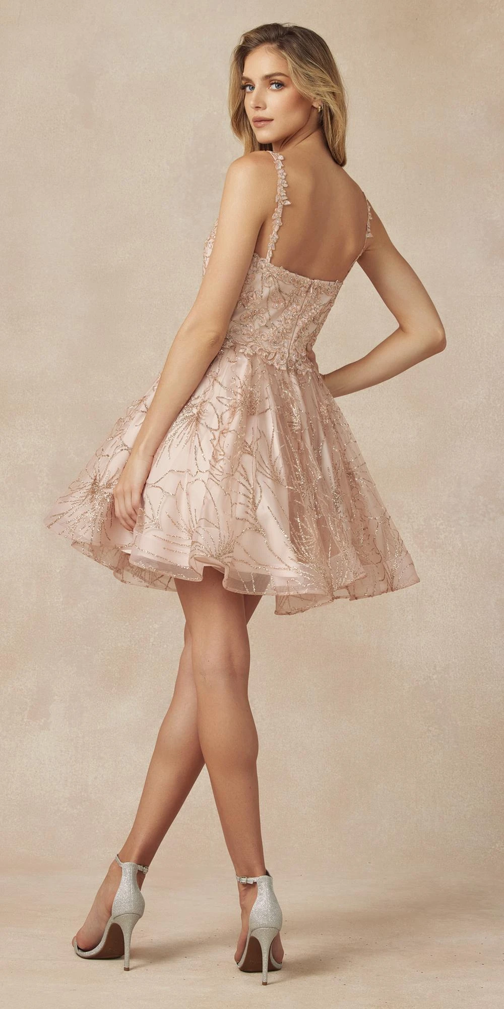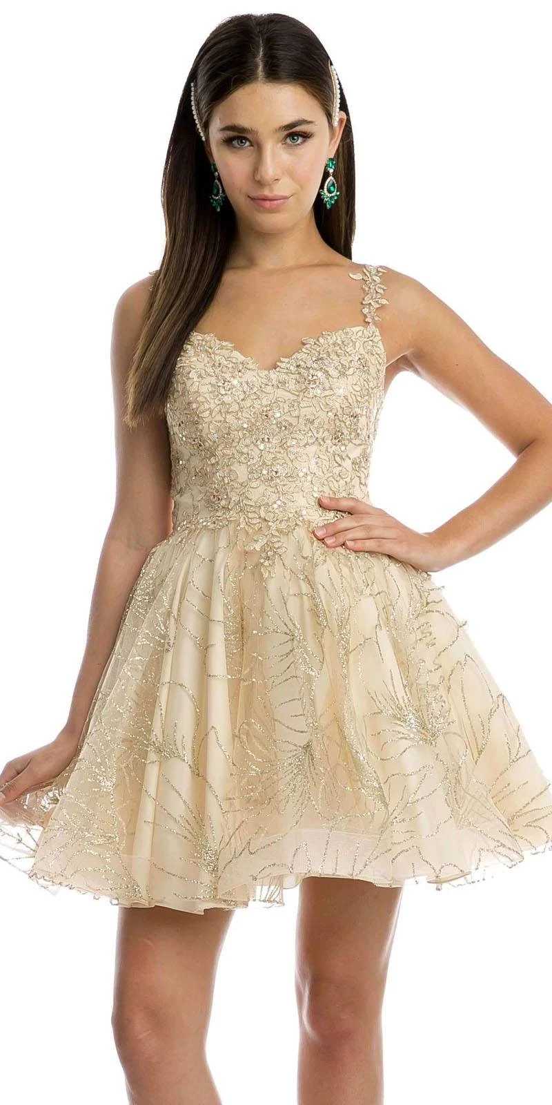 Imagine yourself in this exquisite short cocktail dress by Juliet 838. A pretty dress which the bodice is completely adorned with appliques topped with shimmering rhinestones with V-shape neckline, dainty appliqued shoulder straps and zipper back closure while the tulle skirt is decorated with amazing designs of glitters. A luxurious style of short dress perfect for homecoming, sweet-sixteen parties, prom or in a birthday celebrations!