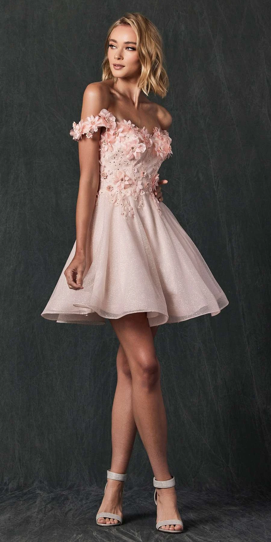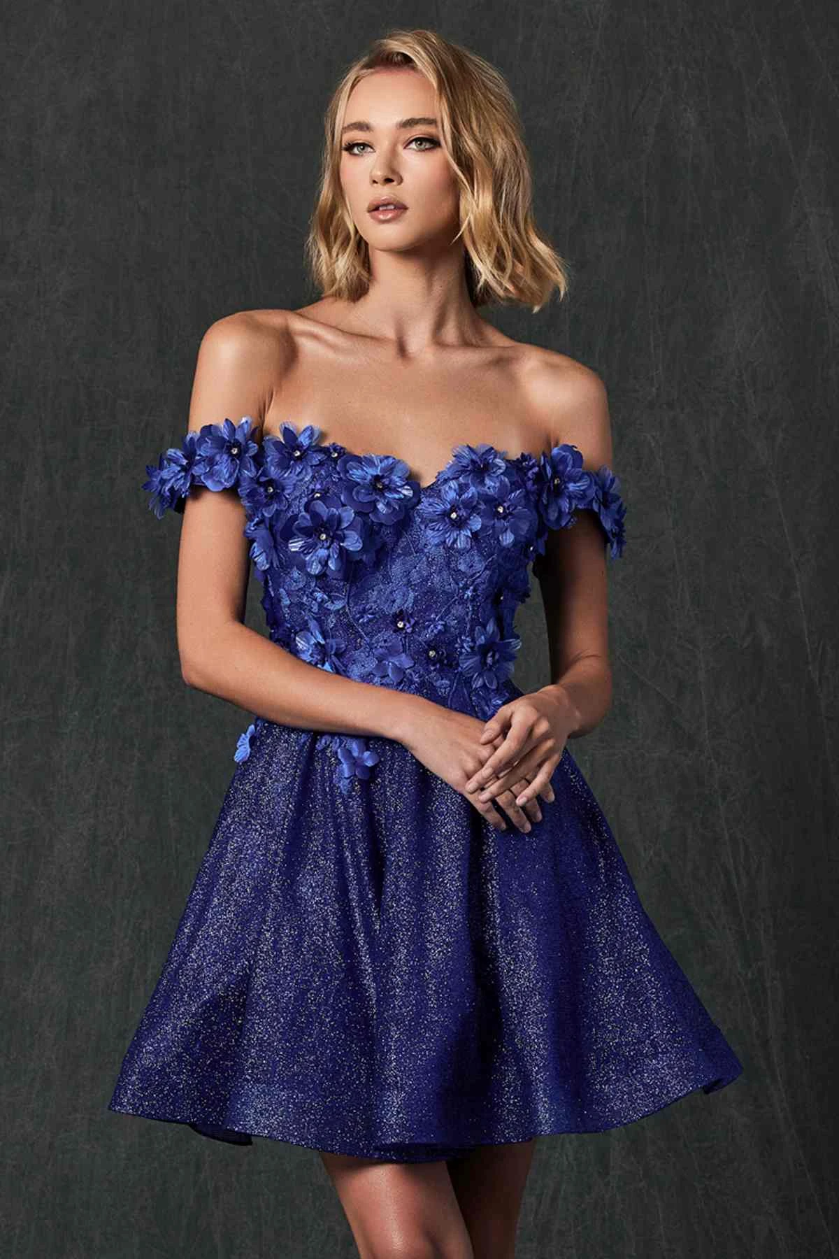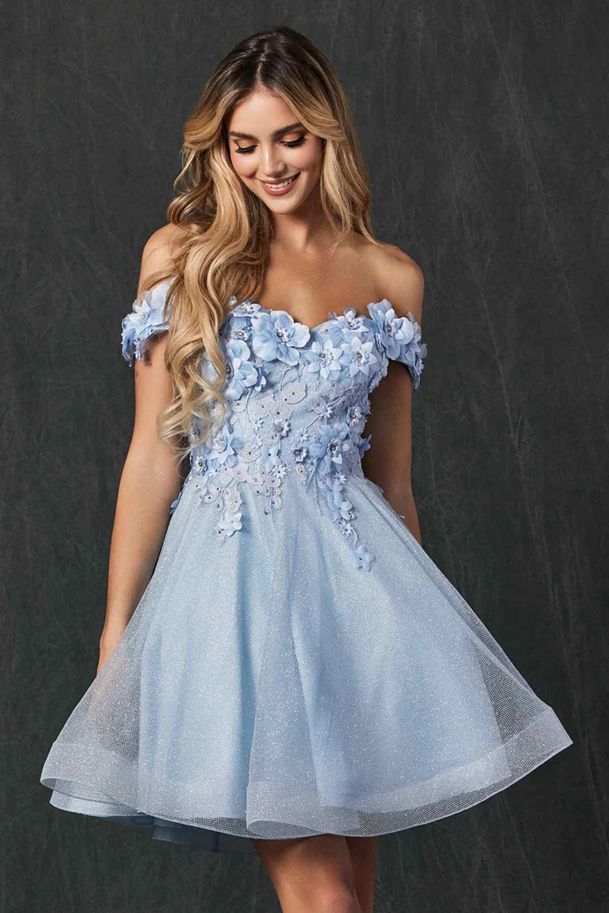 Dazzle the evening in this beautiful short A-line glitter mesh dress by Juliet 861, which features an off the shoulder strap design, with 3D floral applique, rhinestones that accent the bodice and zipper back. A beautiful short fit and flare A-line dress for homecoming, damas, prom or any special occasion!