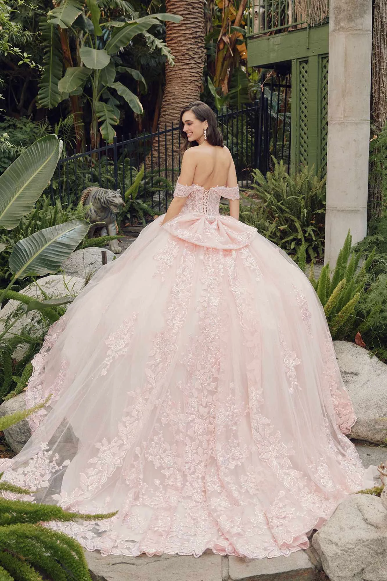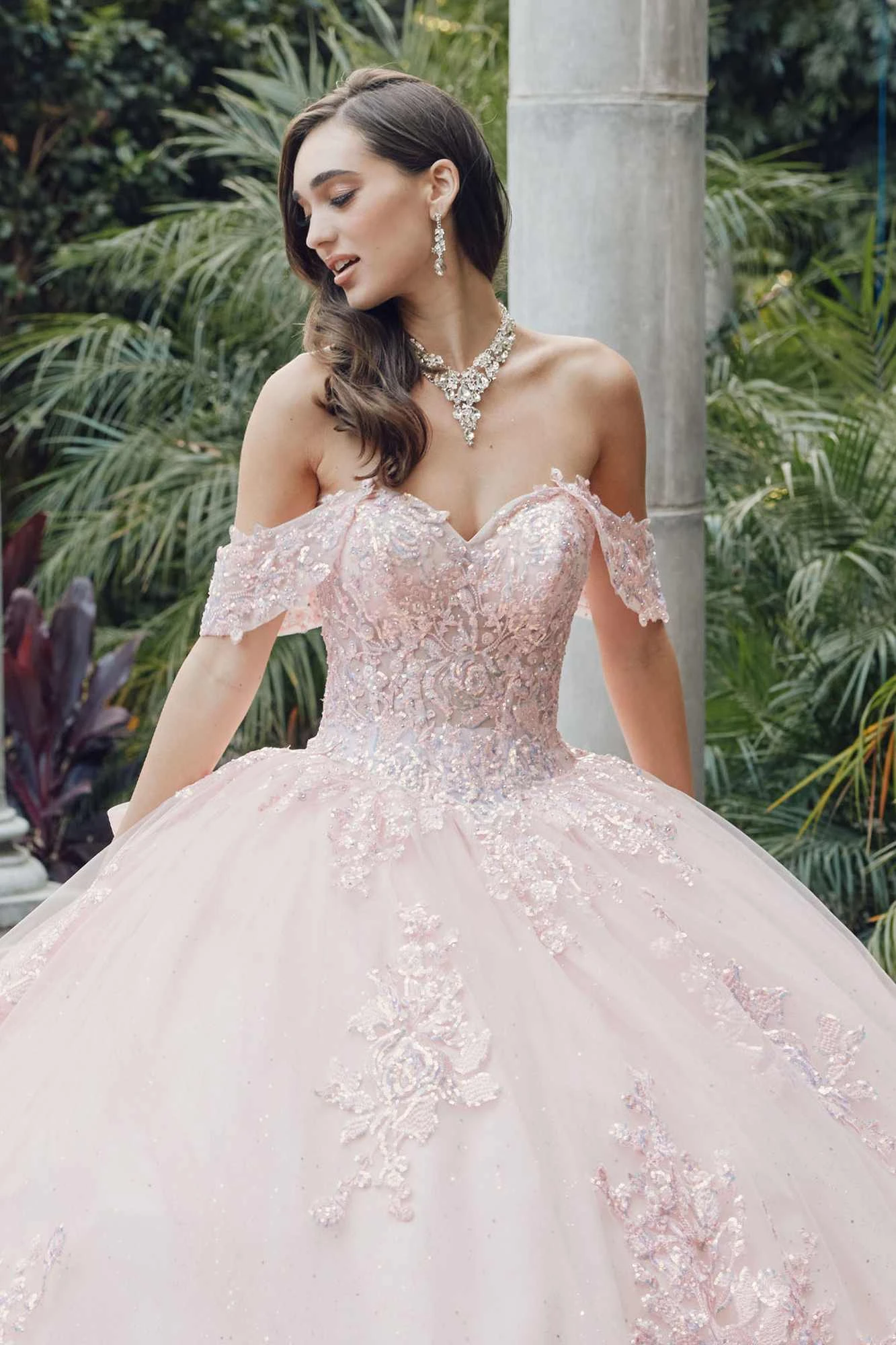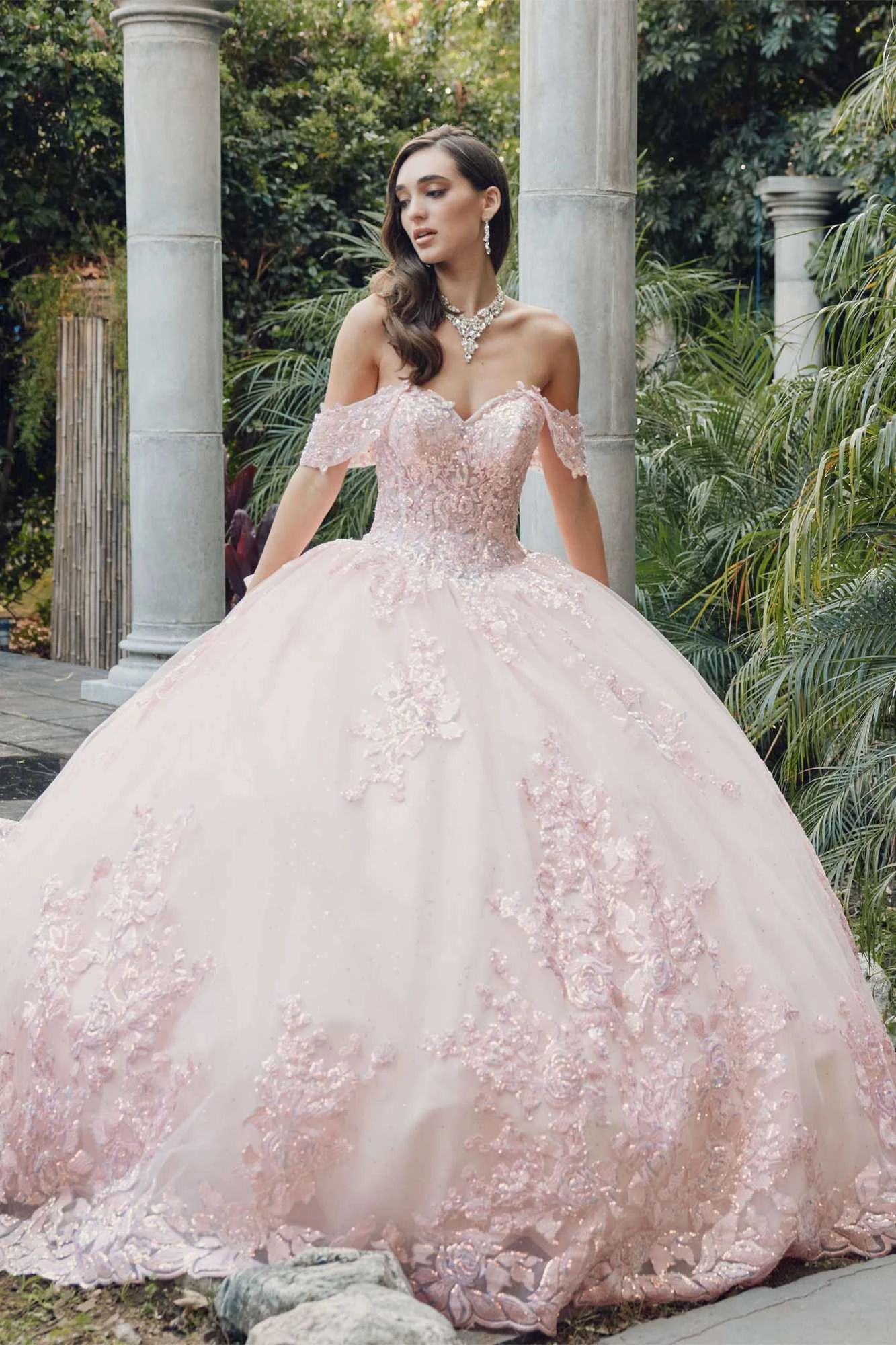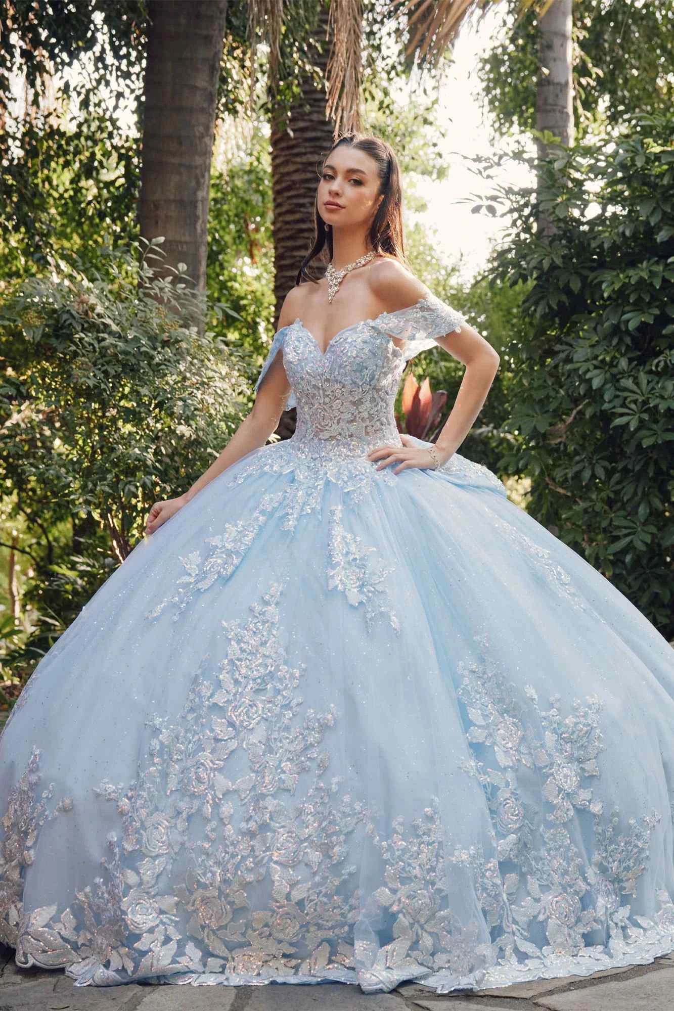 Step into a fairytale with our magical and timeless ball gown. This A-line dress features a poofy glitter tulle skirt that will make you look like a princess. Dance the night away in this formal floor length dress with a refreshing embroidered sequin applique and a stunning cathedral train. Complete the look with the sheer off the shoulder draped sleeves and a corset lace-up tie back with a large bow. Quinceanera by Juliet JT1458J is the perfect choice for your special event. A beautiful dress for Quinceanera, Sweet 16, Debutante Ball, Wedding, Red Carpet, Special Occasion, Formals, Gala Party, Prom or any special occasion!