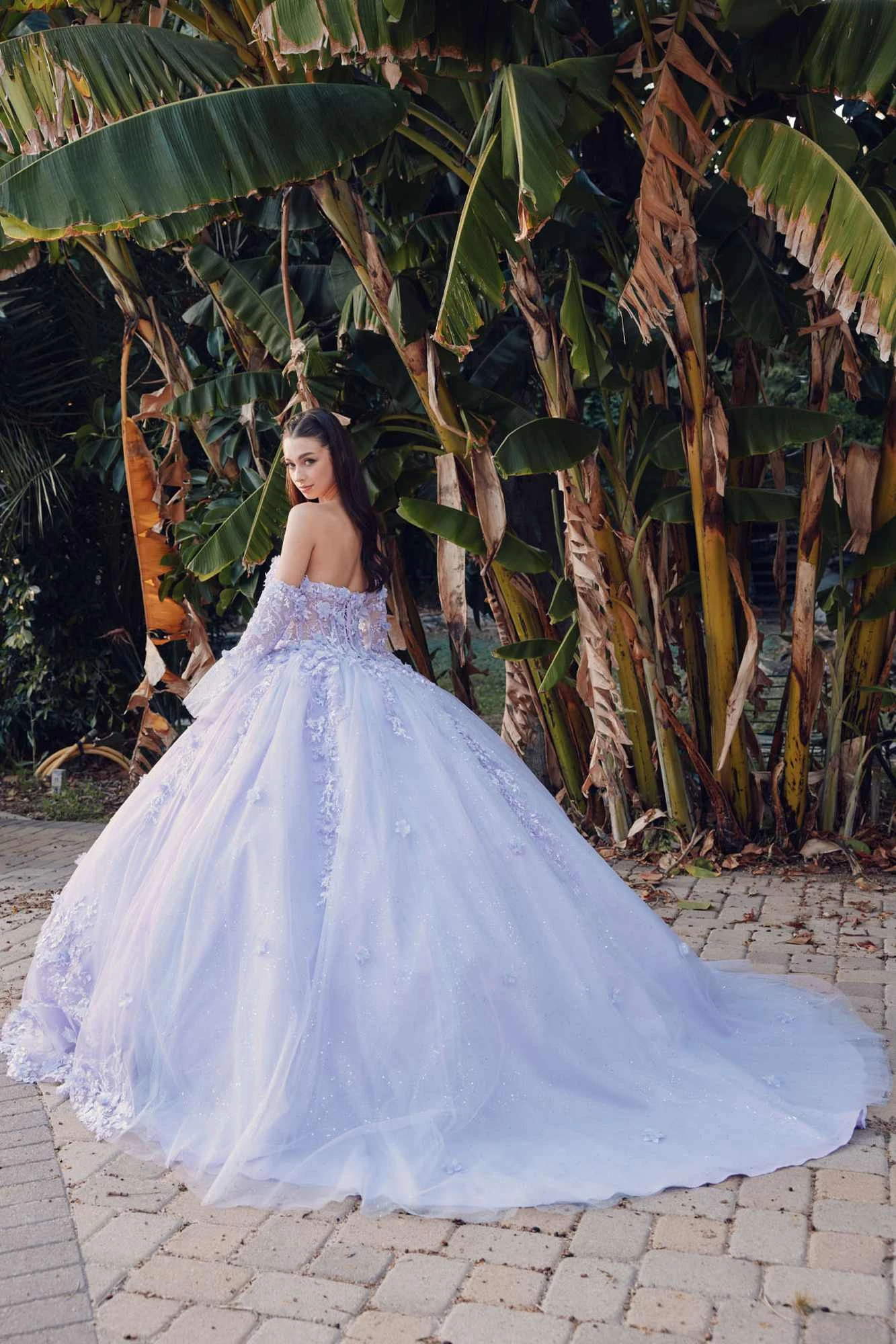 Make a statement with this magical and timeless A-line dress by Juliet JT1459J. You’ll look like a princess in the poofy glitter tulle skirt and be ready to dance the night away. This formal ball gown features a refreshing sweetheart neckline and intricate 3D floral applique with stunning sequin detailing. The corset lace-up tie back and sheer boned bodice add a touch of elegance. Complete the look with the cathedral train and optional long bell sleeves for a truly enchanting quinceanera.