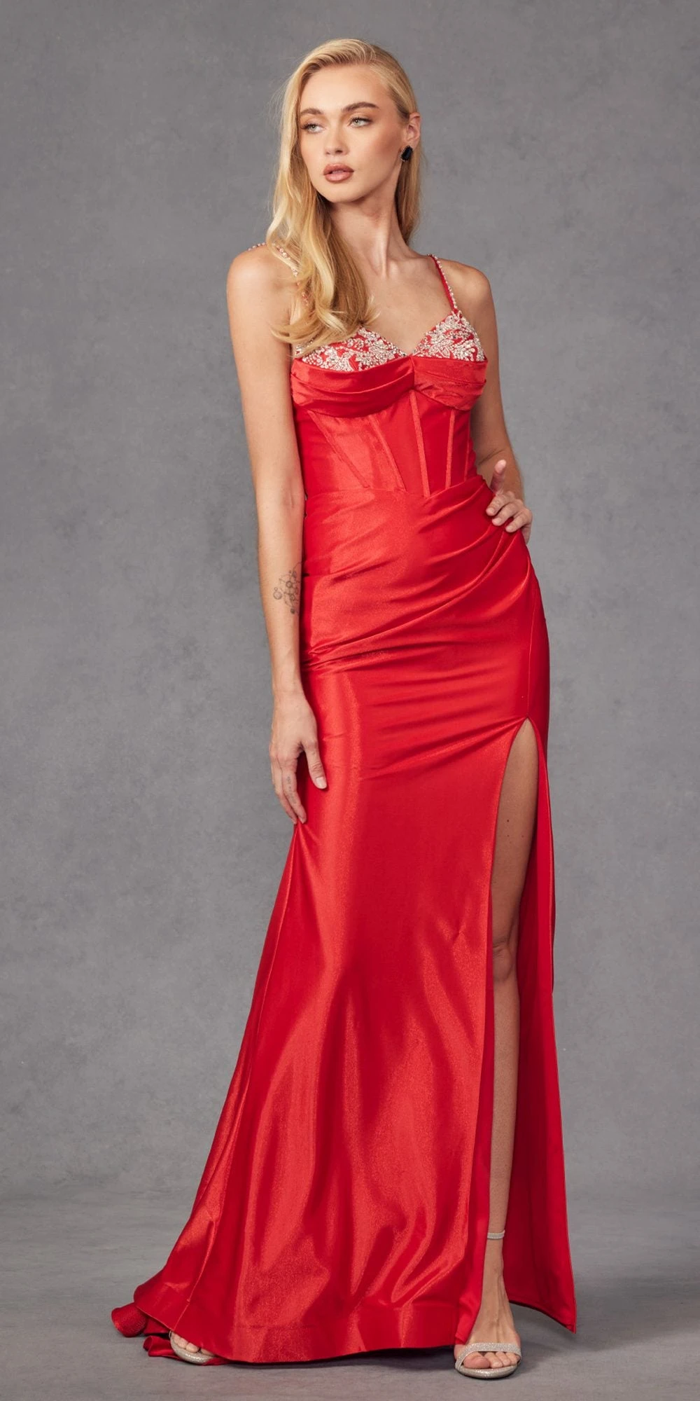 Make a stunning entrance in this glamorous floor length dress by Juliet JT2434A. The fitted silhouette and ruched skirt accentuate your figure, while the silky stretch satin and rhinestone and bead detailing add an eye-catching touch. With a sweetheart neckline and a leg slit, this dress is a vision of beauty. The corset boned bodice and lace-up tie back ensure a perfect fit. Perfect for any formal occasion, this dress will surely turn heads in this mermaid skirt. An ideal full-length dress forΒ red carpet events, pageant, prom or in any other formal occasions!Β