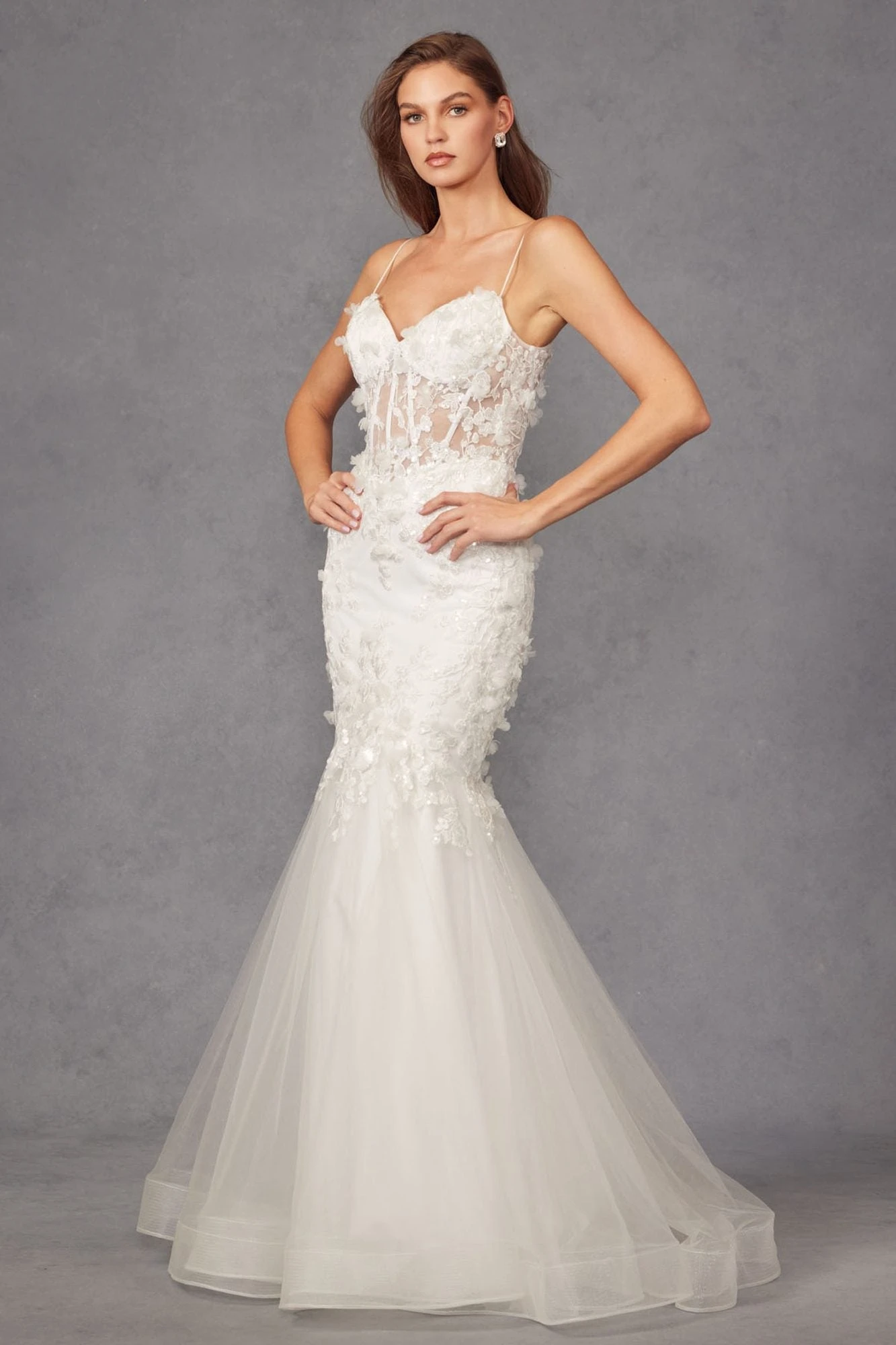 Introducing the Juliet JT2469KW wedding gown, a stunning and elegant choice for your special day. The mermaid silhouette hugs the body in all the right places, while the sheer corset boned bodice adds a touch of sophistication. The trumpet silhouette, long floor length, and sweep train showcase the embroidered floral applique and 3D floral applique with sequin embellishments. Make a statement with this head-turning, show-stopping piece that will leave everyone in awe. An ideal full-length dress for red carpet events, pageant, prom or in any other formal occasions!Â