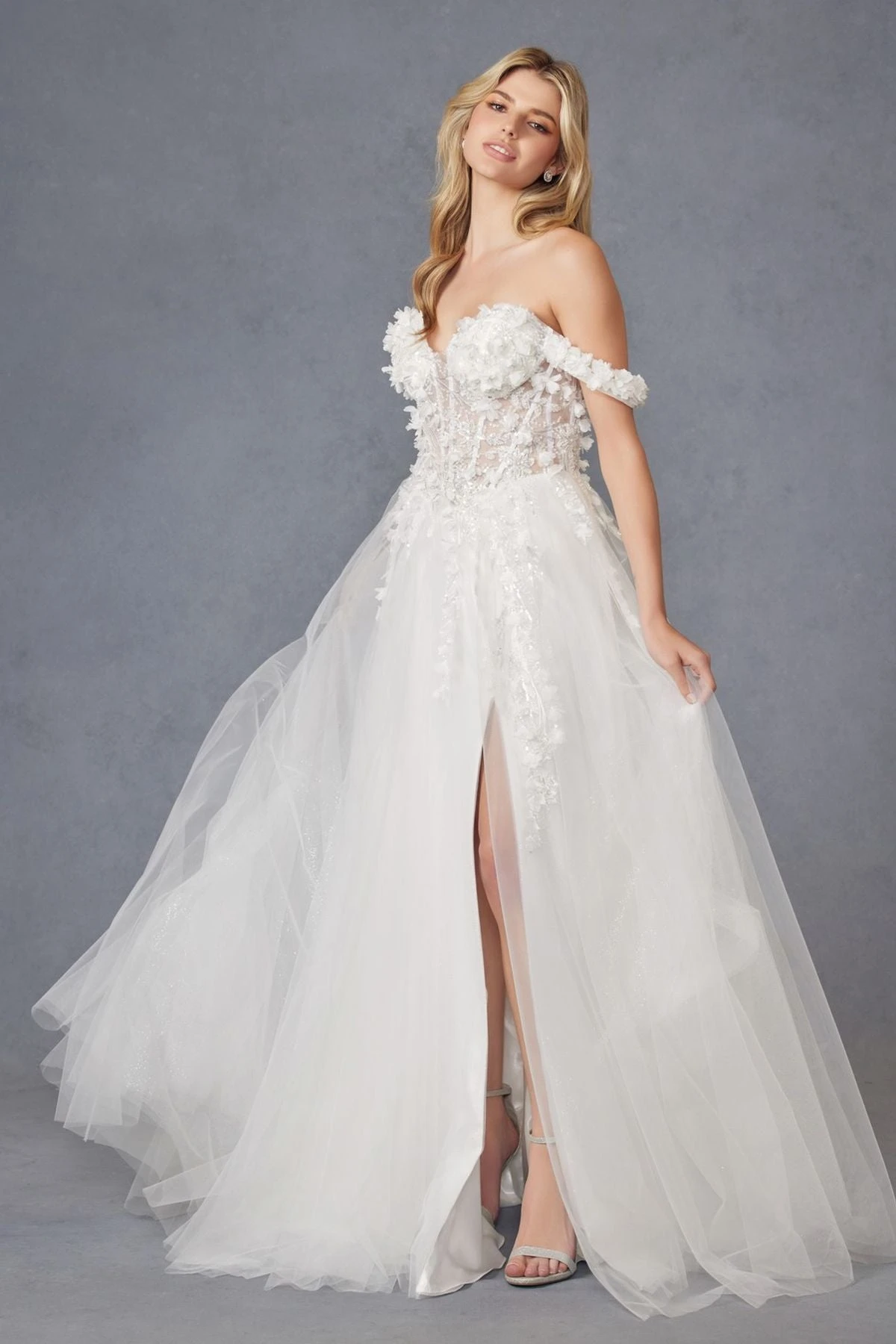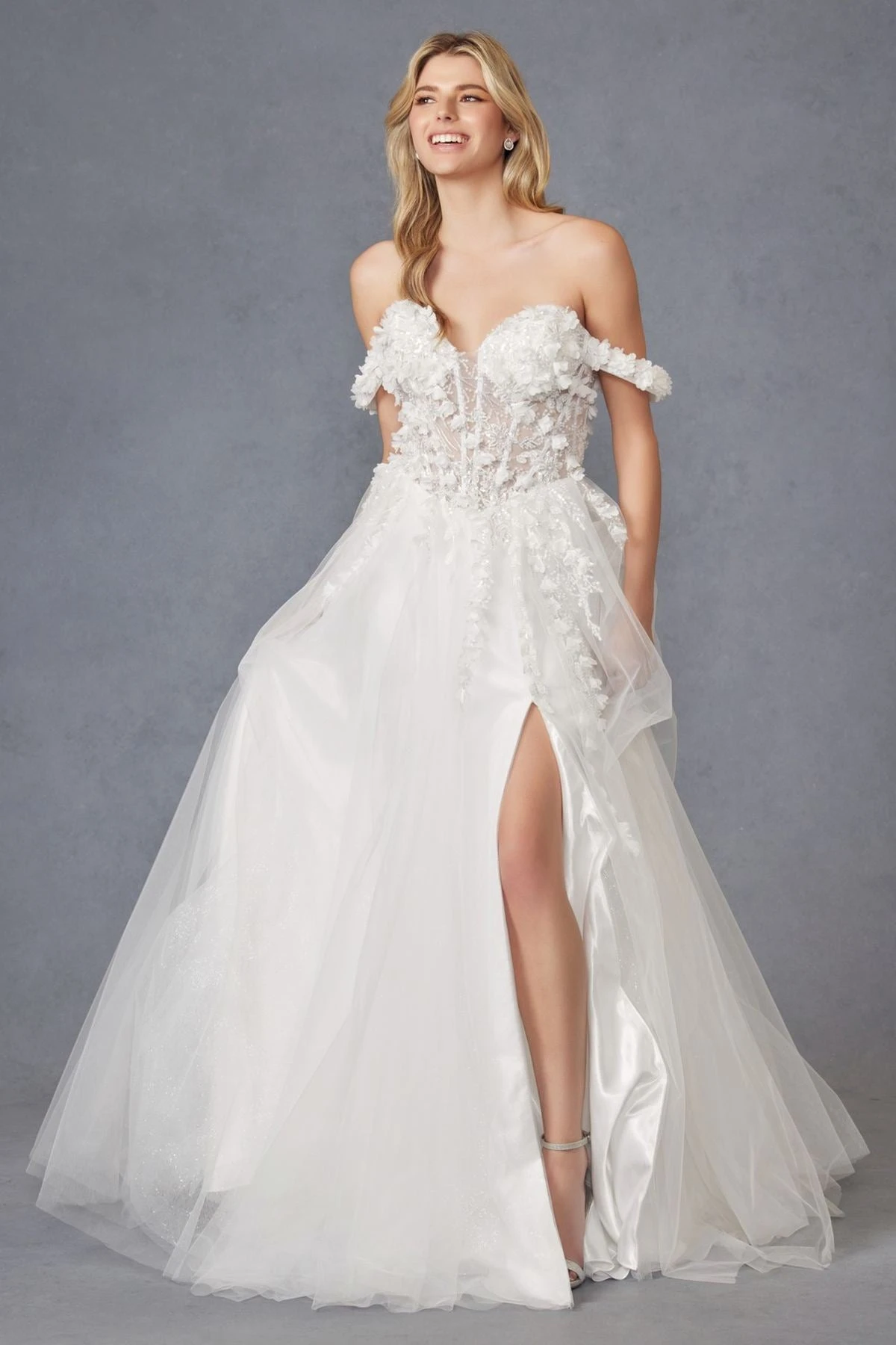 Expertly crafted by Juliet, the JT2483KW gown exudes ethereal beauty. The strapless, off the shoulder design highlights the illusion corset bodice, adorned with intricate 3D floral applique and sparkling beaded embellishments. The A-line tulle skirt flows into a sweeping train, with a leg slit for effortless movement. Perfect for a ball or formal event.