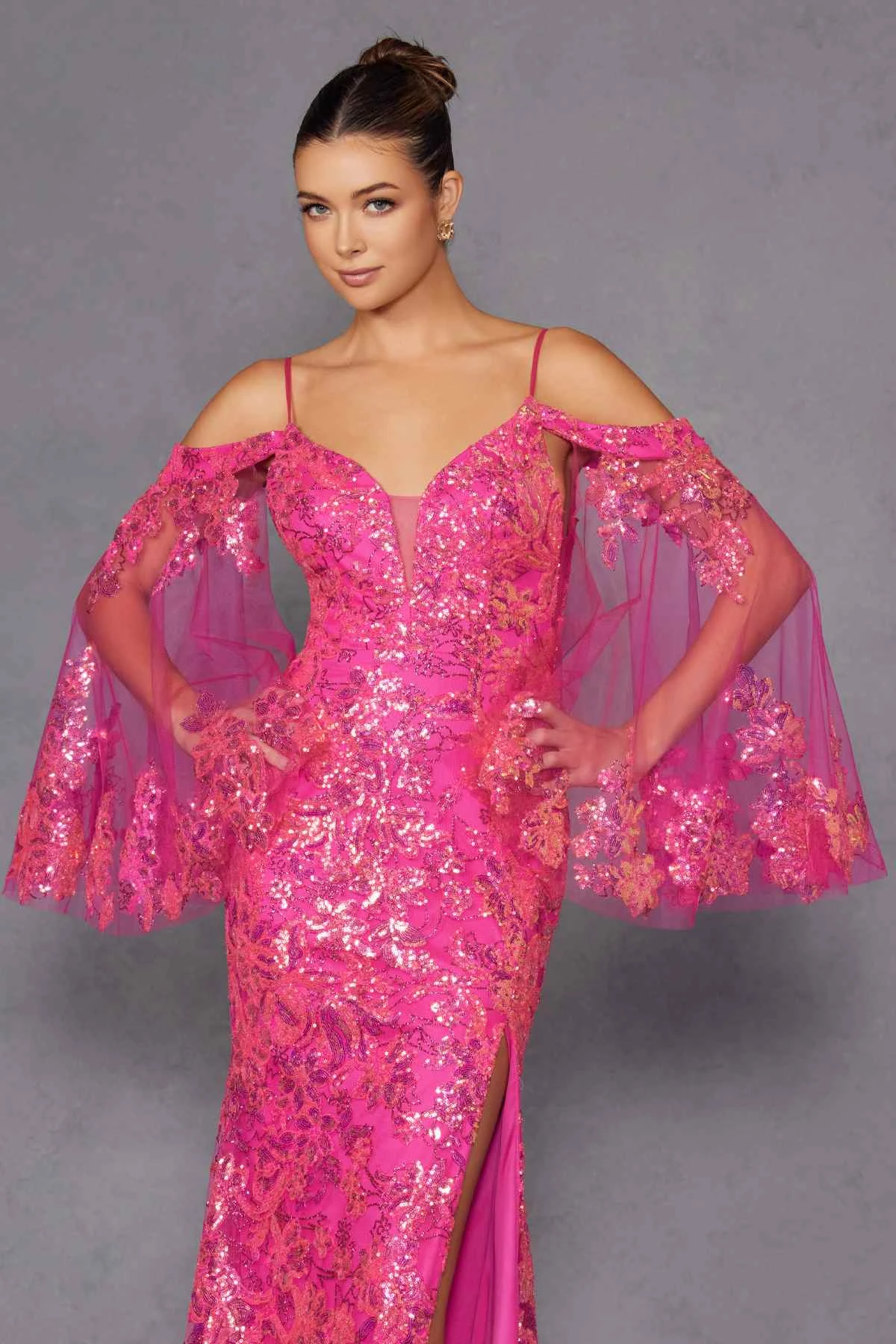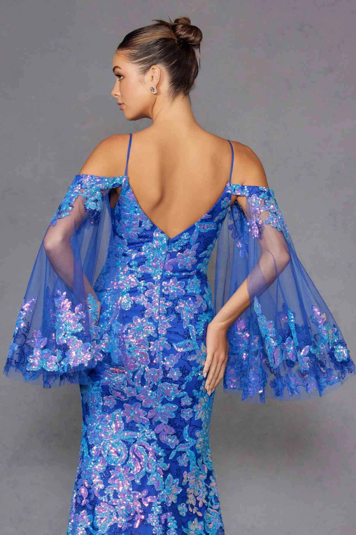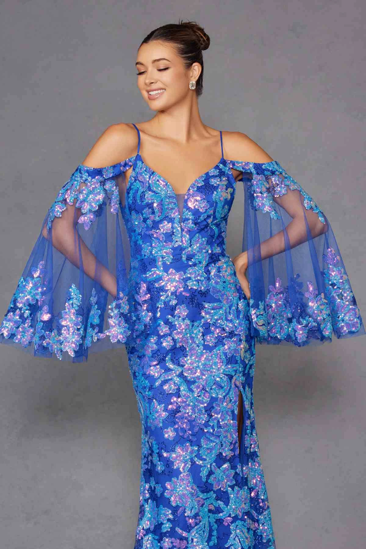 Turn heads at any formal event with this breathtaking evening gown by Juliet JT2564U. The dress features a vibrant fabric, beautifully embellished with intricate glittery appliques creating a rich texture and depth.