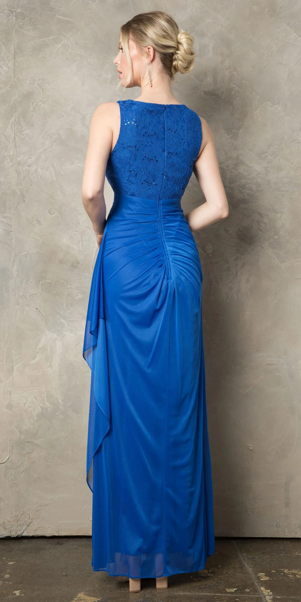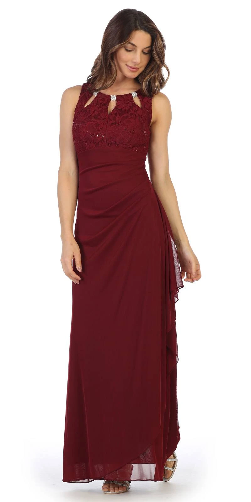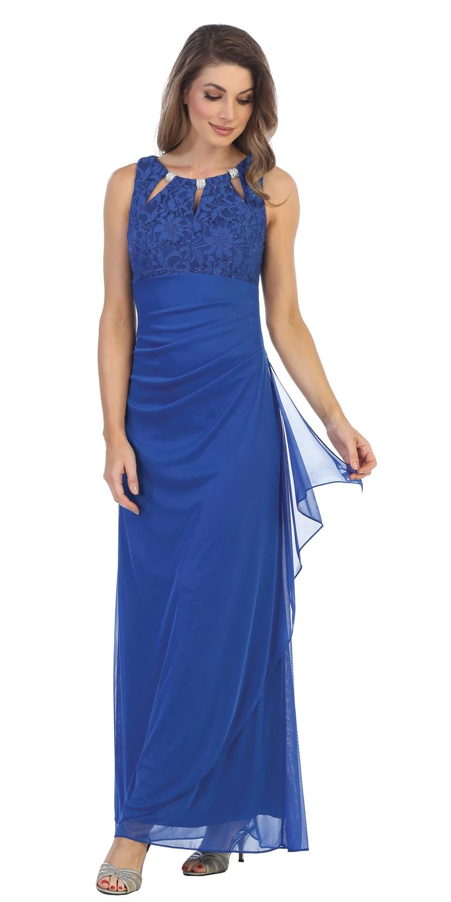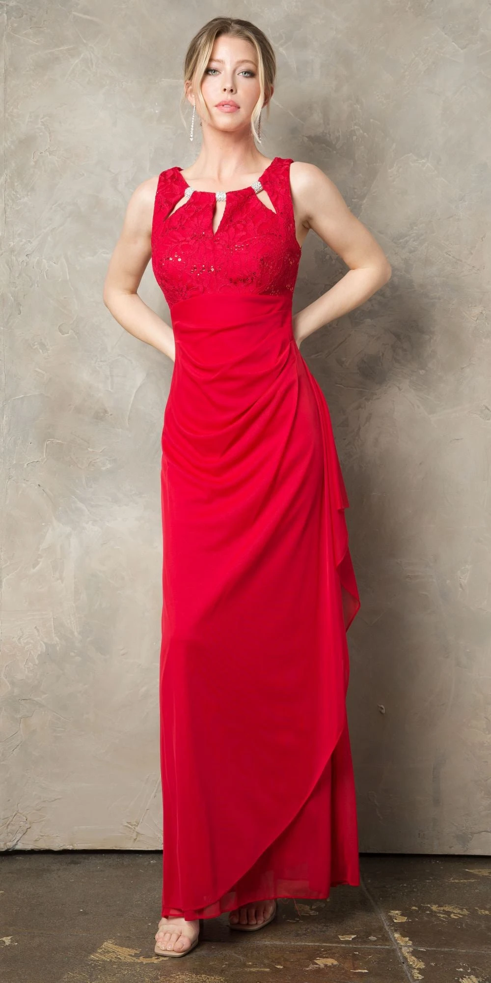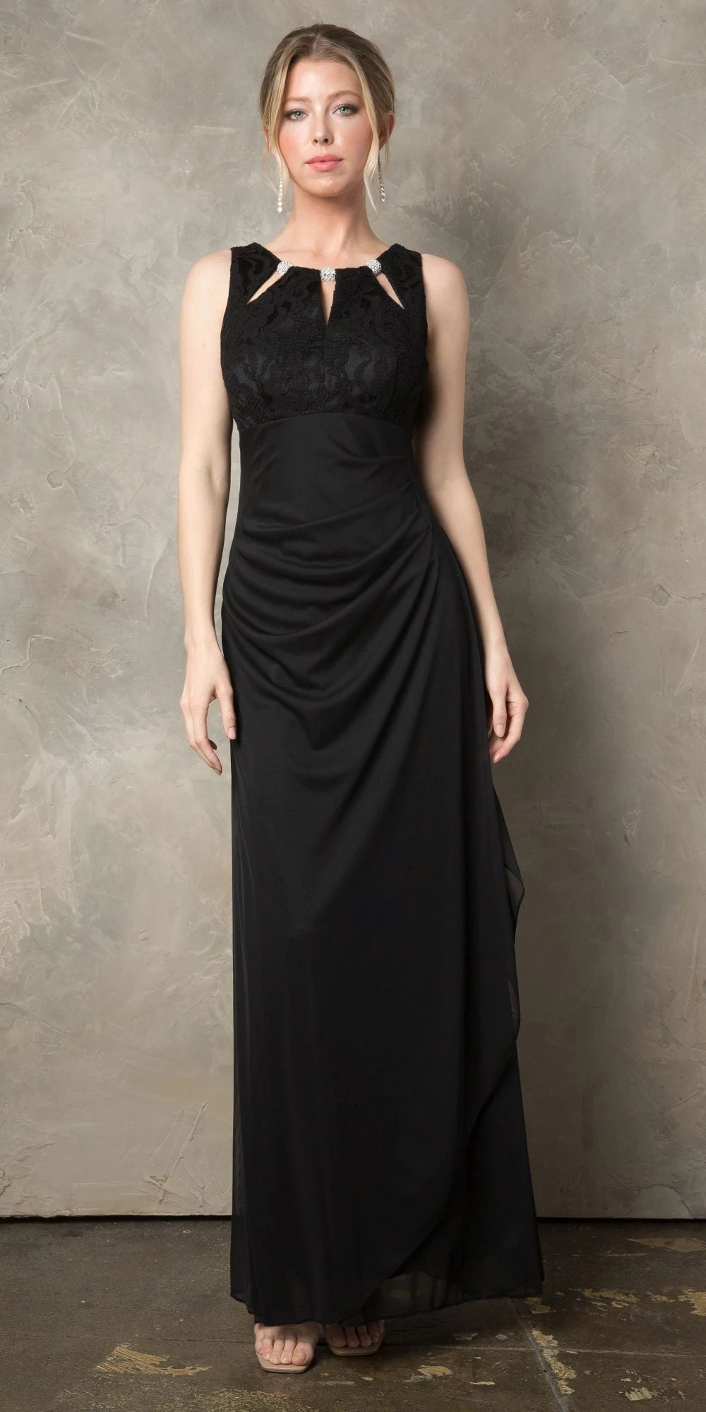 Be confidently beautiful with this long column silhouette long formal dress by Juno 1017. This elegant long dress features a stylish neckline with multiple keyhole, drapes on the side and ruched details on the back of flowy chiffon skirt. A made of lace and chiffon sleeveless gown ideal for mothers of bride or groom or in any other formal occasions!