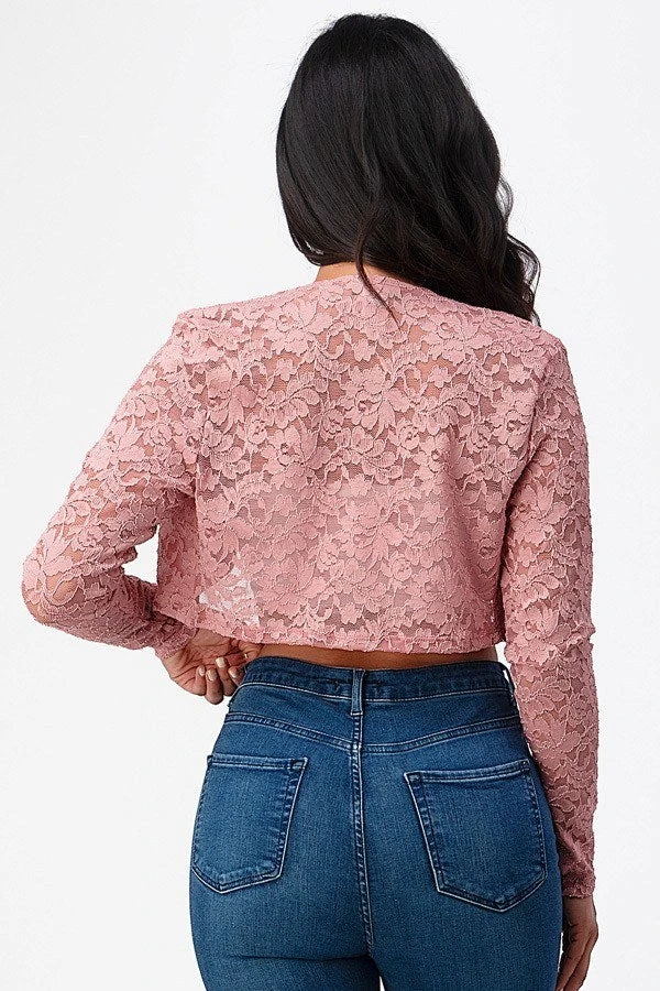 Lace, draped neckline, long sleeve, open front, cropped jacket.