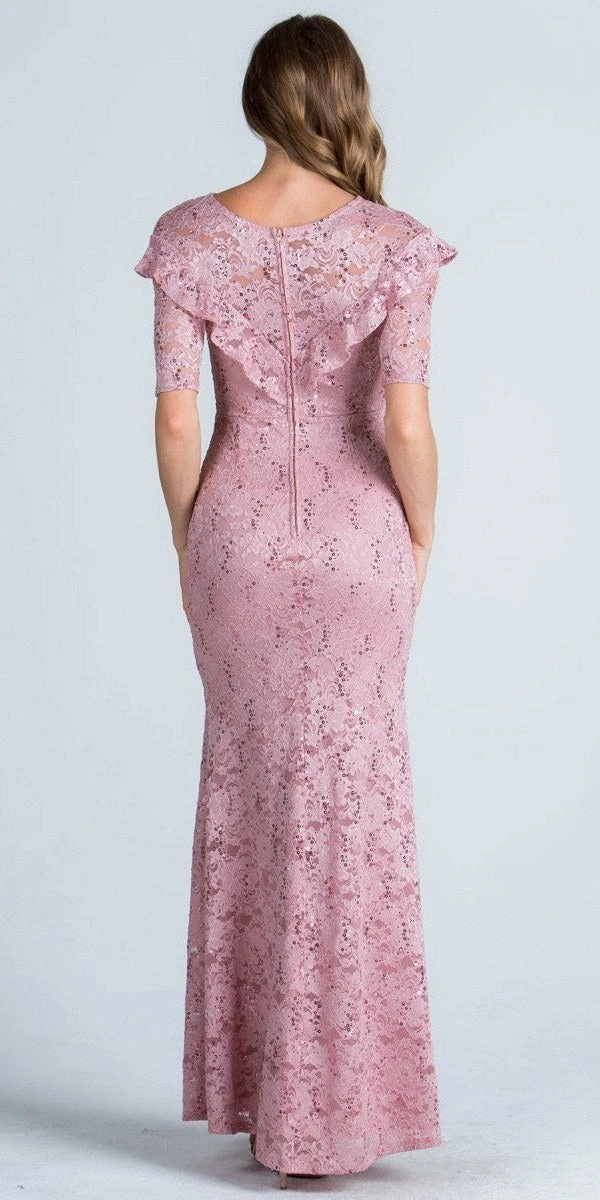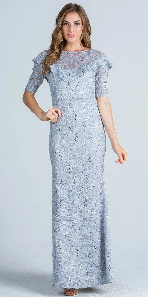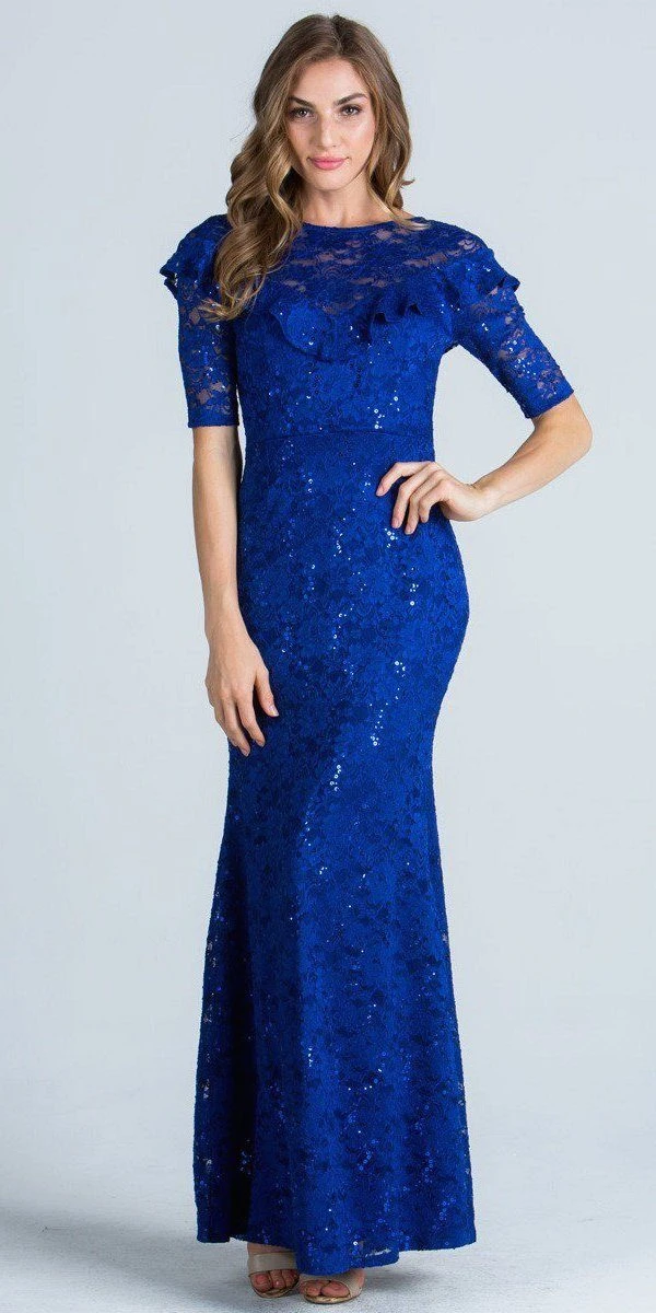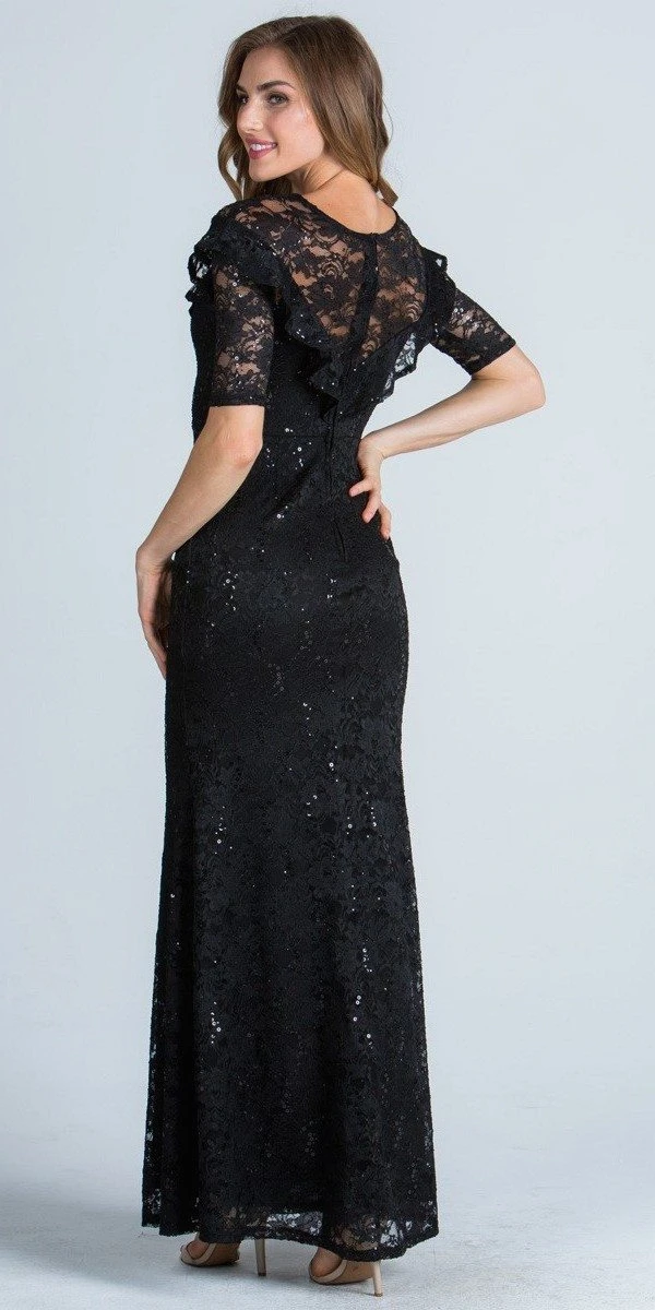 Imagine yourself in this elegant long formal dress by La Scala 24483, which features an illusion ruffled neckline. This fit and flare evening gown has short sleeves, appropriate for modest occasions and in any formal occasions.