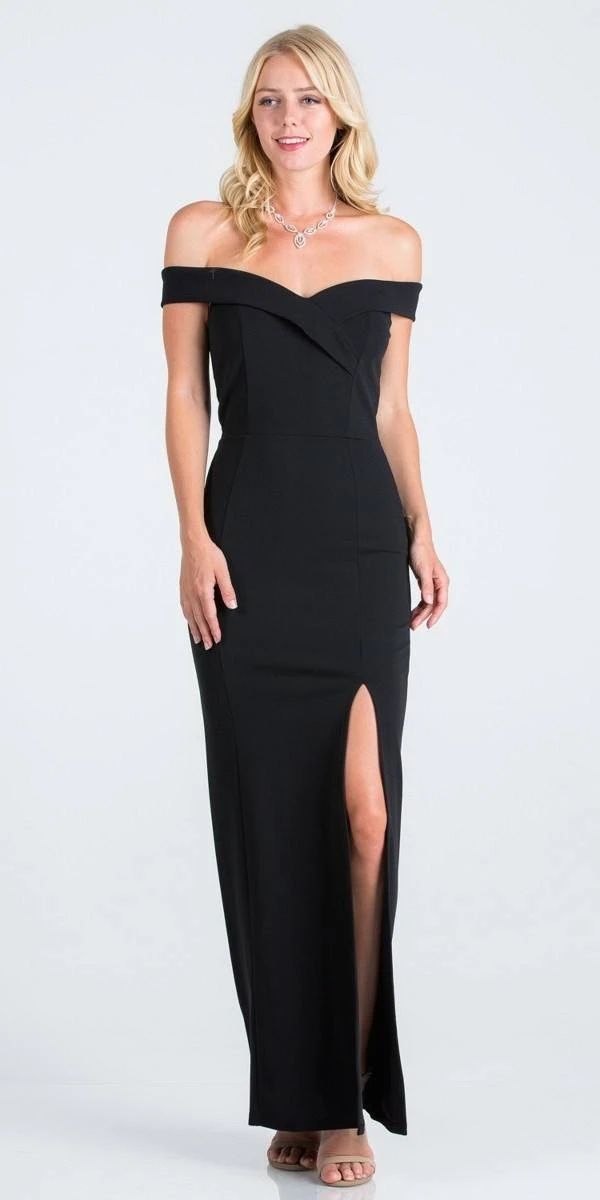 Imagine yourself wearing this trendy off-the-shoulder style dress by La Scala 25078, a form-fitting long formal dress made of scuba fabric with thigh-high slit. A gorgeous outfit for any formal or special events.