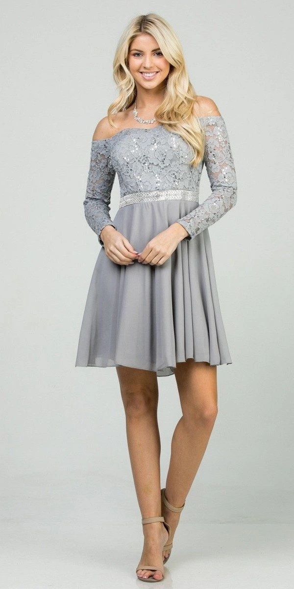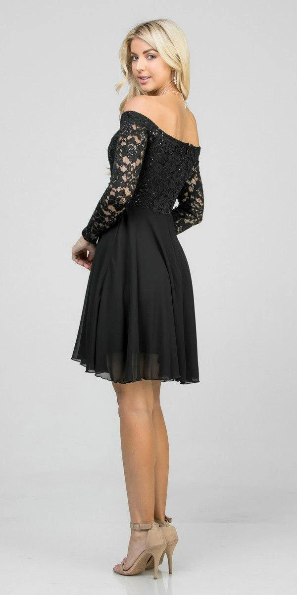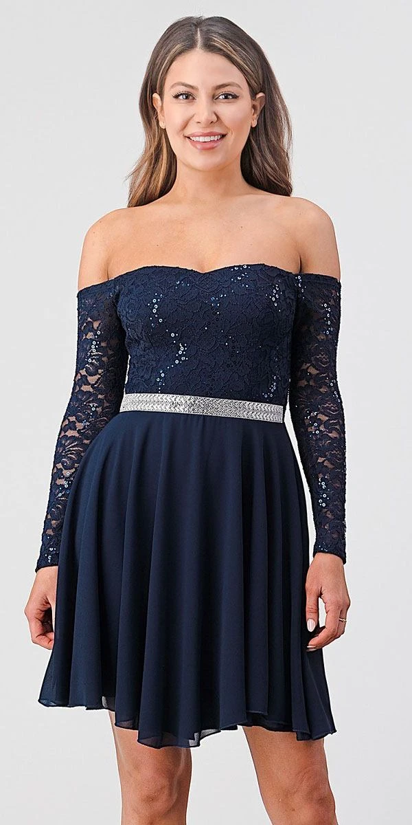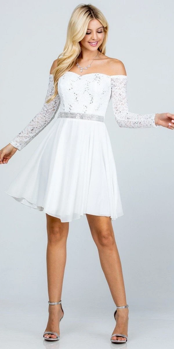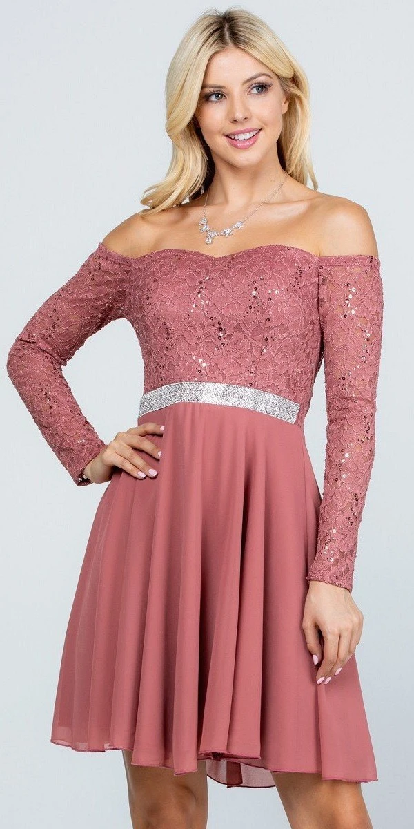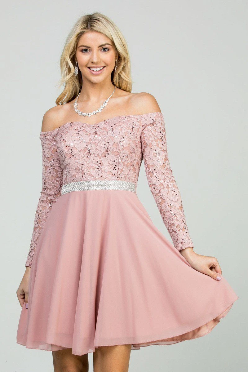 Be confidently beautiful with this a-line silhouette short cocktail dress by La Scala 25406. Featuring a lace bodice with long sleeves and semi-sweetheart neckline while the flowy chiffon skirt is crowned with shimmering sequins band that emphasize the natural waist. A perfect dress for wedding guests, homecoming, bridesmaids or graduation parties.