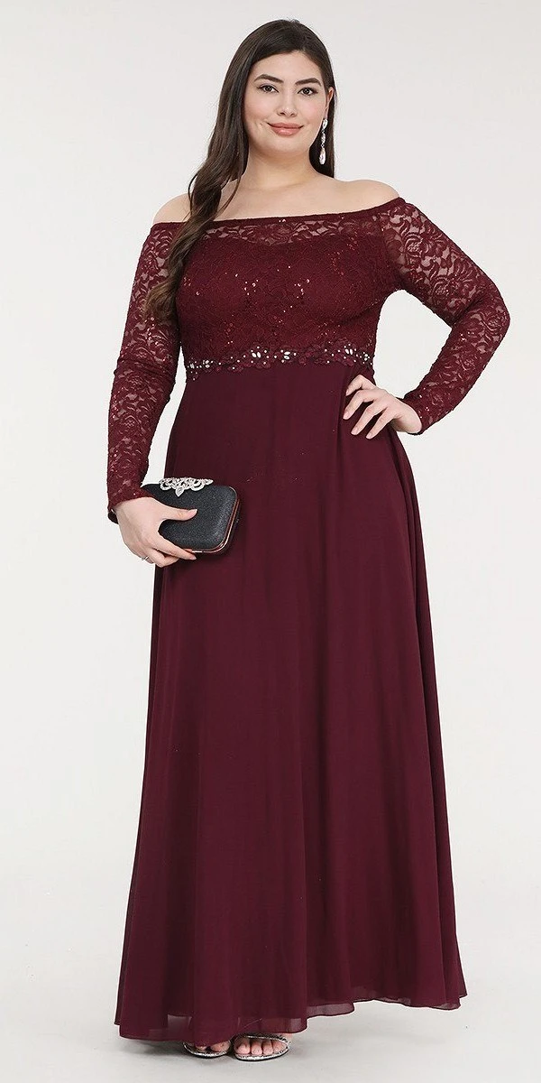 Looking for an elegant and modest outfit for your next formal events? Here’s one for you! A made of lace and chiffon evening gown by La Scala 25418 with lace bodice and long sleeves while the natural waist is adorned with appliques topped with dazzling beads and flowy chiffon A-line silhouette skirt. With boat neckline this long formal dress is a perfect attire for wedding events, marine or military ball, winter formal or in any other special celebrations.