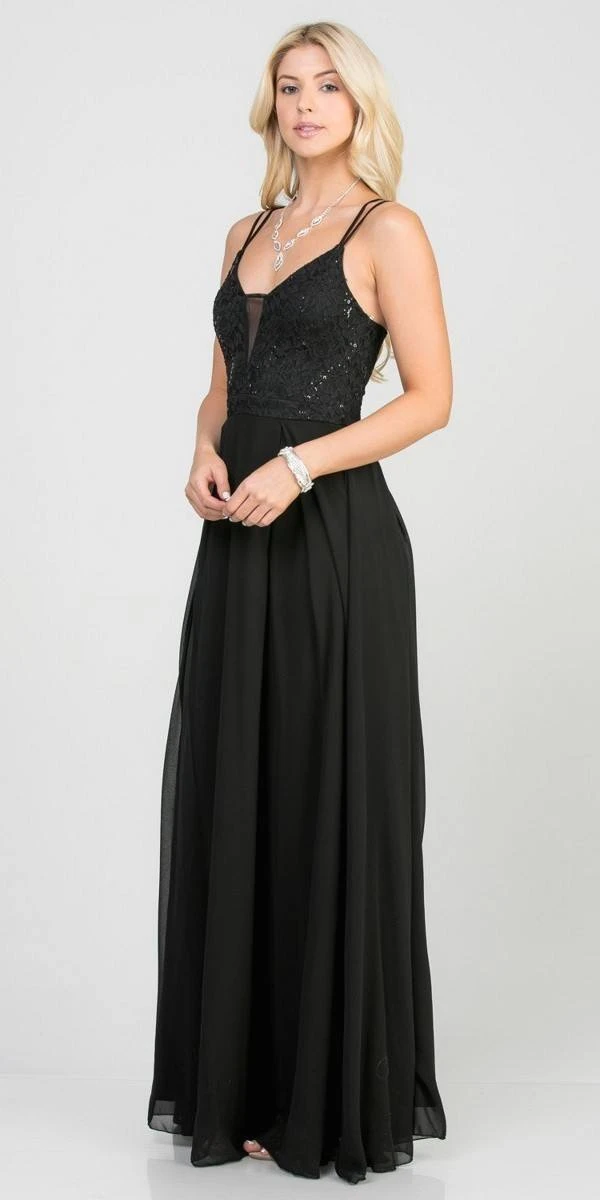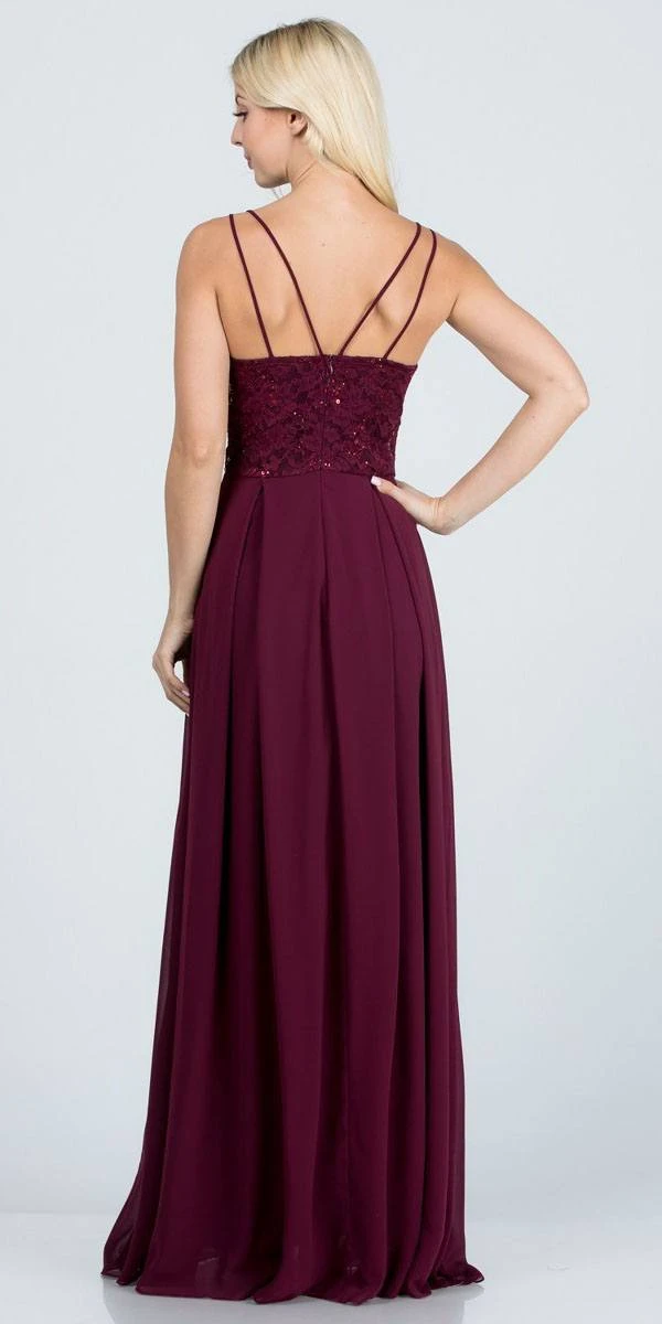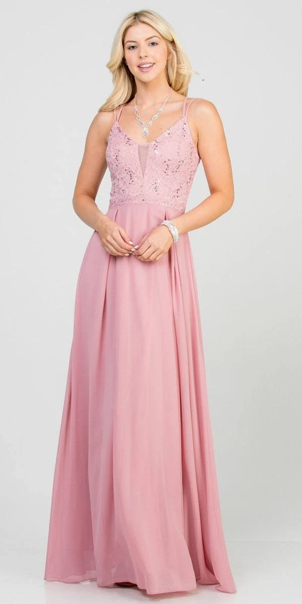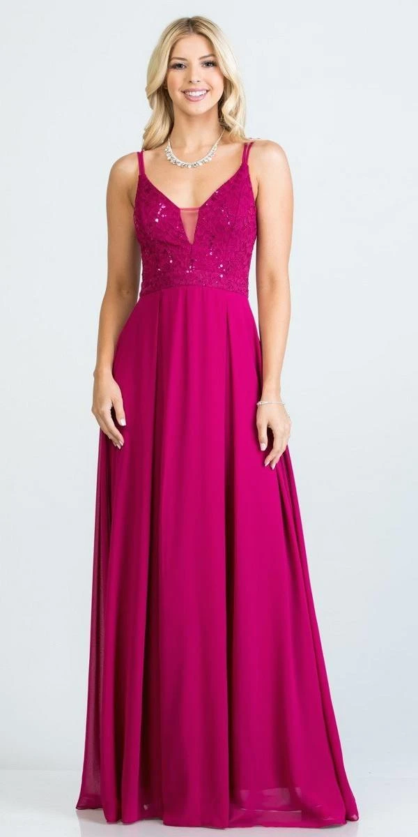 Enjoy the celebration with this A-line silhouette floor-length dress by La Scala 25547. The top is made of lace featuring v-neckline with sheer-inset secured by a double spaghetti straps connected to the back with zipper closure. Paired with pleated flowy chiffon skirt. An ideal outfit for bridesmaids, wedding guests, marine or military ball.