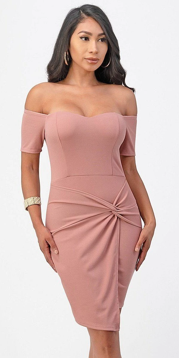 Imagine yourself in this beautiful short semi-formal body con dress by La Scala 25892, which features an off the shoulder short sleeve design and twisted front. An ideal skater dress for parties, damas or cocktail events.