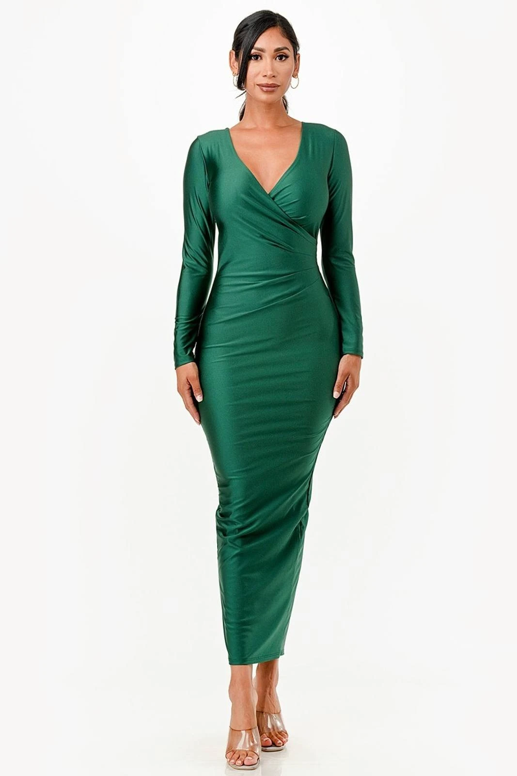 This stunning semi-formal La Scala 26057 maxi dress features shiny tricot material, a fitted silhouette with a V-neckline and long sleeves. It features a back slit add a touch of elegance. Perfect for any special occasion, this dress is sure to catch everyone’s eye.