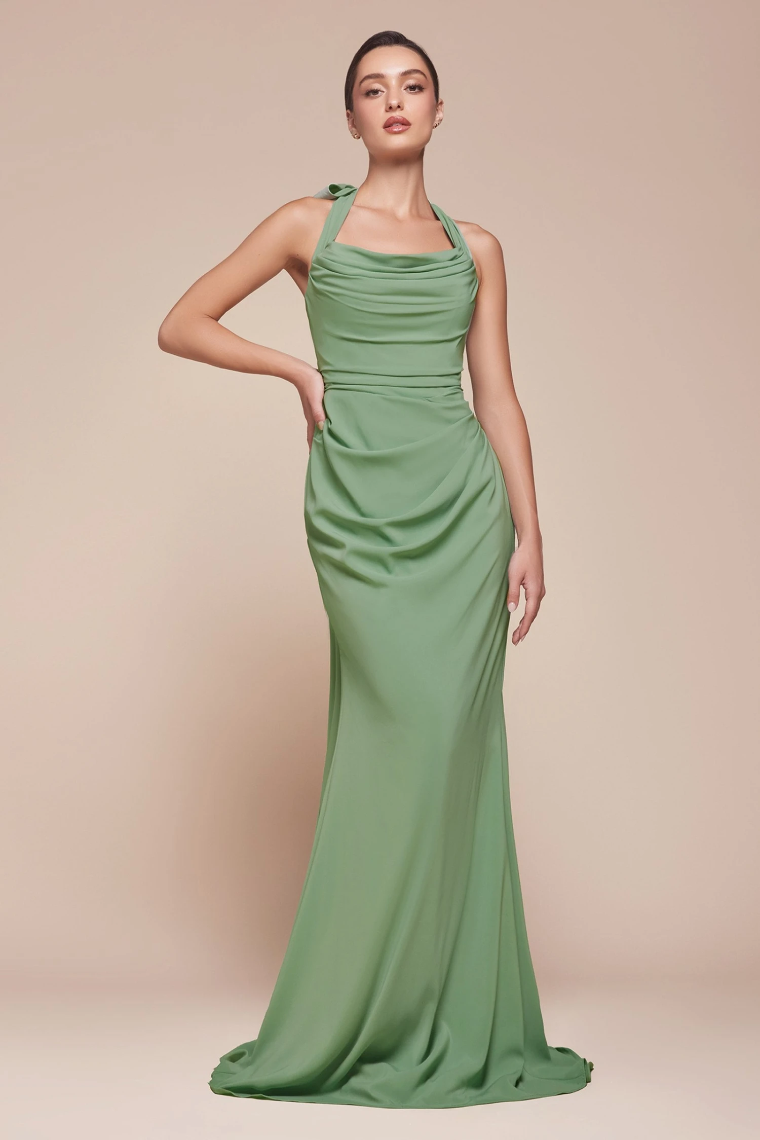 This strapless fitted gown by Ladivine 7433 features a scoop neckline and a gathered bodice, with elegant transitional ties under the arm for a unique touch. Crafted from soft chiffon, the structured bodice provides enhanced support for a flattering silhouette. Perfect for bridesmaids, wedding guests, or black-tie events, this dress exudes sophistication and charm.