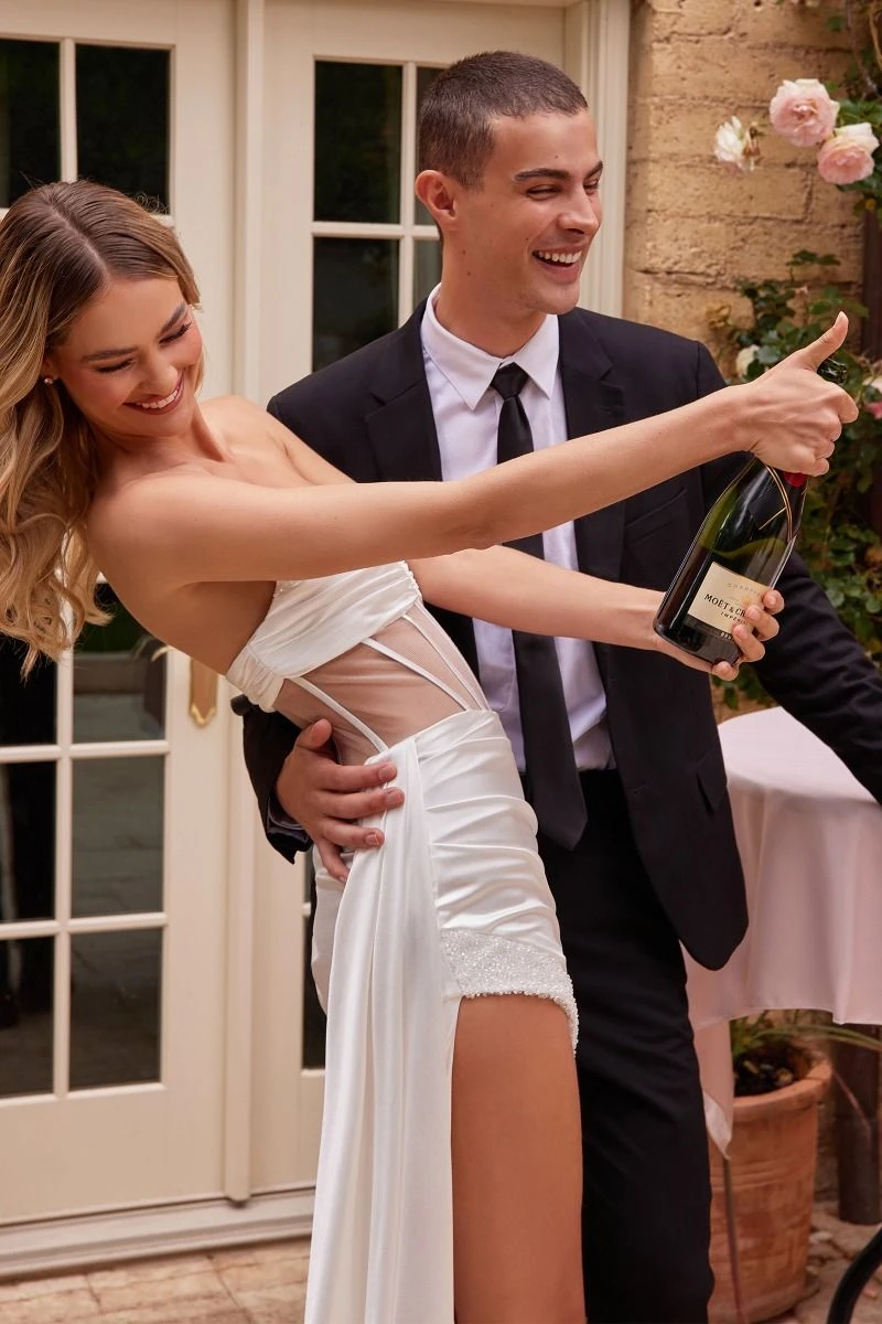 Imagine yourself in this beautiful floor length mermaid evening gown for your next formal event by Ladivine CD269W. Make an entrance in a sexy, strapless corset satin gown! This gown combines glamour with fashion-forward style. The sheer boned corset offers structure and support without compromising on femininity, while the gathered bust edged in crystal beading give off a subtle sparkle. The plunging neckline will make heads turn when you walk into the room, and the gathered waistline with embellished side leg slit will show off your curves in all the right places. And to top it off, the gathered satin side sash adds a unique touch of elegance that is perfect for prom night or any special occasion. An ideal full-length dress for red carpet events, pageant, prom or in any other formal occasions! Â