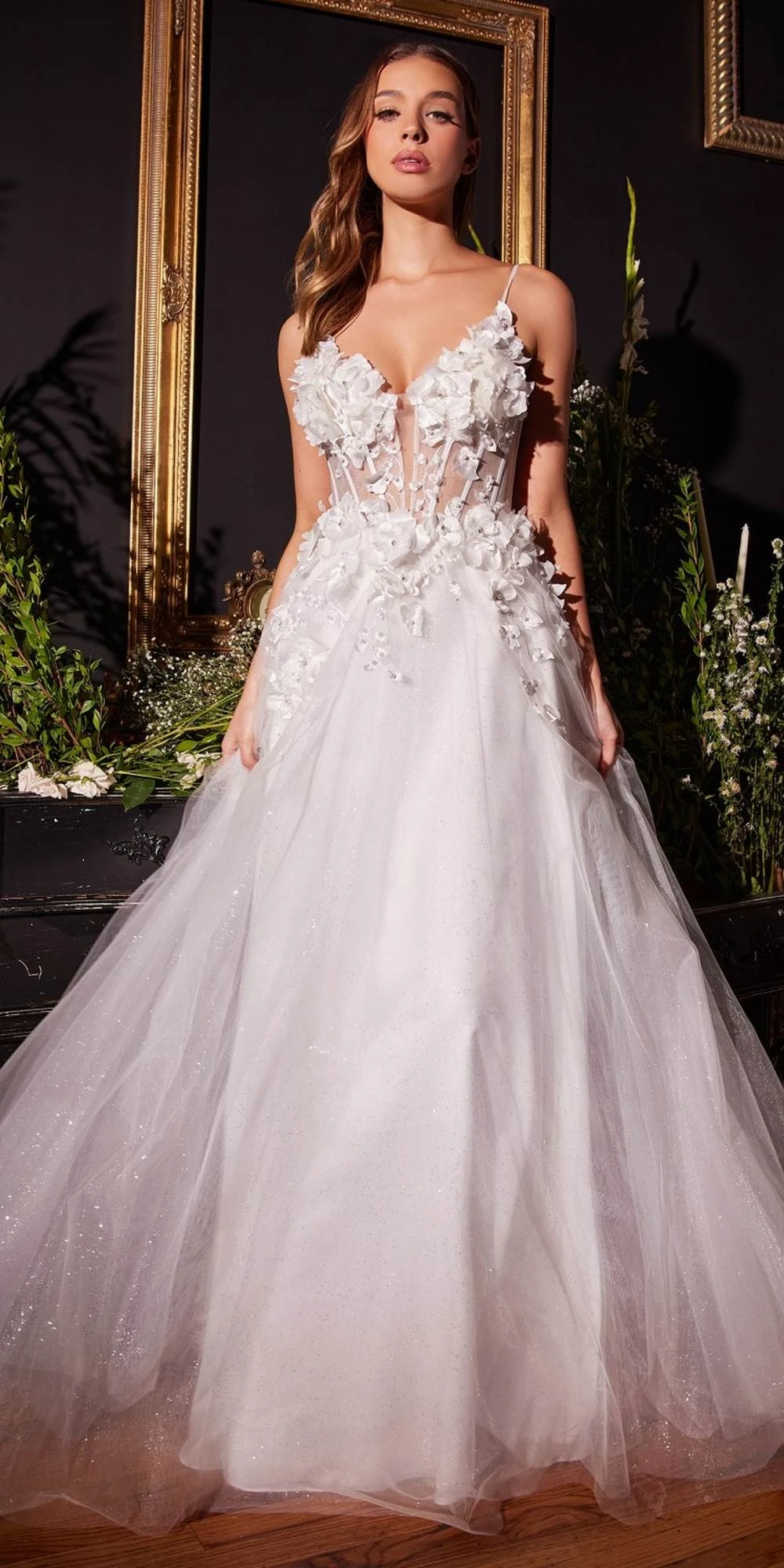 Imagine yourself in this beautiful floor length A-line evening gown for your next formal event by Ladivine CM321W. This long formal wedding dress has a plunging neckline, spaghetti straps, 3D flower applique with rhinestones, corset boned bodice and a corset lace up tie back. An ideal full-length dress for red carpet events, pageant, prom or in any other formal occasions!