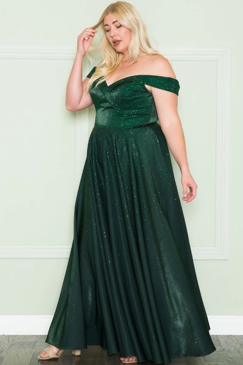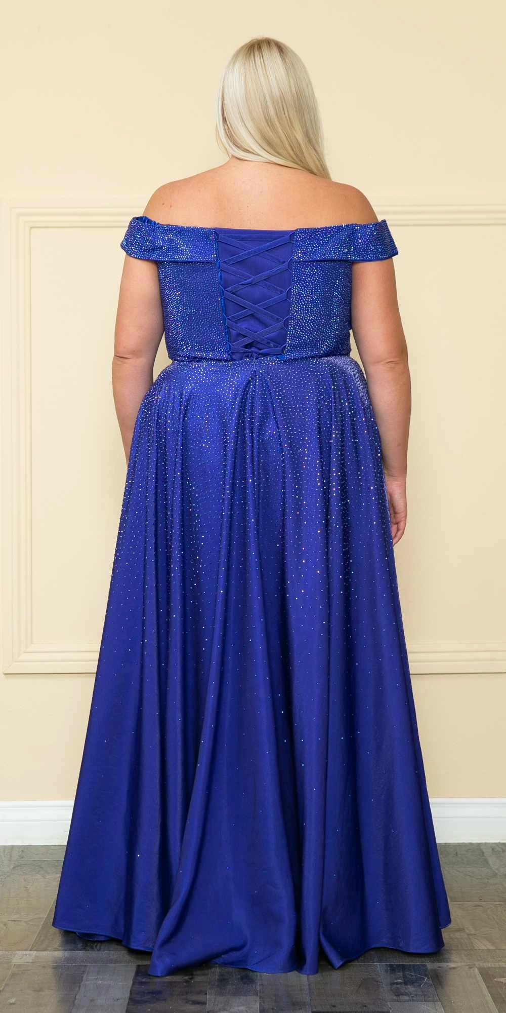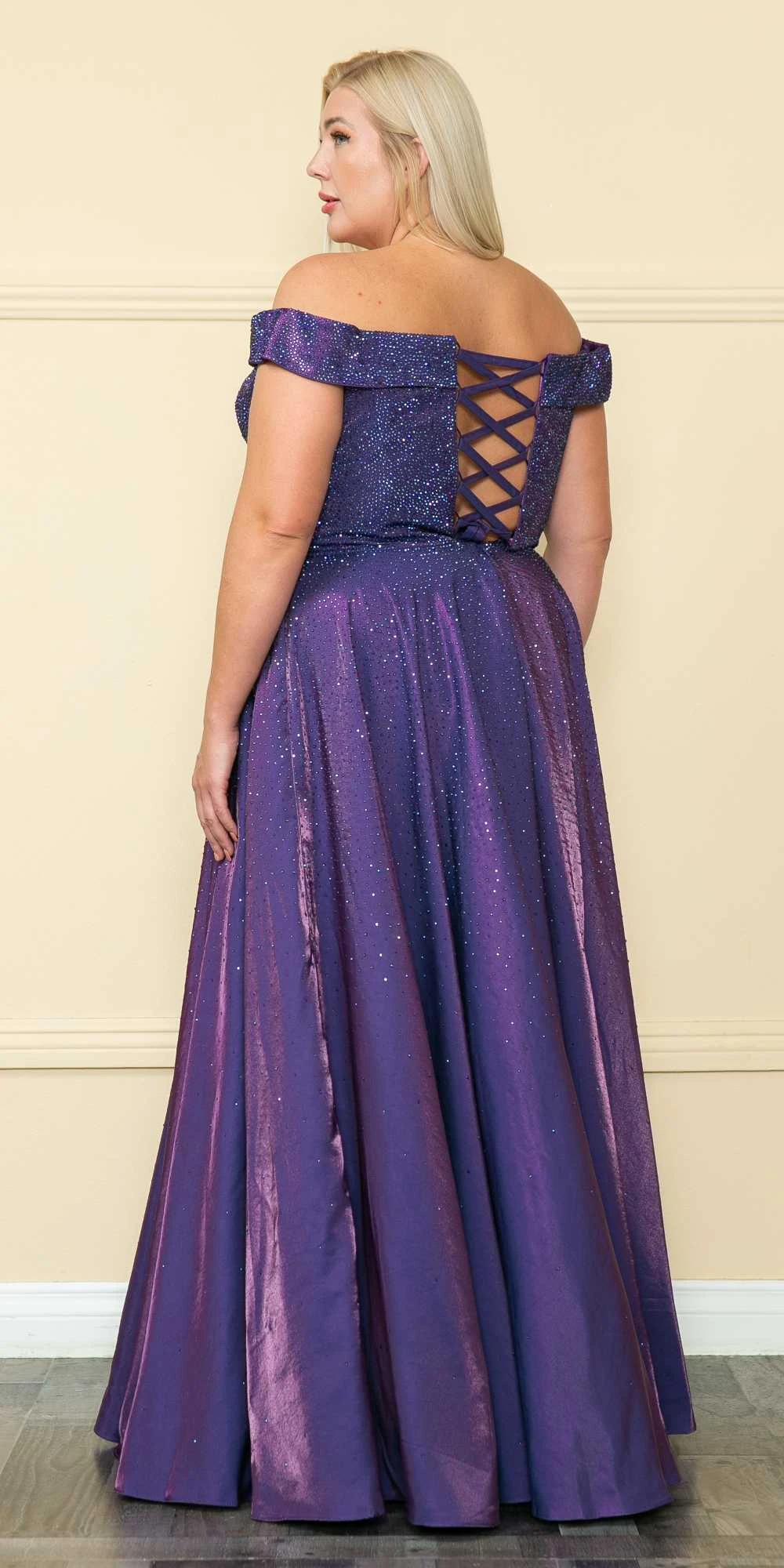 Imagine yourself wearing this beautiful floor length two-tone shimmer plus size dress by Lindas W1112. This long off the shoulder A-line dress features a sweetheart neckline, iridescent rhinestones embellished throughout, side pockets and a corset lace up tie back. An ideal full-length dress for prom, special occasion, party or in any other formal occasions!