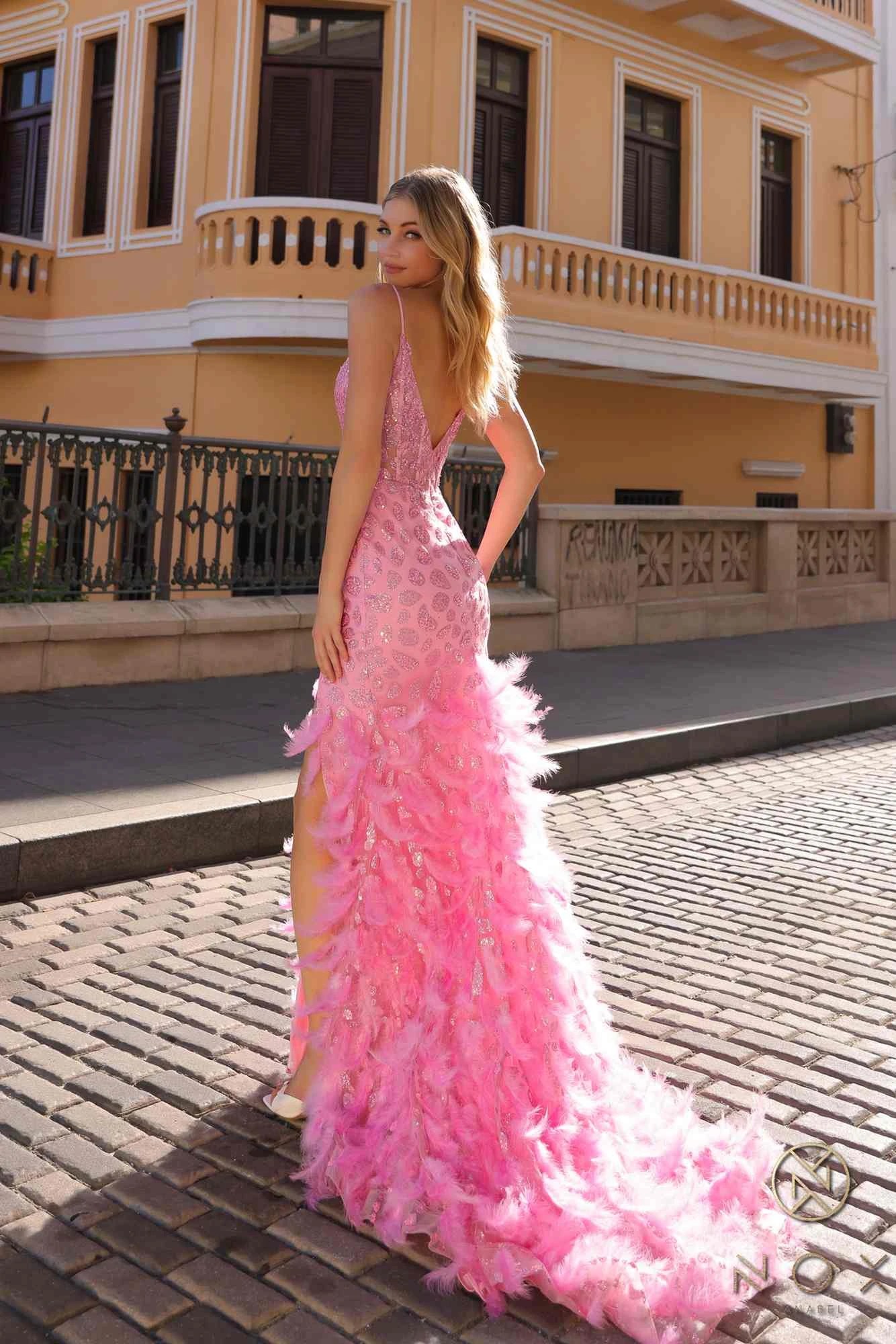 Get ready to turn heads and make a statement in this stunning Nox Anabel C1422 formal dress. The fitted silhouette and glitter embellishments will showcase your figure while the floor length, thin spaghetti straps and V-neckline add a touch of glamour. The corset boned bodice and leg slit add a vision of beauty, and the faux feather skirt and illusion side cut-outs make it truly one-of-a-kind. Don’t miss out on this eye-catching, head-turning dress. An ideal full-length dress for black tie, red carpet, prom or in any other formal occasions!Â