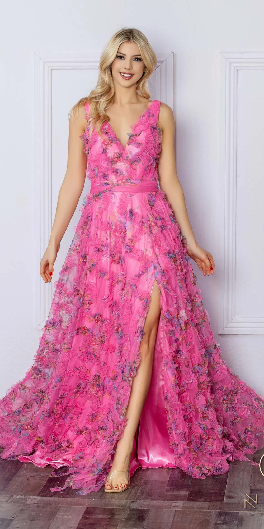 Be the belle of the ball in this Nox Anabel E1445 dress. The stunning floral print and A-line silhouette will make you stand out, while the ruffled skirt and leg slit add a touch of elegance. The flowy floor-length design, V-neckline, wide straps, and refreshing sleeveless cut are perfect for dancing all night, and the open V-back adds an alluring touch. Complete with a sweep train for a formal and sophisticated look. An ideal full-length dress for black tie, red carpet, prom or in any other formal occasions!Â