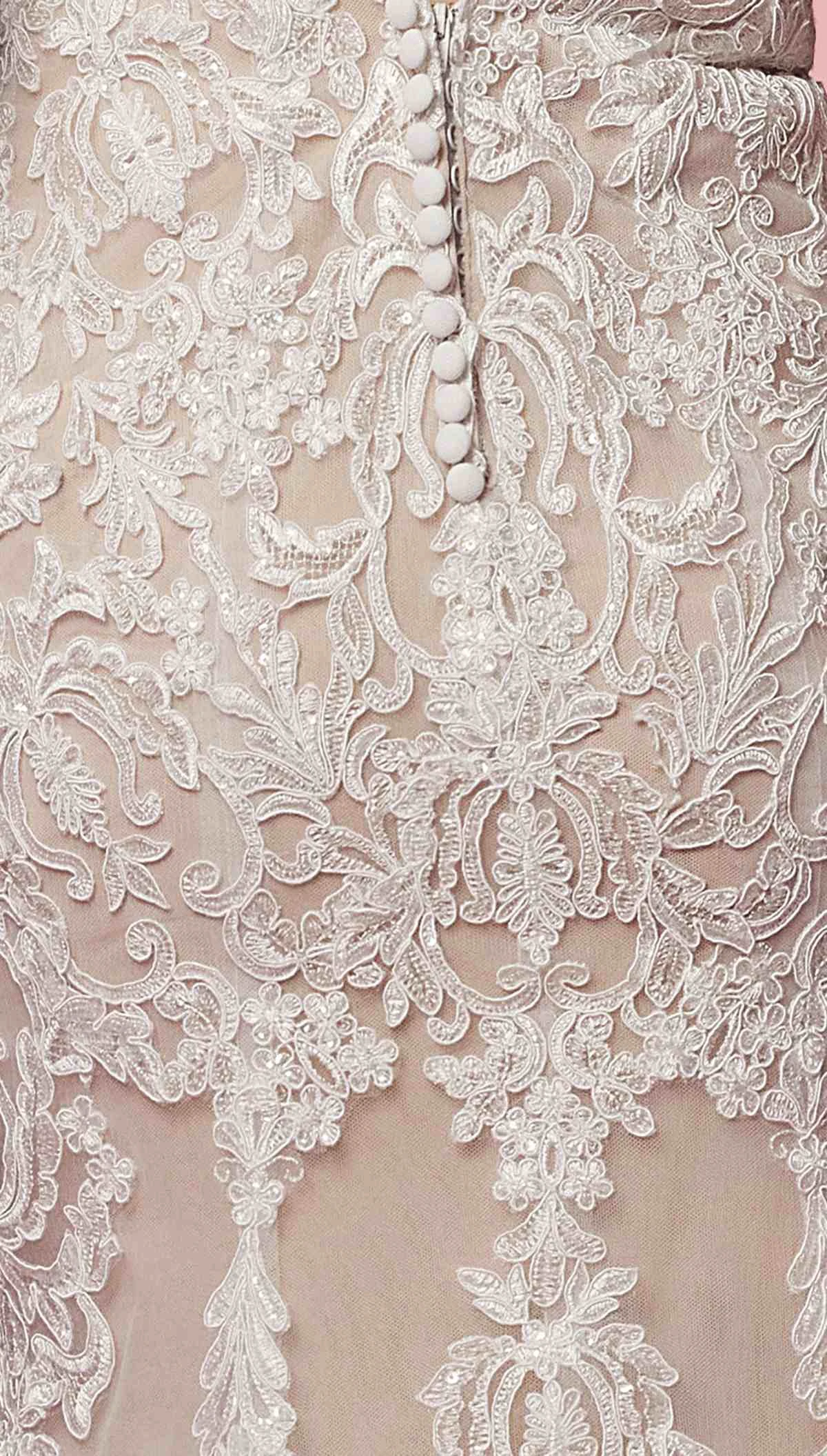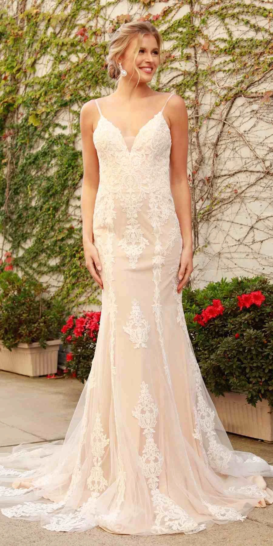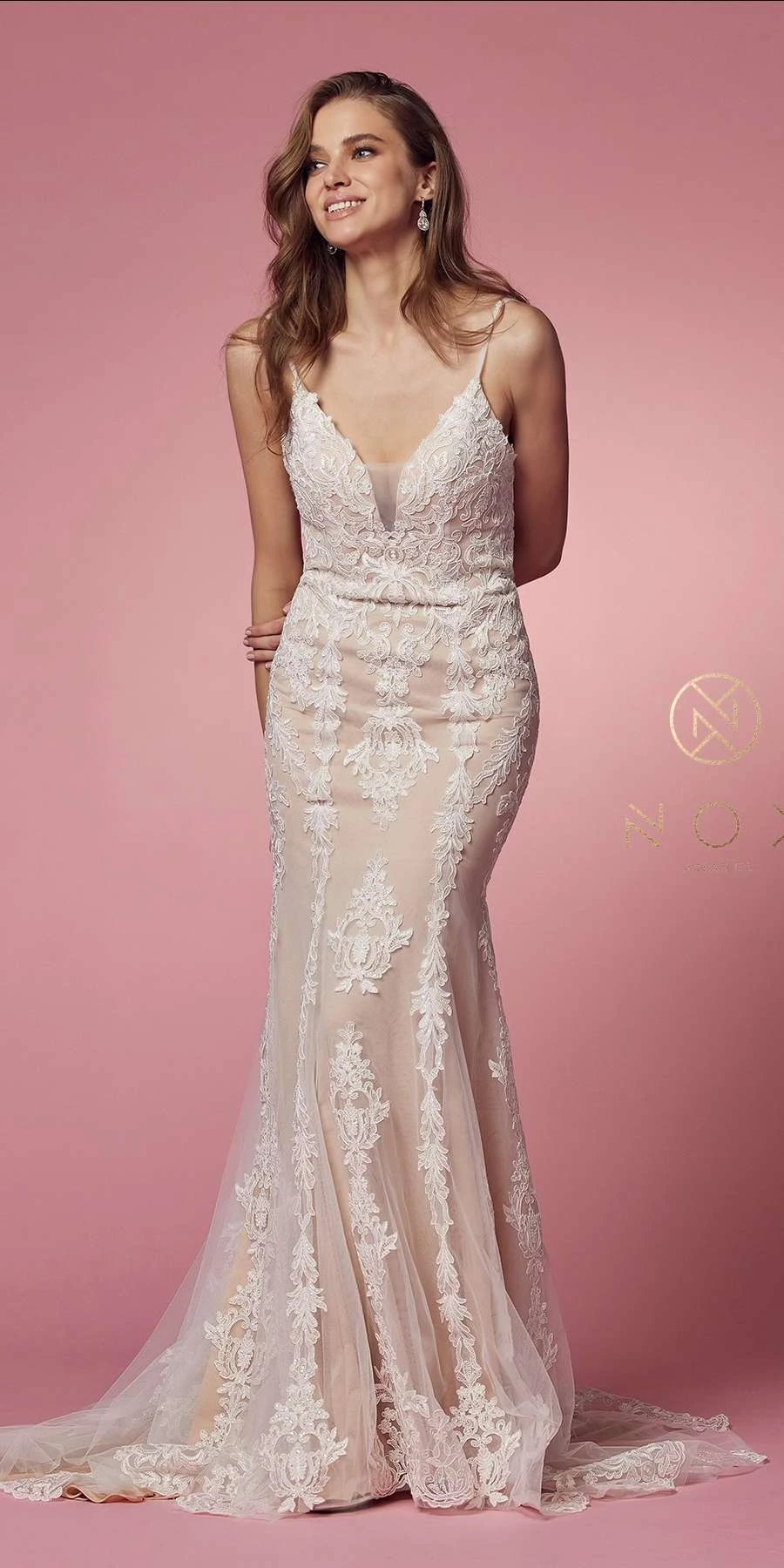 Imagine yourself wearing this beautiful floor length sheath gown for your next formal event. This long sleeveless wedding dress by Nox Anabel H494 in white/nude makes a statement with its incredible detail and dimension. A slightly sheer bodice is layered with organic laces, reaches into a clean V-back detail. The spaghetti straps hold that plunge V-neck, low V-back zipper created by an artful combination of textured glitter tulle and linear detailing. Layers for a weightless shape, as the textured tulle flows out into a semi-sheer cage train over the fitted silhouette. An ideal full length column dress for red carpet events, pageant, wedding or in any other formal occasions!