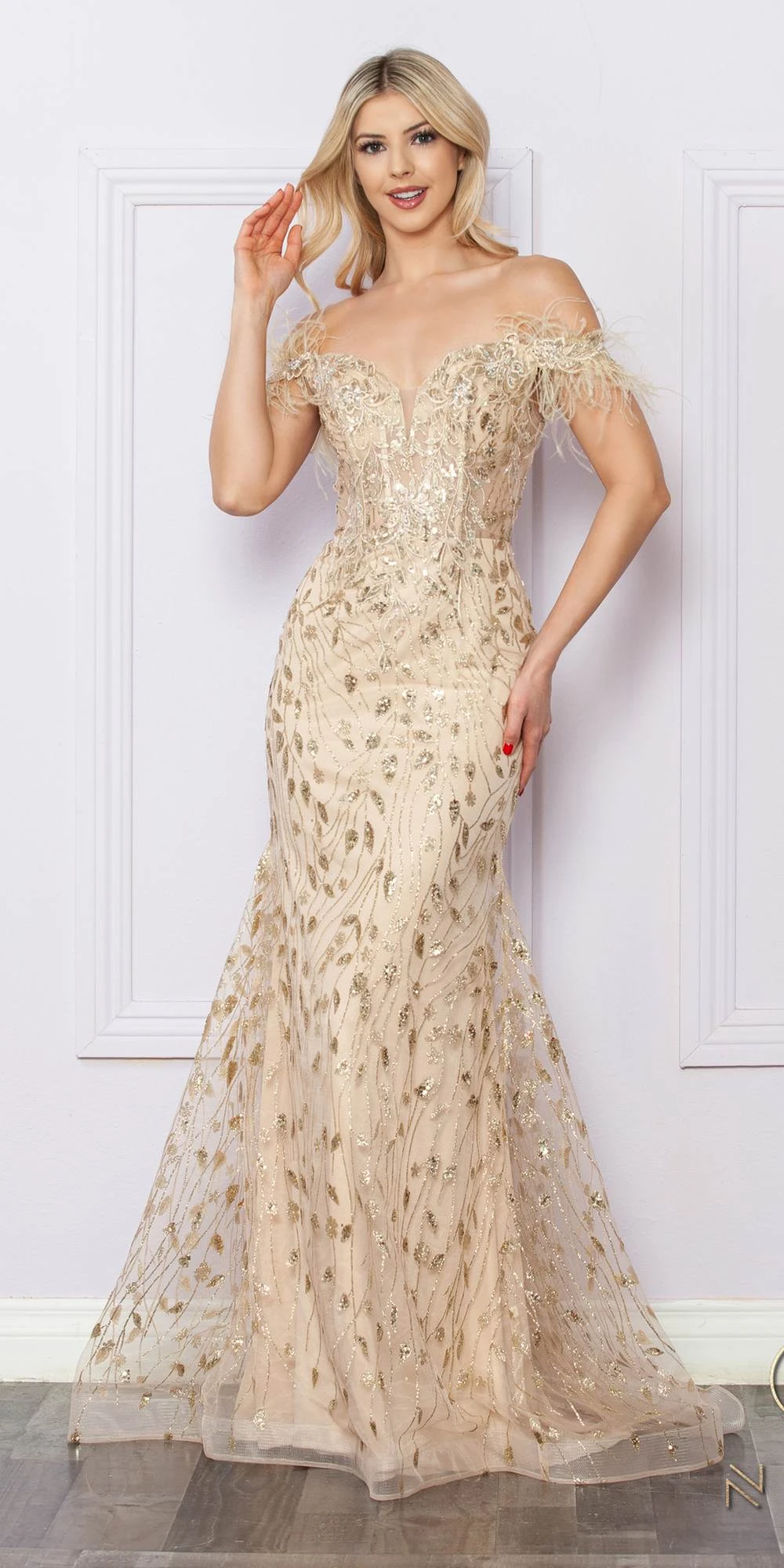Introducing the Nox Anabel L1255, a stunning and glamorous showstopper that will capture attention with its eye-catching embroidered glitter applique. The fitted long, floor-length design features a faux feather off the shoulder strap and illusion sweetheart neckline, complemented by a sweep train and corset boned bodice for a formal and sophisticated look. The trumpet skirt and corset lace-up back make this dress a head-turner and a vision of beauty. An ideal full-length dress for black tie, red carpet, prom or in any other formal occasions!Â