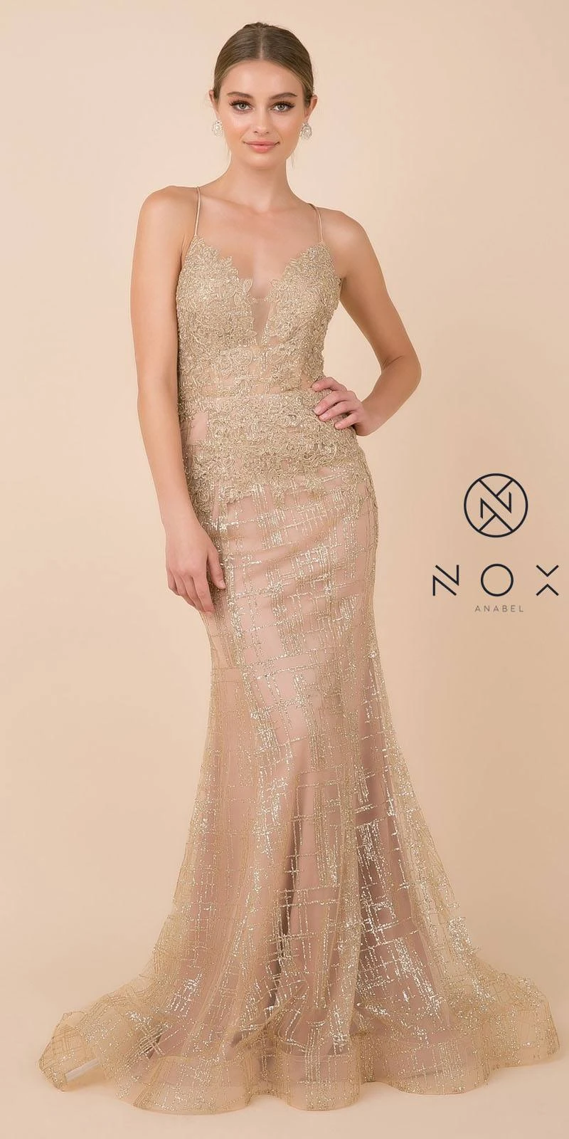 Stand out and shine with this mermaid silhouette floor-length formal dress by Nox Anabel R282-1. This made of glittery tulle dress features an applique decorated bodice with plunging V-neck and crisscross corset open-back. Fully lined with comfy fabric this evening gown is an excellent outfit for pageant, prom, red carpet events, gala or awards night or in any other formal events!
